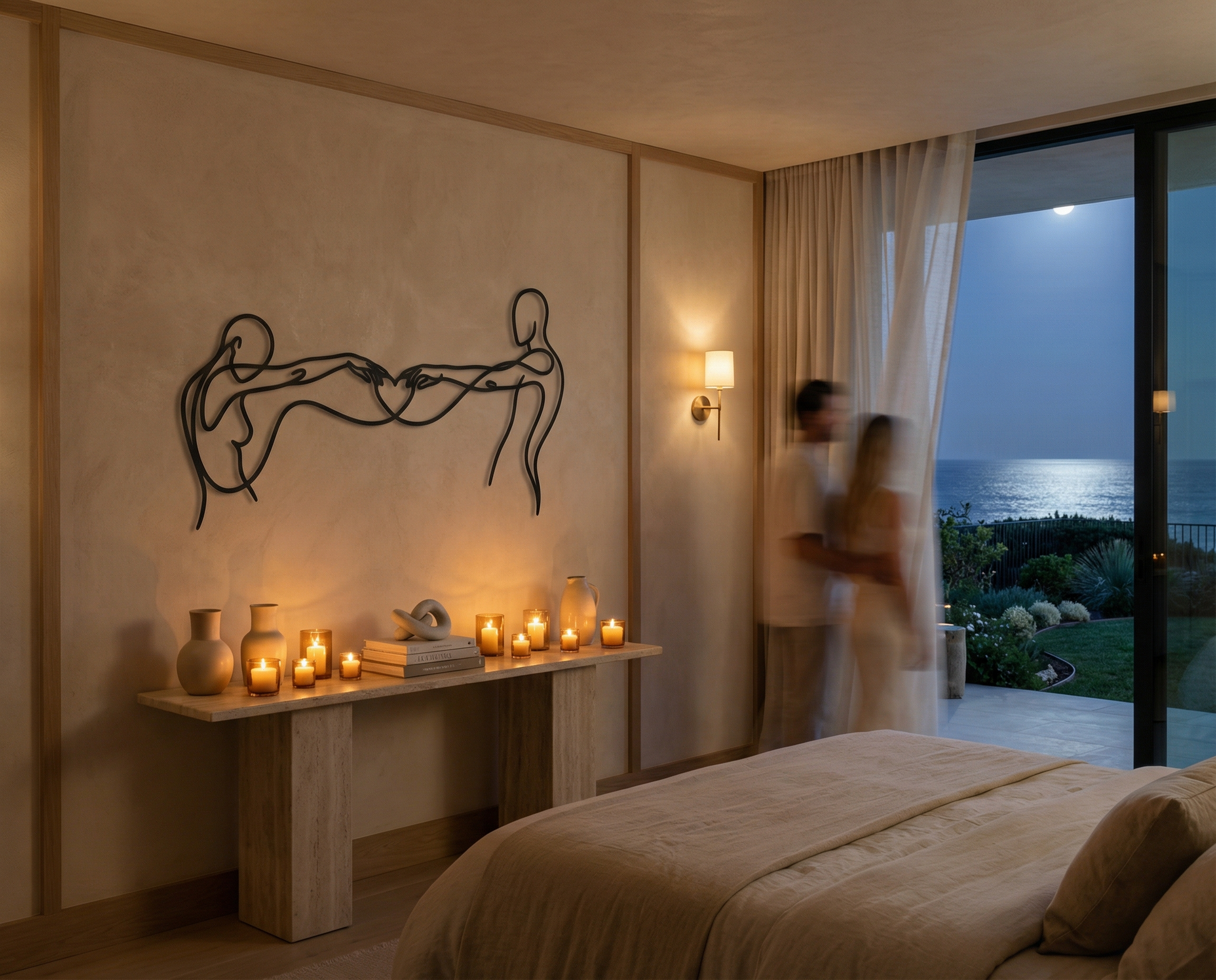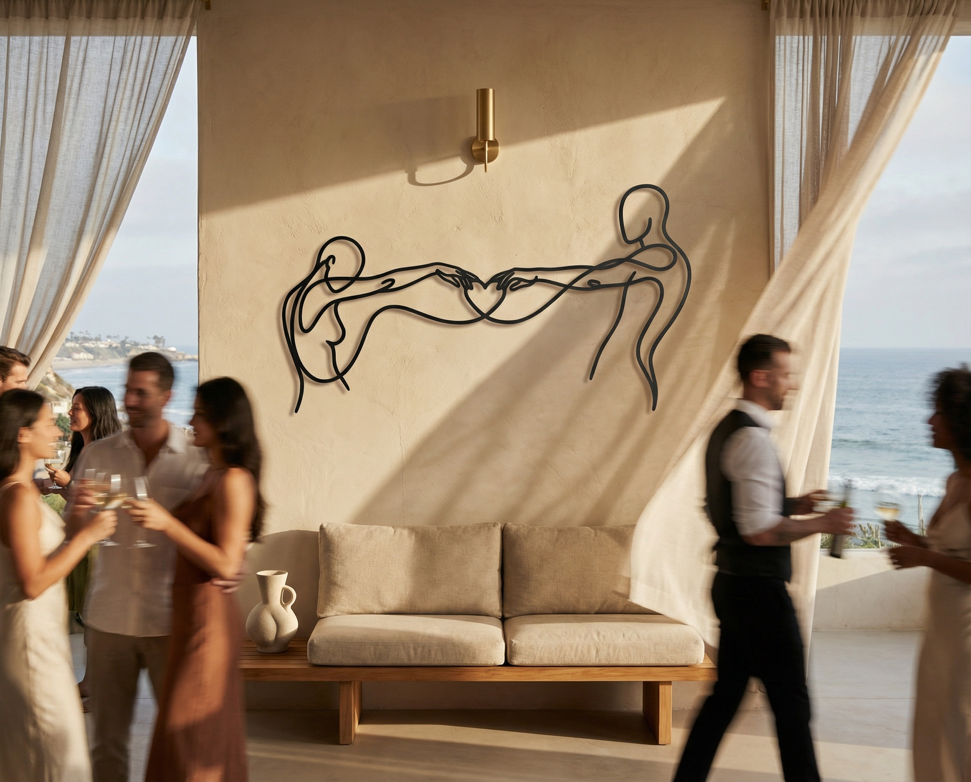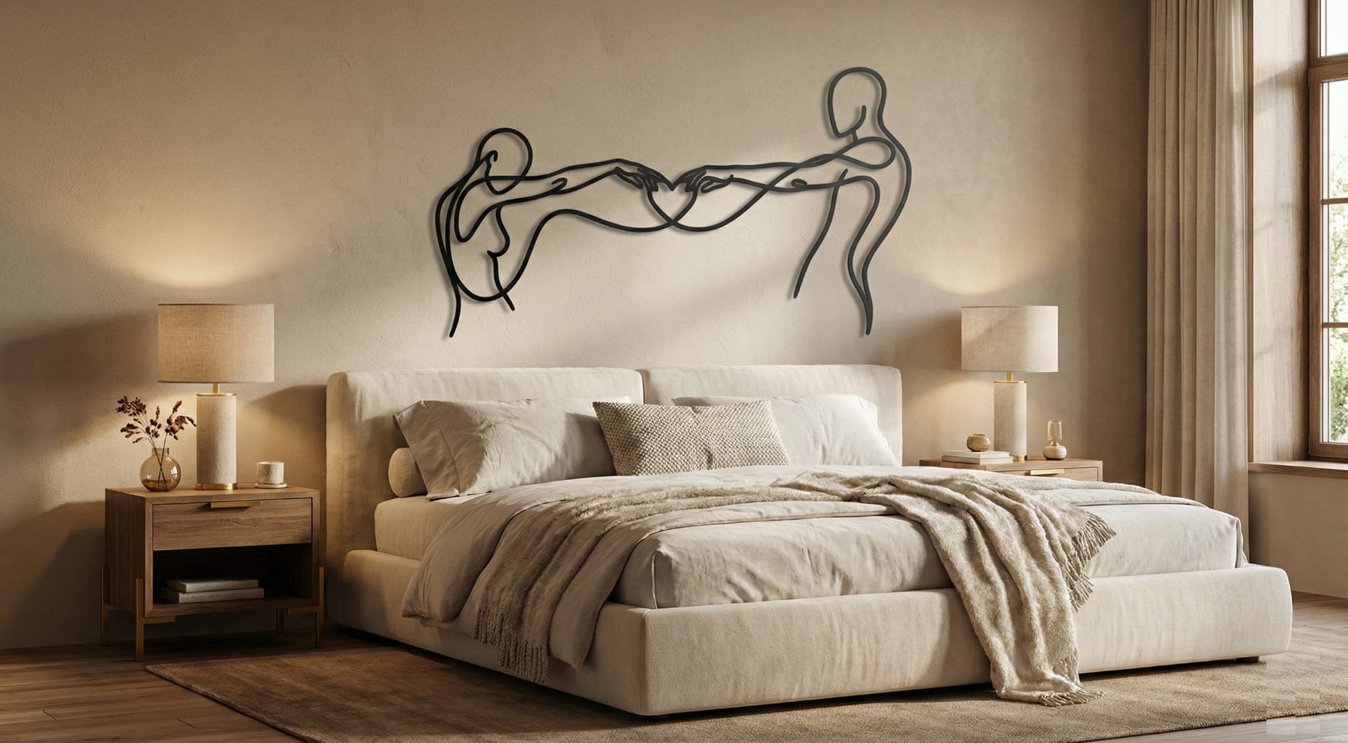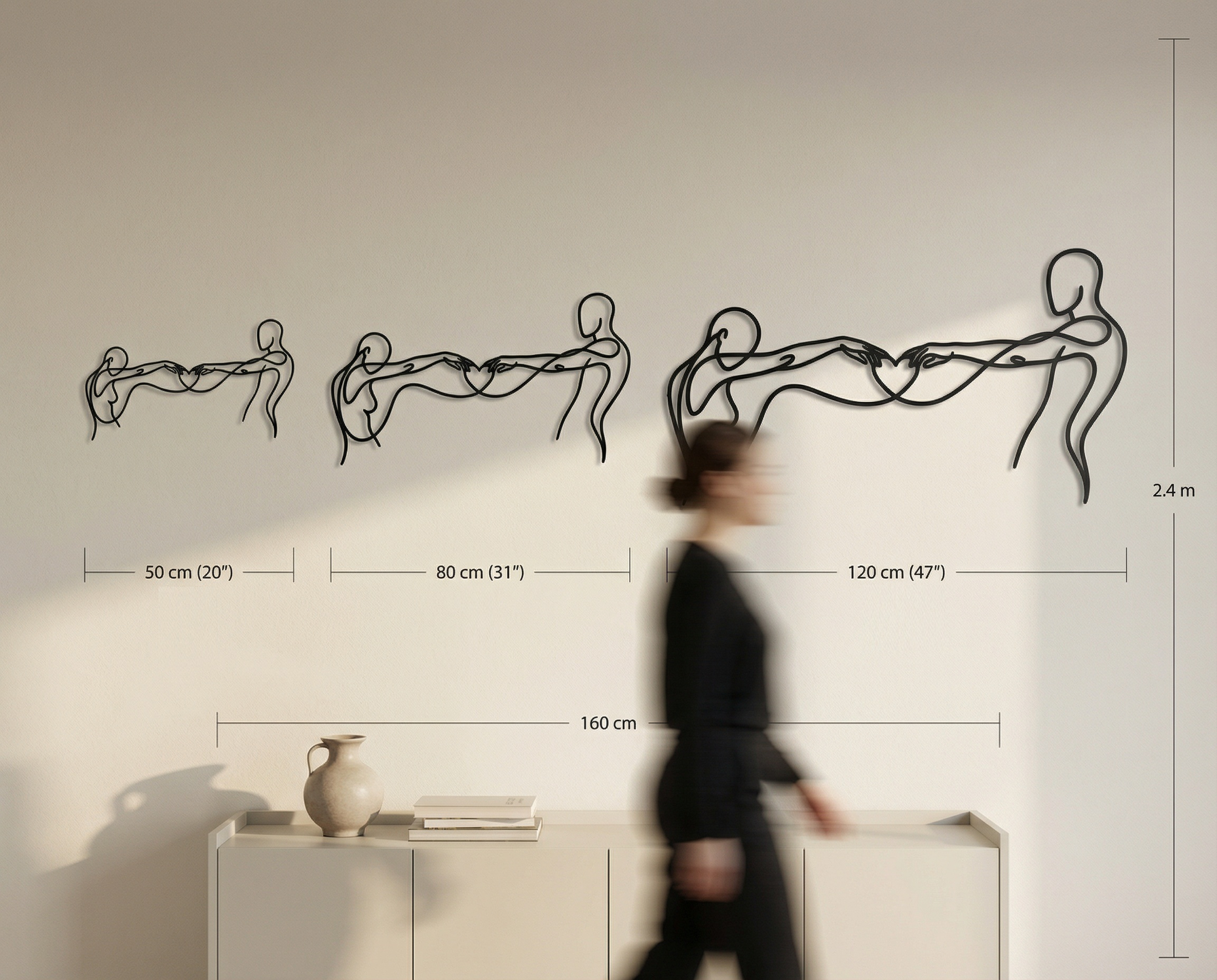 In metal, the artwork is defined by a single flowing contour that stays open and breathable, allowing negative space to carry as much meaning as the line itself. The extended arms create tension and harmony across the width, while the heart-shaped intersection becomes the focal anchor. The floating offset elevates the drawing into a second layer of shadow, reinforcing the overlap and giving the forms a quiet dimensional echo.