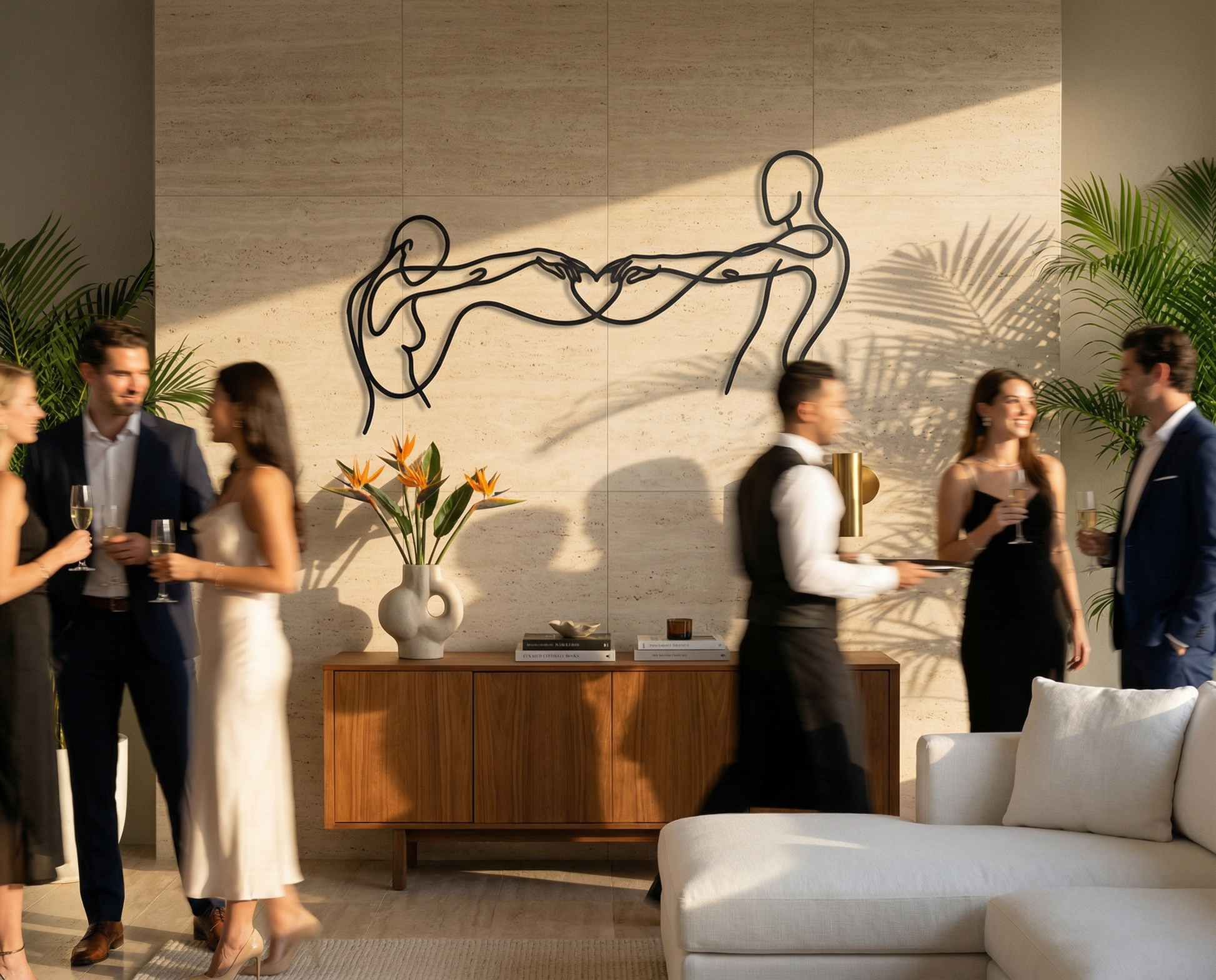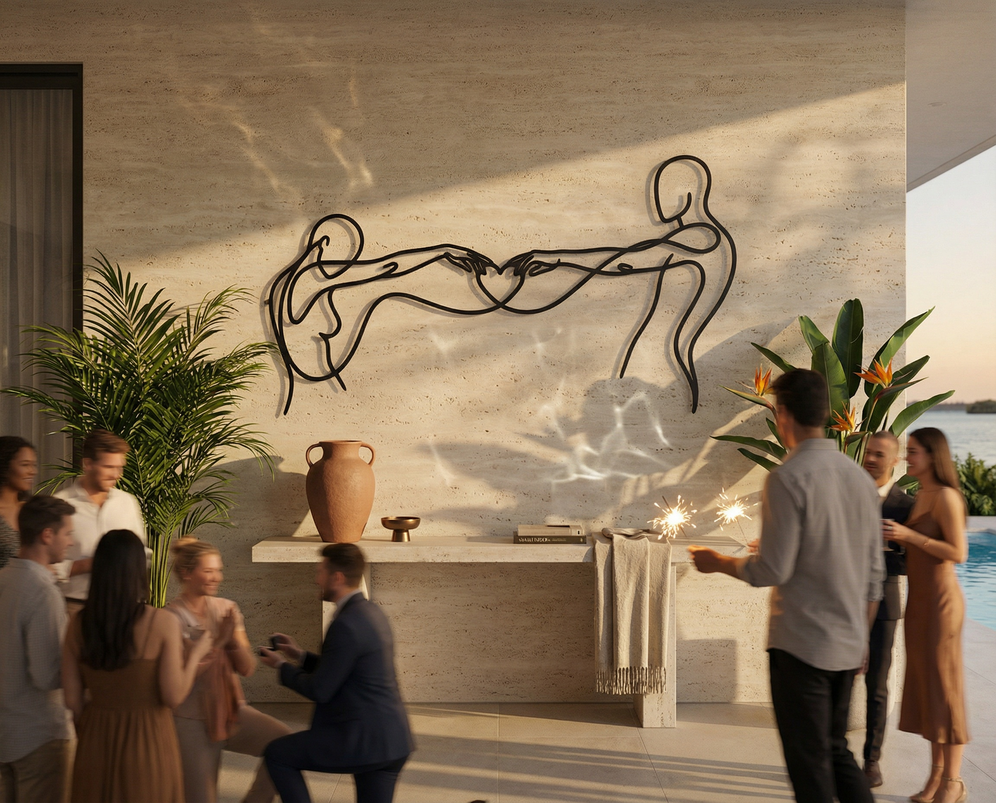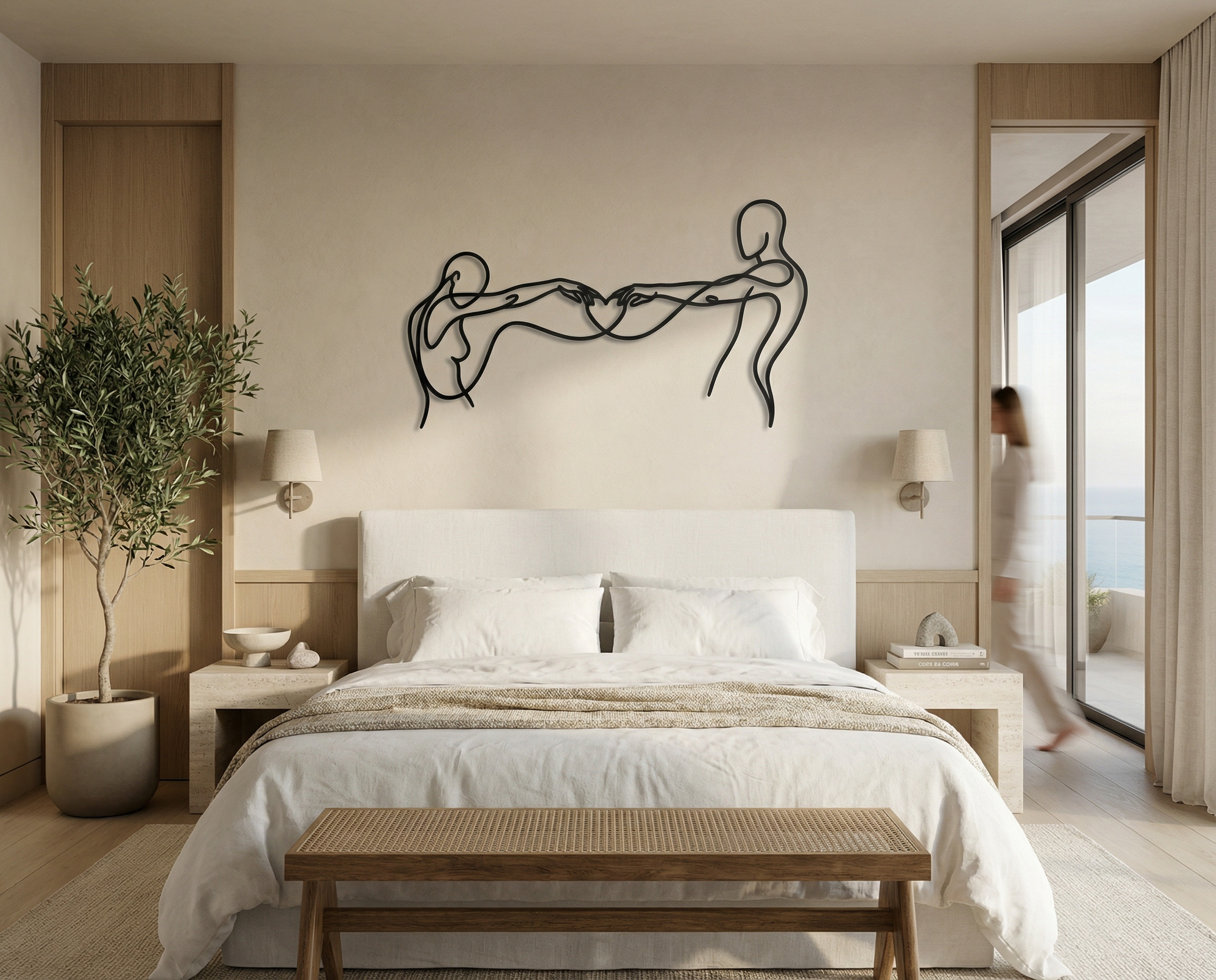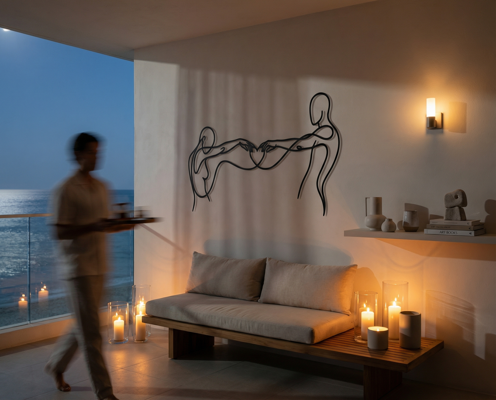 In metal, the artwork is defined by a single flowing contour that stays open and breathable, allowing negative space to carry as much meaning as the line itself. The extended arms create tension and harmony across the width, while the heart-shaped intersection becomes the focal anchor. The floating offset elevates the drawing into a second layer of shadow, reinforcing the overlap and giving the forms a quiet dimensional echo.