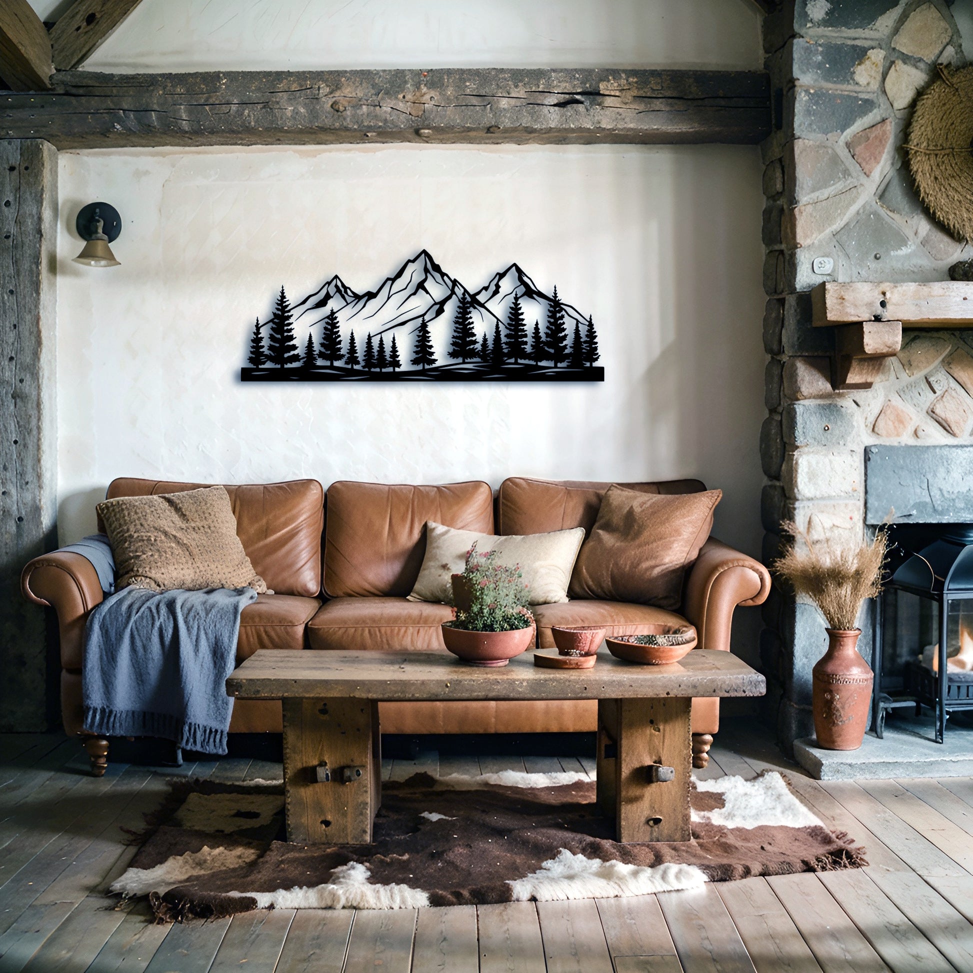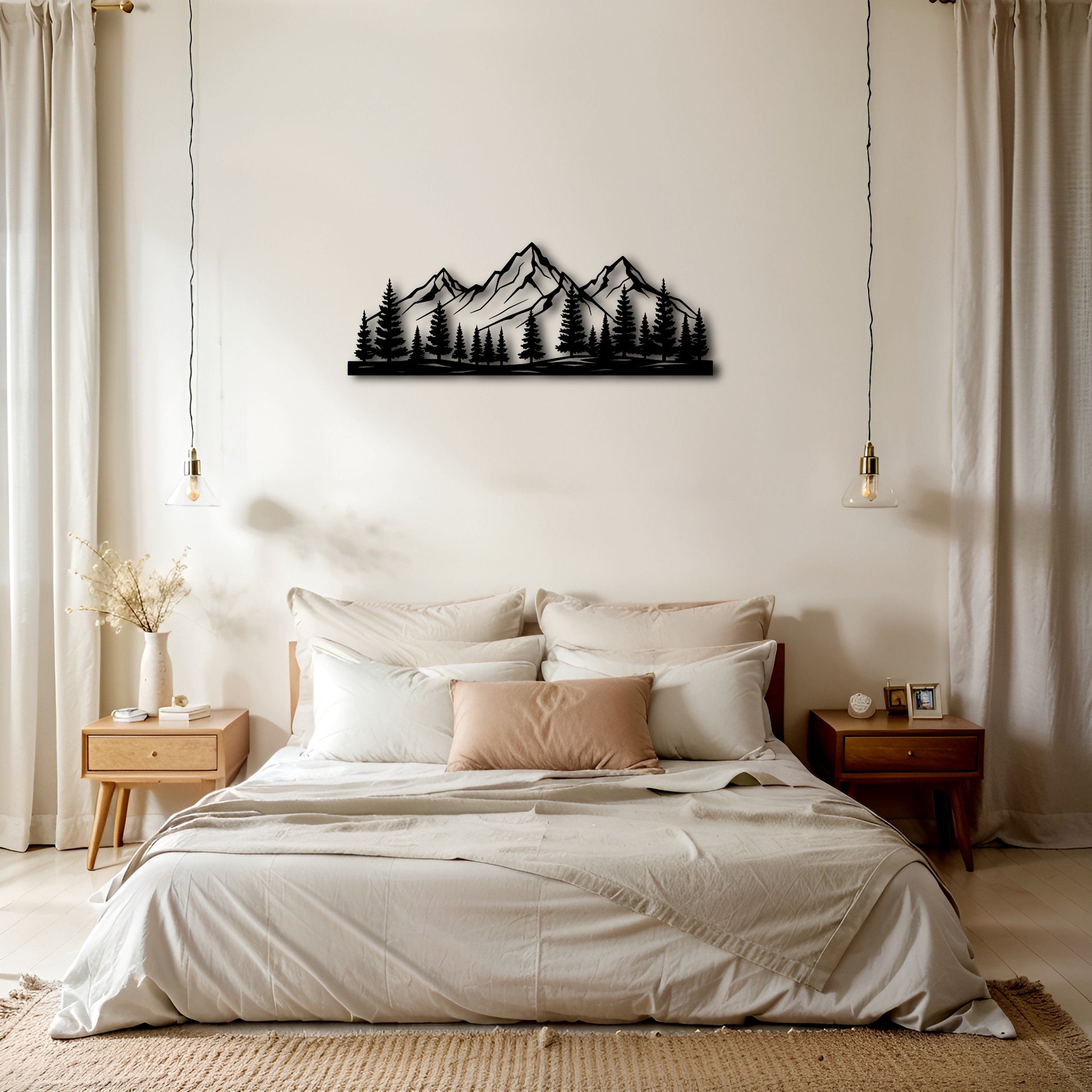 The silhouette reads like a modern frieze: sharp summits carved in clean facets, grounded by a dense line of evergreens. The composition is deliberately wide and restrained—built to sit above a desk, a console, or a headboard like a quiet beam of landscape. In a deep matte powder-coated finish, the cut lines throw crisp, layered shadows that shift softly through the day, turning the wall into a living backdrop without ever becoming busy.