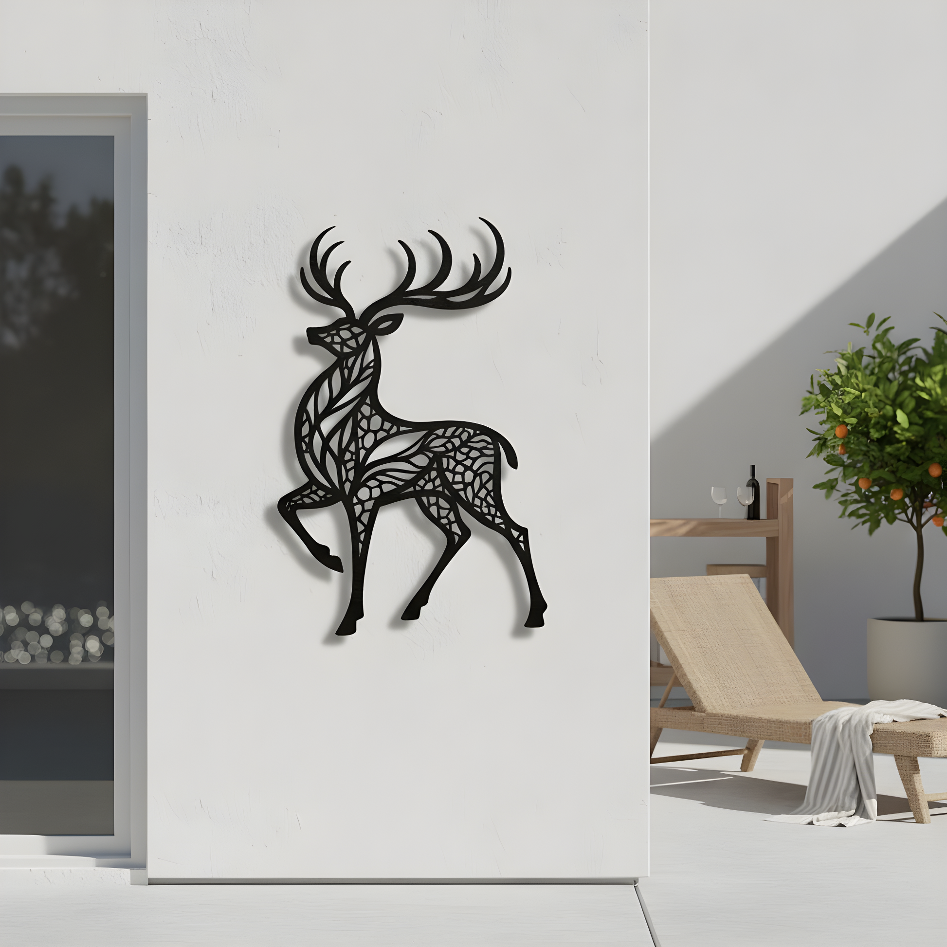 The stag stands in disciplined silhouette, crowned with antlers that read like carved architecture. Inside the body, the surface becomes a living relief: leaf-vein ribbons and stone-mosaic apertures layered with intentional negative space. From a distance it’s a clean totem; up close, the patterning reveals depth and craft. With the floating offset, light slips behind the form and throws a sharp, elevated shadow—turning the wall into the second material.