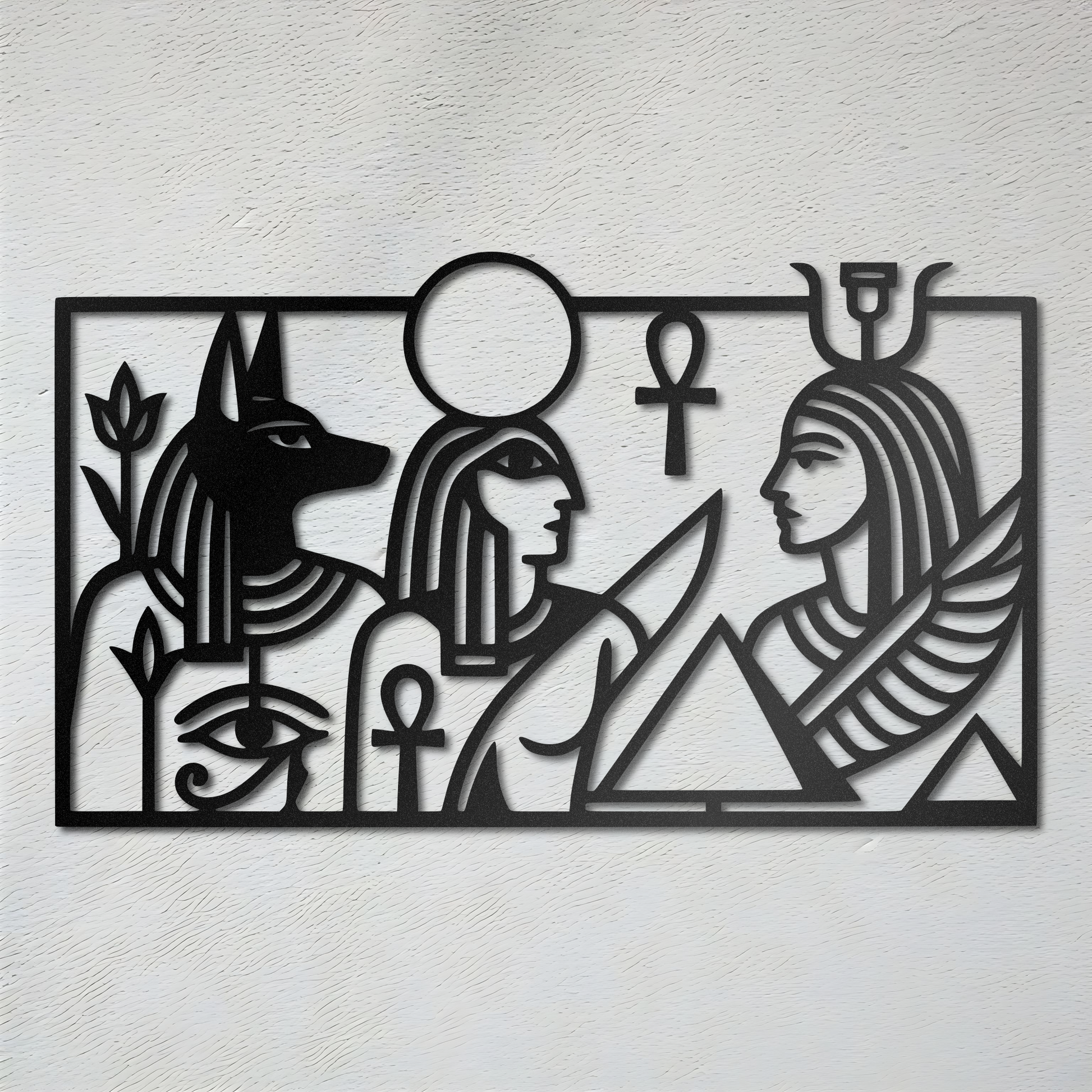 A ceremonial lineup unfolds in profile—Anubis, a crowned royal figure, and a winged counterpart—framed by pyramidal geometry, ankhs, and the watchful Eye of Horus. The composition reads like an architectural relief: bold contour lines, disciplined negative space, and calm intervals that let the wall breathe. As daylight moves, the long horizontal cuts throw a shifting ribbon of shadow—quiet in the morning, razor-defined under hard afternoon light.
