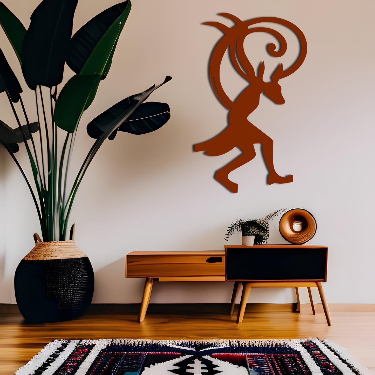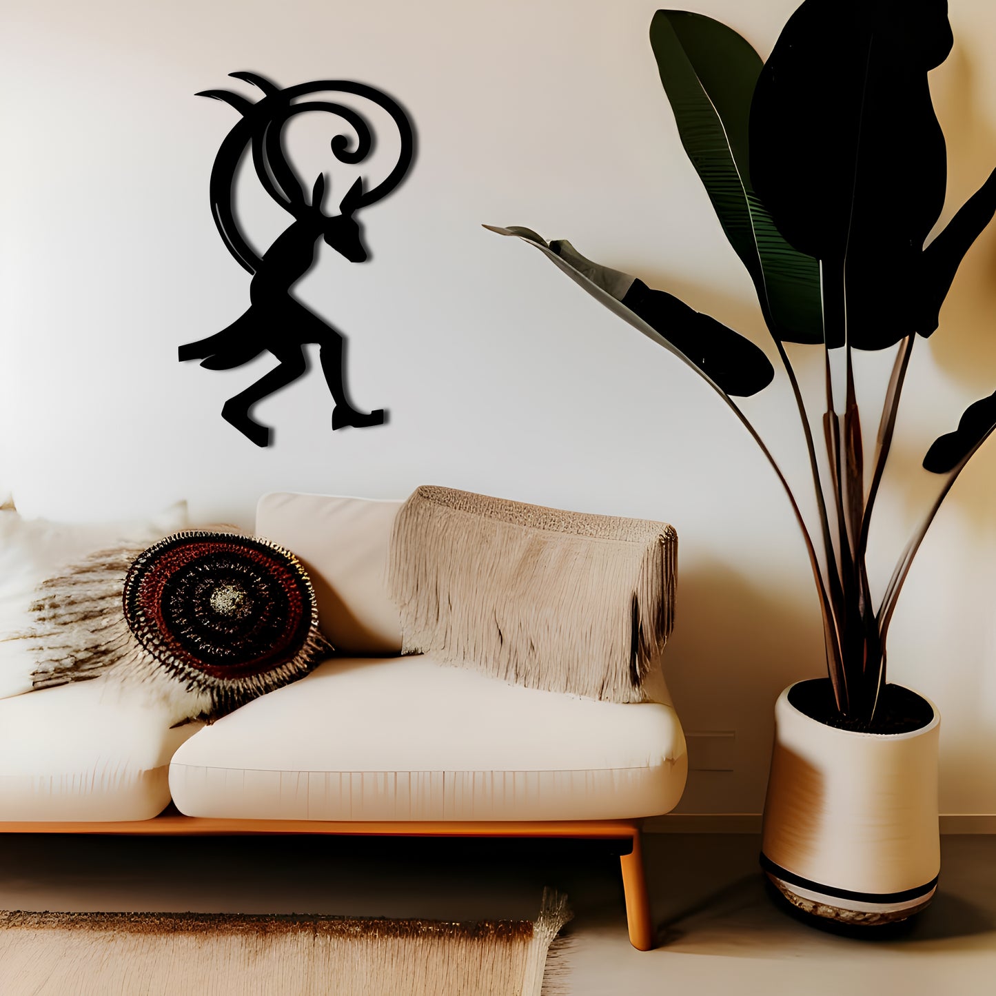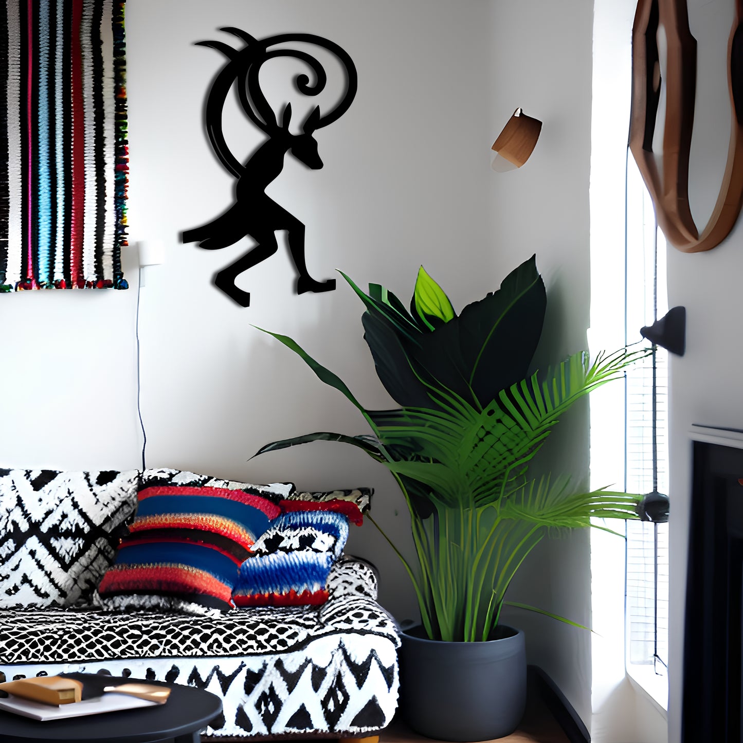 This stunning metal wall art features a stylized silhouette of a hunchback tribal dancer. The design is inspired by tribal dance and culture, making it the perfect addition to any bohemian or eclectic style decor. The intricate details and high-quality metal construction make this piece a standout addition to any room.