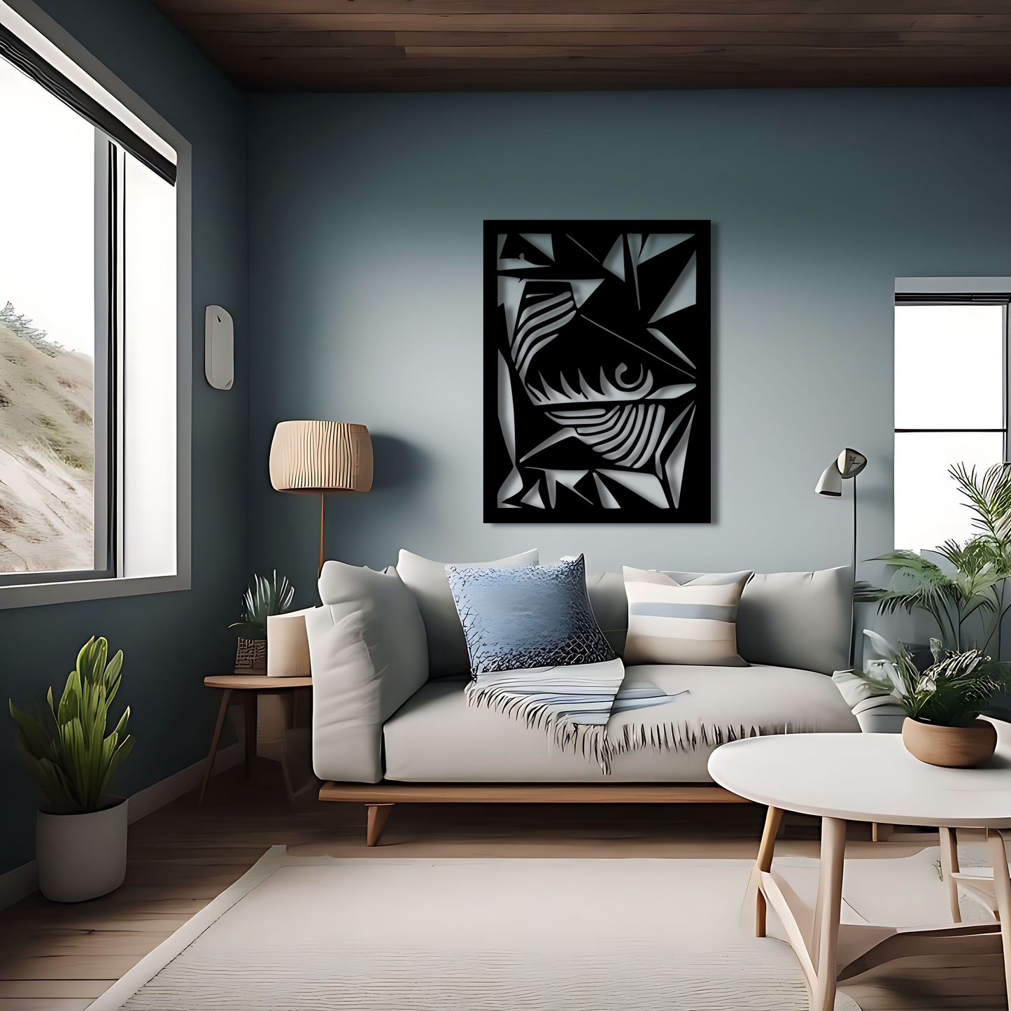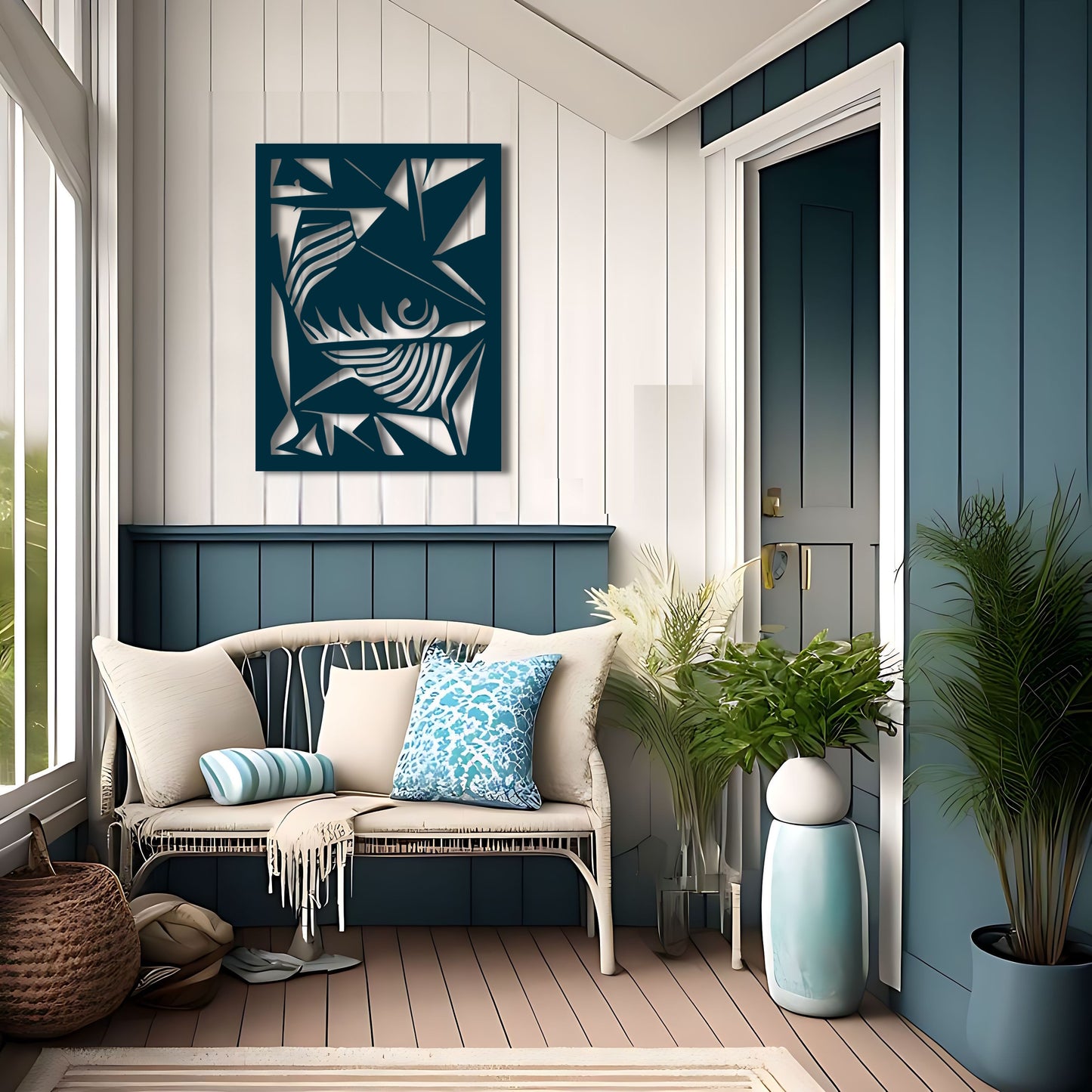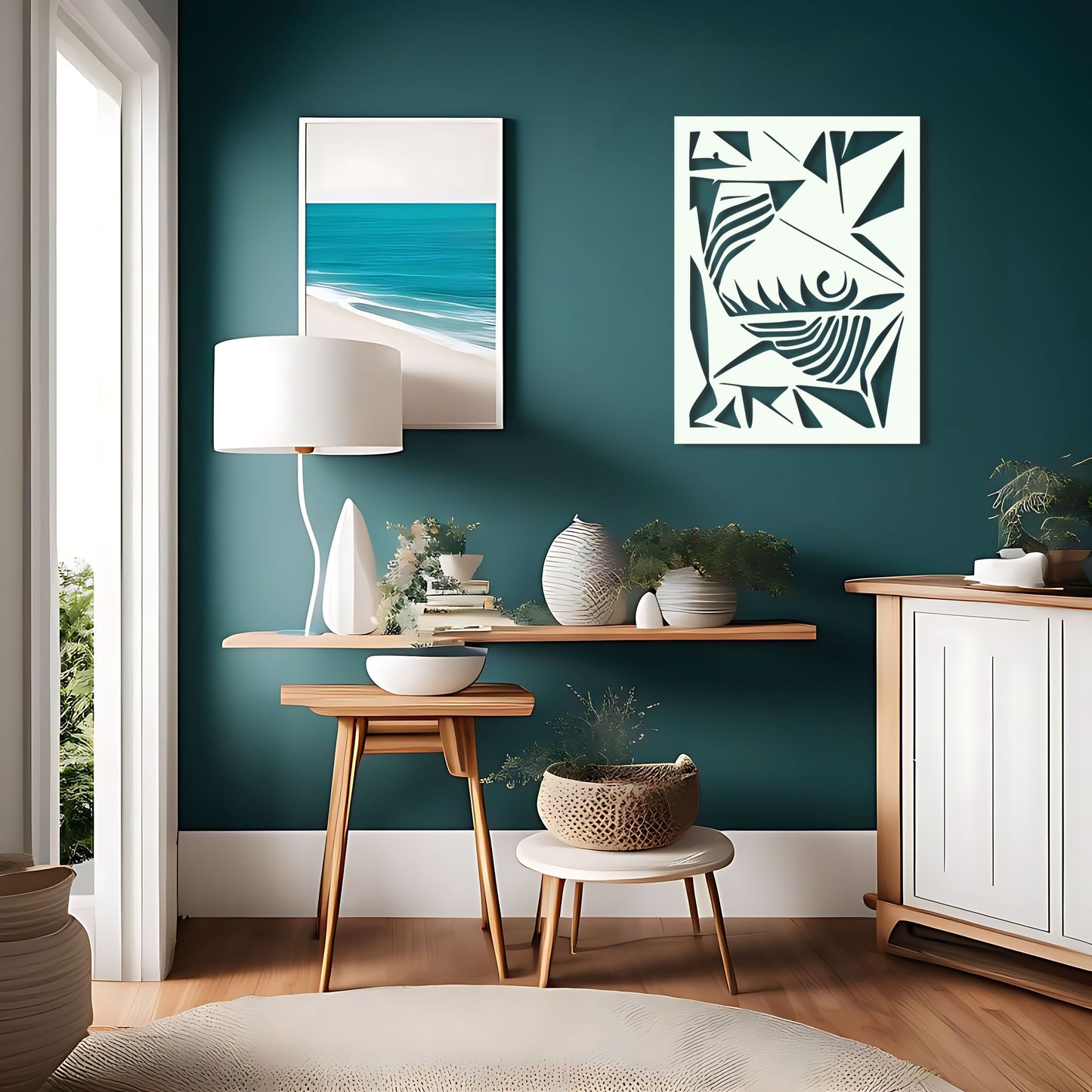 Add a bold statement to your home decor with this abstract shark wall art, inspired by the famous artist MC Escher. The bold line art and rectangle borders create a striking contrast, while the abstract concept adds a touch of modernity. This unique piece is perfect for a father's day gift, or as a present for ocean and marine life lovers, fishing enthusiasts, and beach or lake house owners. The metal artwork is suitable for both indoor and outdoor use, and is available in custom color options to match any decor.