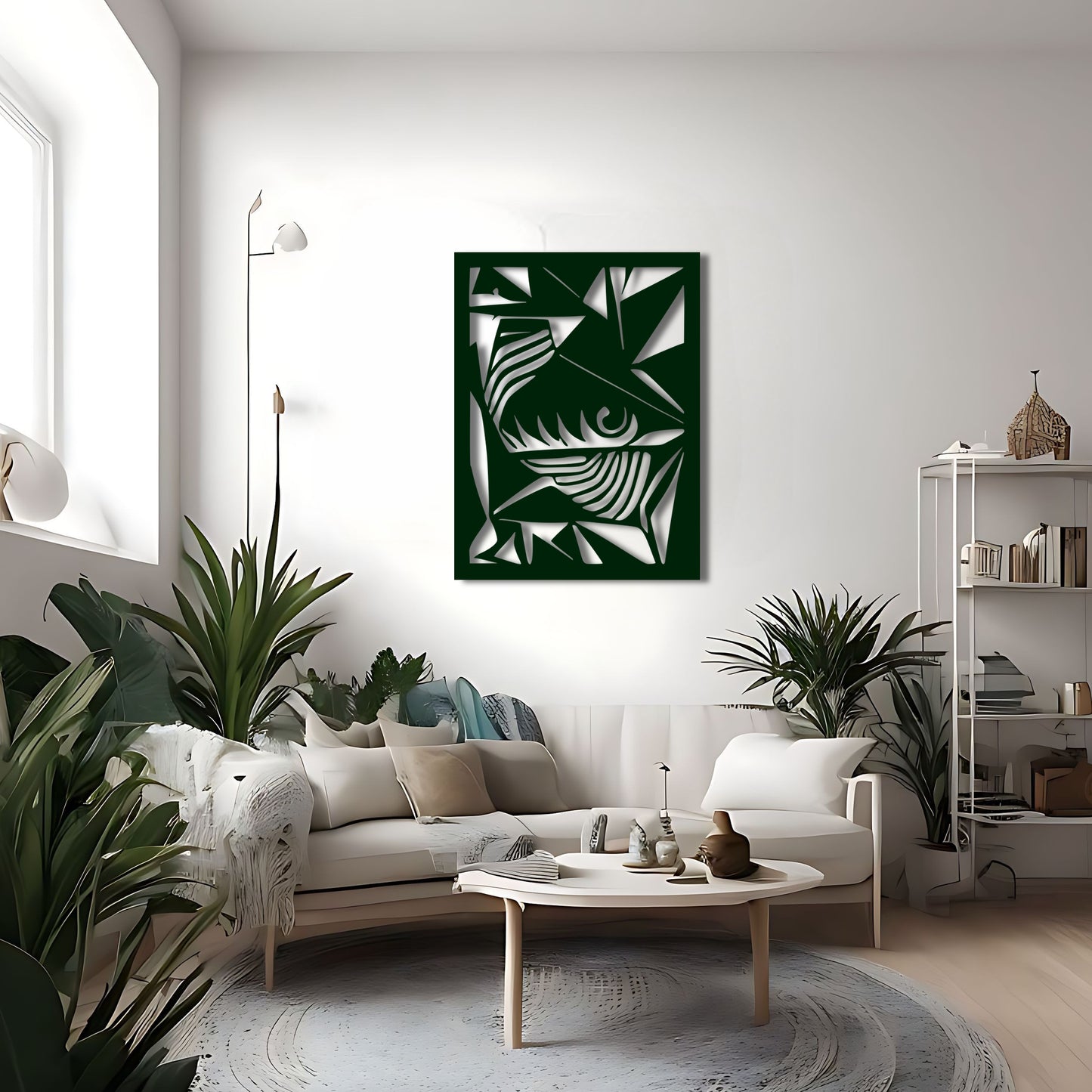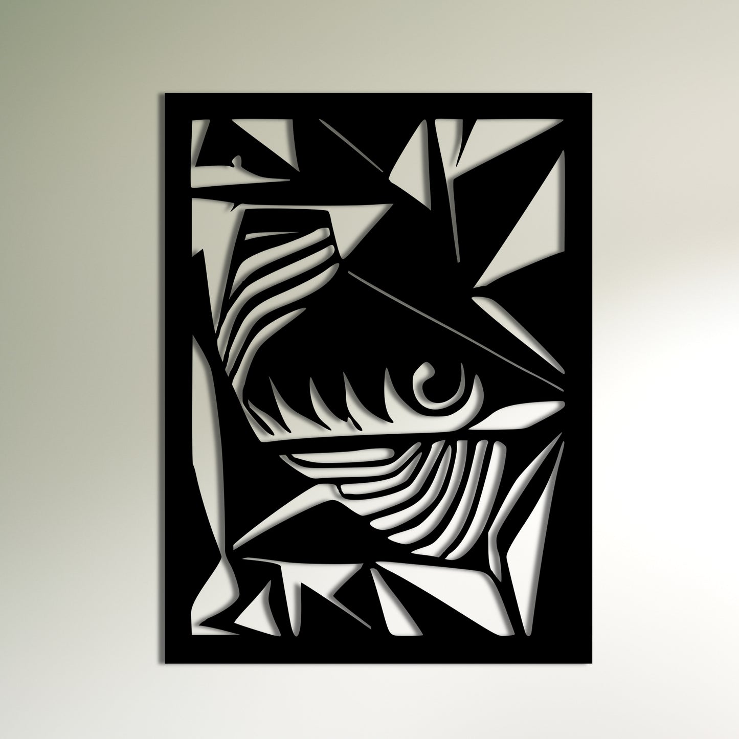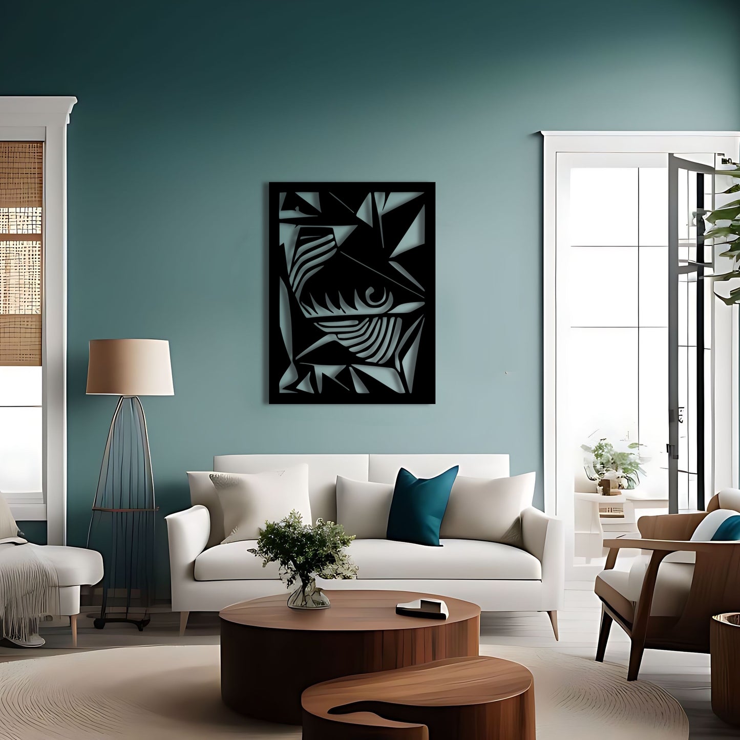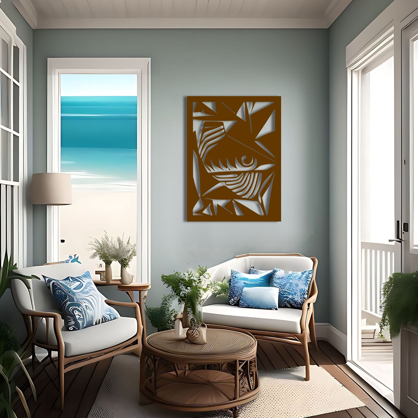 Add a bold statement to your home decor with this abstract shark wall art, inspired by the famous artist MC Escher. The bold line art and rectangle borders create a striking contrast, while the abstract concept adds a touch of modernity. This unique piece is perfect for a father's day gift, or as a present for ocean and marine life lovers, fishing enthusiasts, and beach or lake house owners. The metal artwork is suitable for both indoor and outdoor use, and is available in custom color options to match any decor.