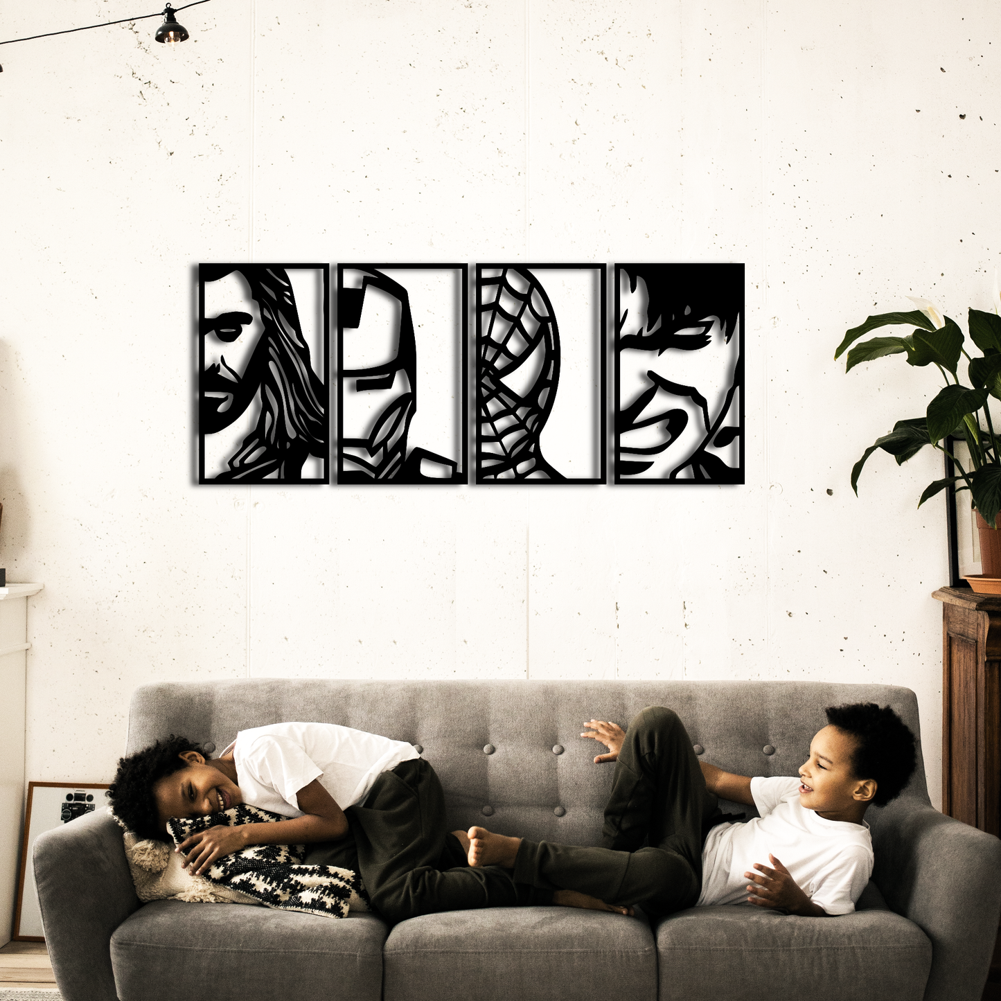 Add a touch of superhero style to your kids' room with this set of 4 metal wall art pieces featuring Thor, Iron Man, Spiderman, and Hulk. The colorful designs and intricate details make these pieces a perfect addition to any fan's collection. Made from durable metal, they can easily be hung on any wall for a striking display. Whether as a birthday gift or just a fun way to decorate, these Avengers metal wall art pieces are sure to delight.