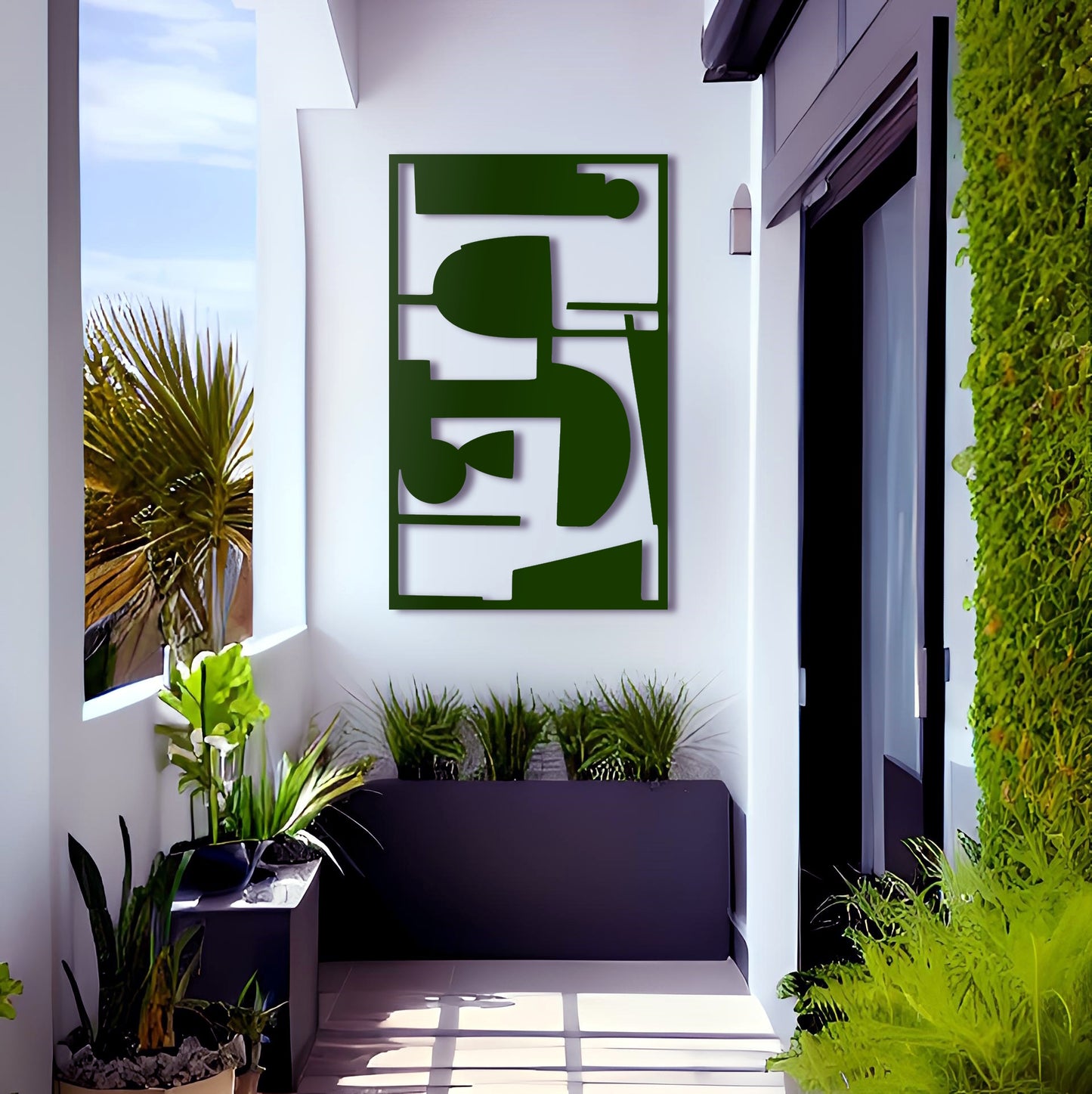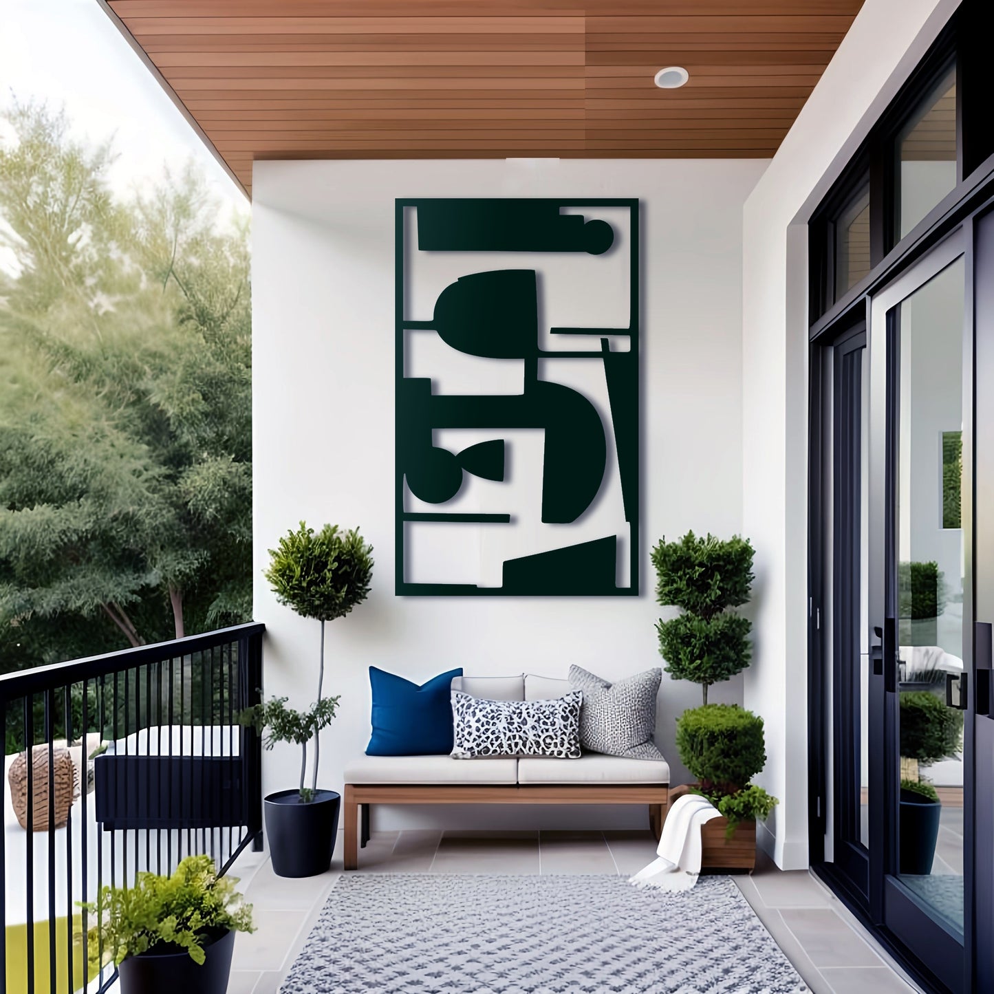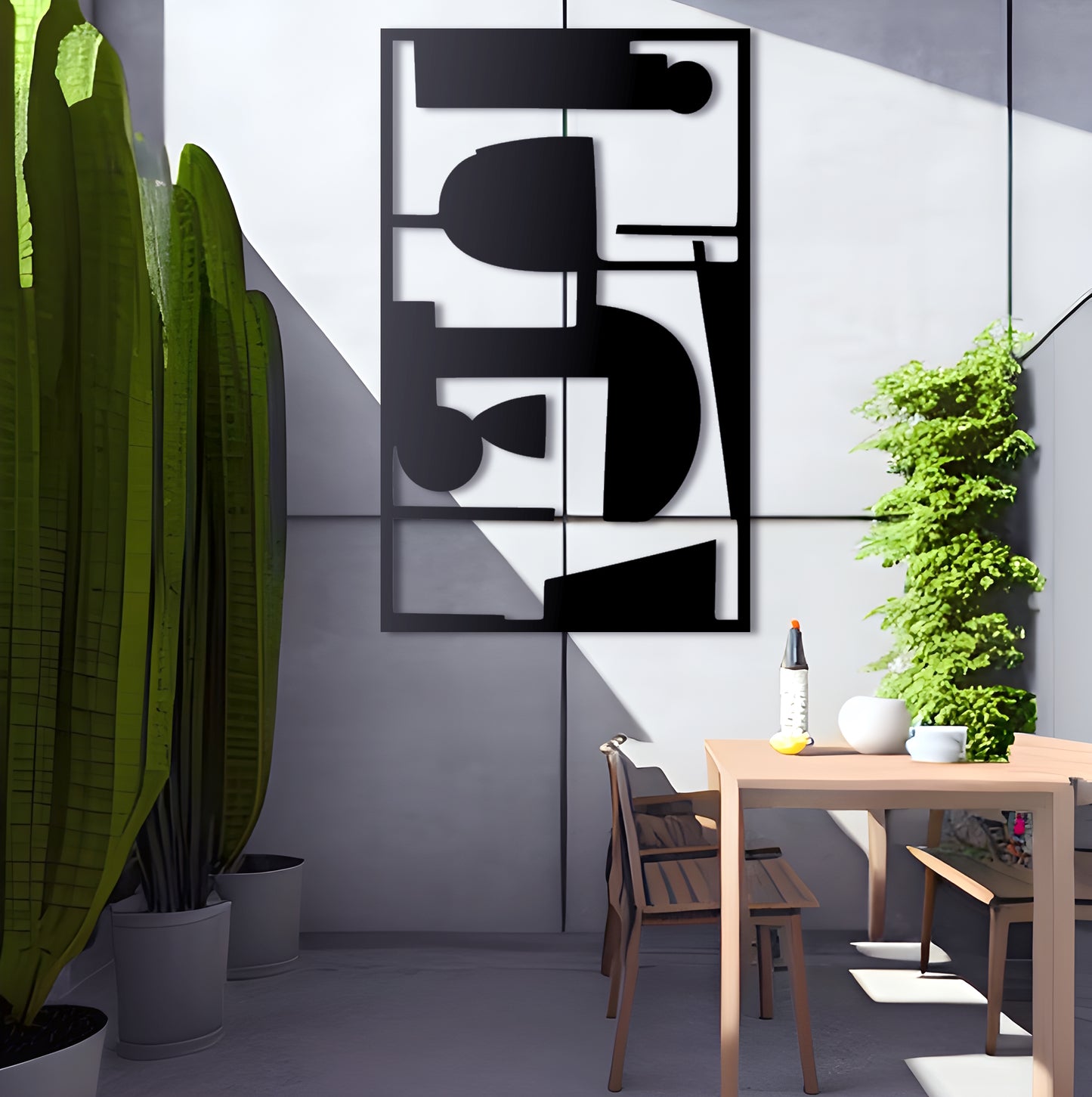 This unique metal wall art features abstract hyper-shapes with a suprematism influence. The design is inspired by the upside-down perspective and ragbag style, creating a visually stunning piece that will add a touch of modern art to any living space or outdoor area. The metal material ensures durability and longevity, making it perfect for both indoor and outdoor use.