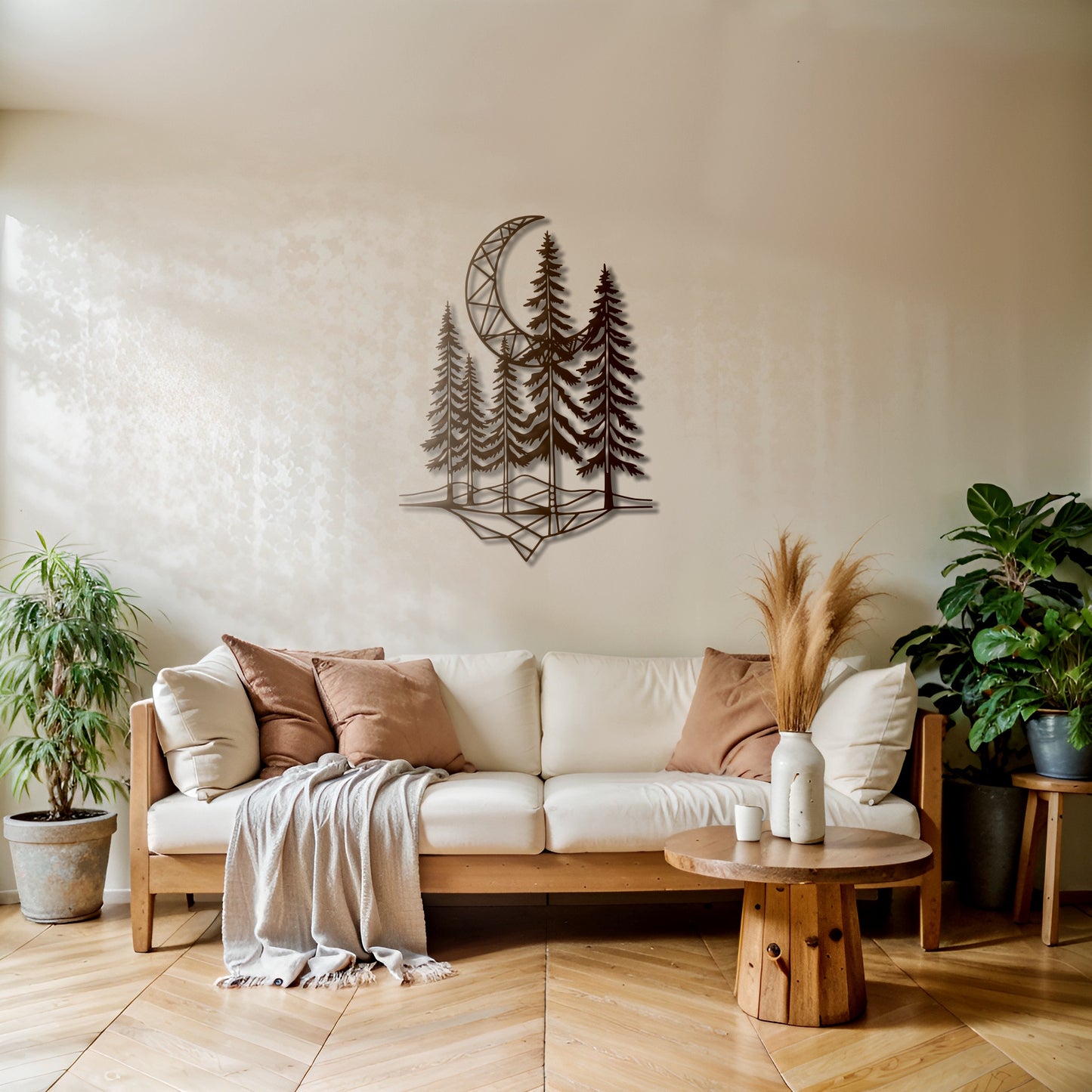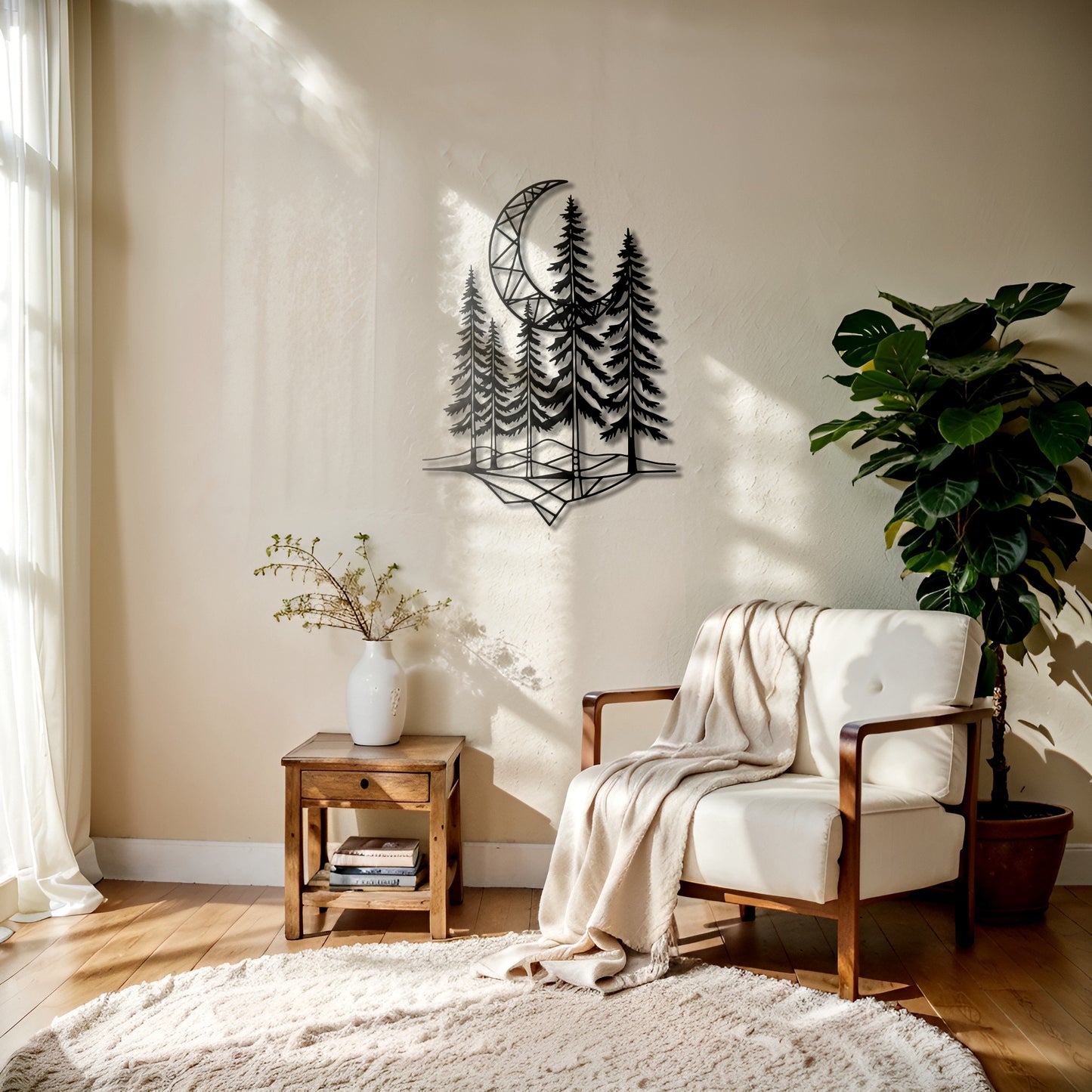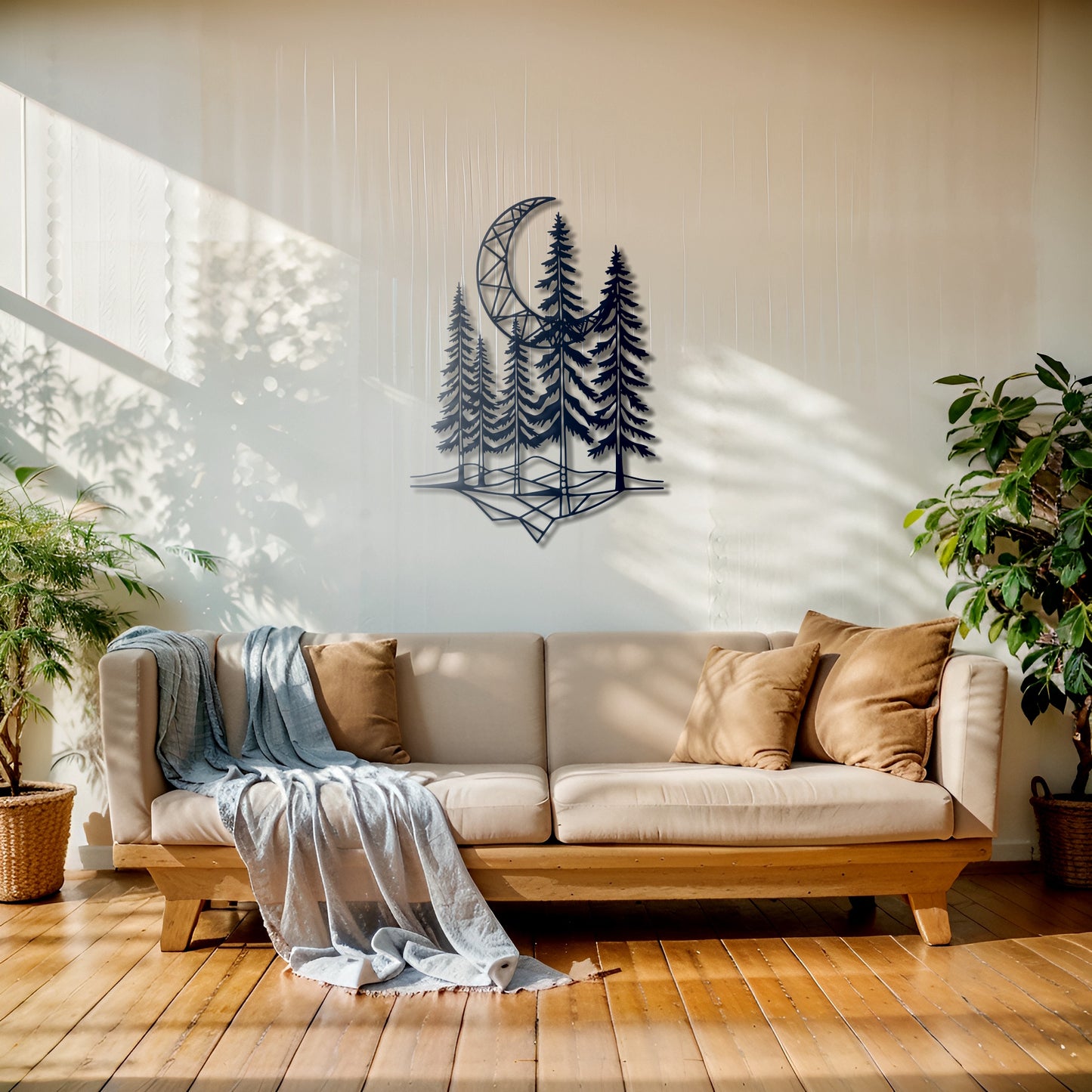 Add a touch of enchantment to your space with this Crescent Moon and Pine Trees Metal Wall Art. Featuring a crescent moon delicately arched above a serene grove of pine trees and a geometric base, this piece evokes a sense of mystery and wonder. Perfect for modern and rustic settings alike, it’s ideal for both indoor and outdoor décor.