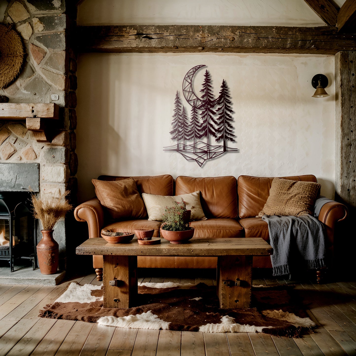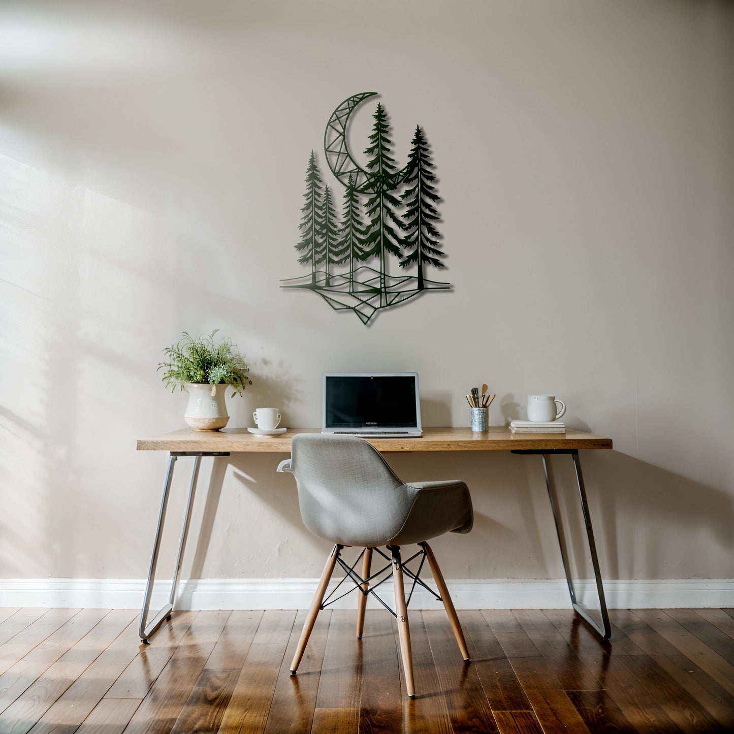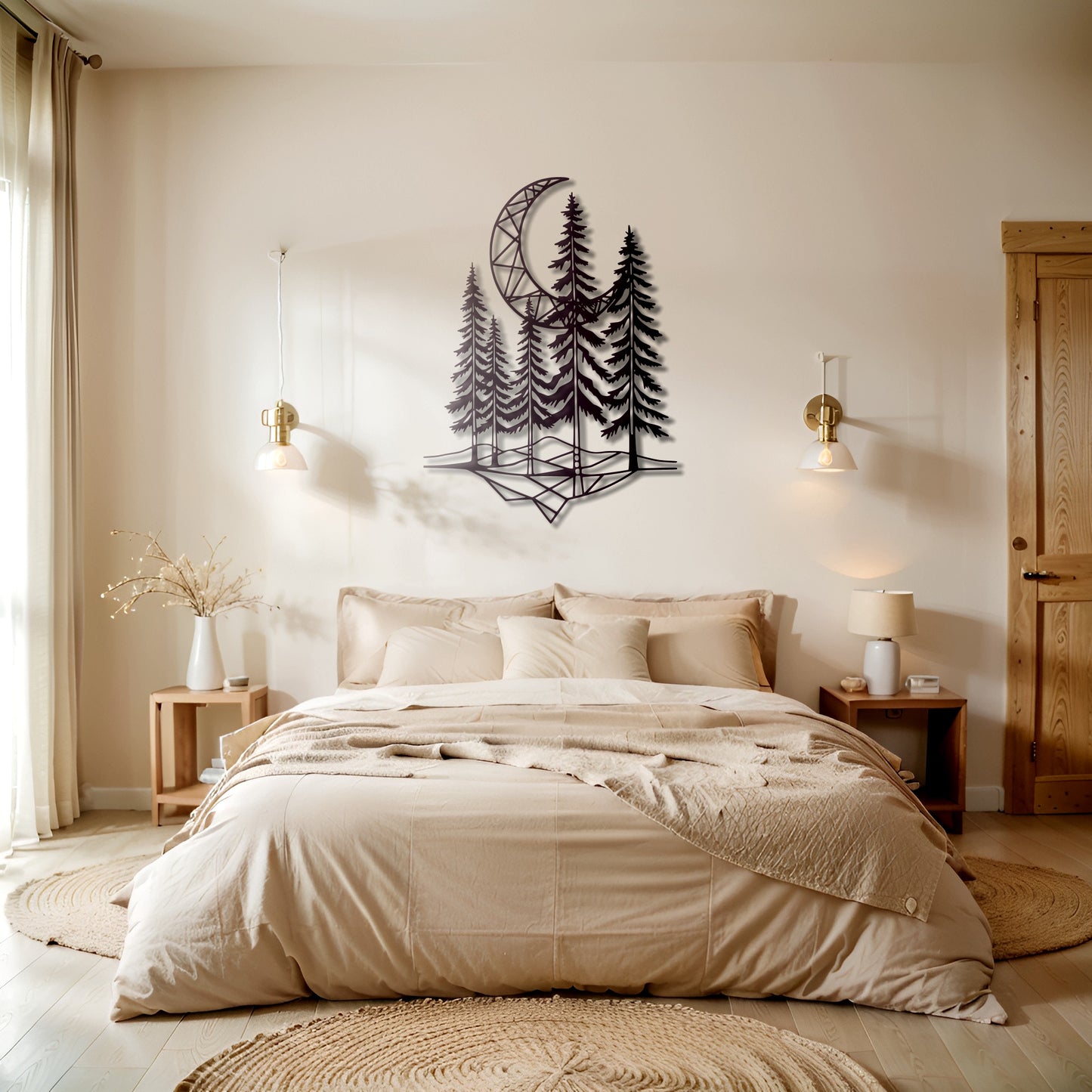 Add a touch of enchantment to your space with this Crescent Moon and Pine Trees Metal Wall Art. Featuring a crescent moon delicately arched above a serene grove of pine trees and a geometric base, this piece evokes a sense of mystery and wonder. Perfect for modern and rustic settings alike, it’s ideal for both indoor and outdoor décor.