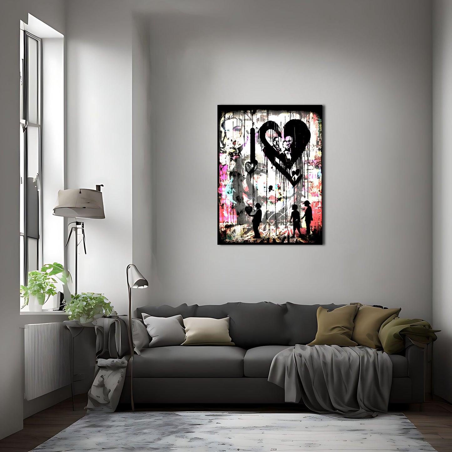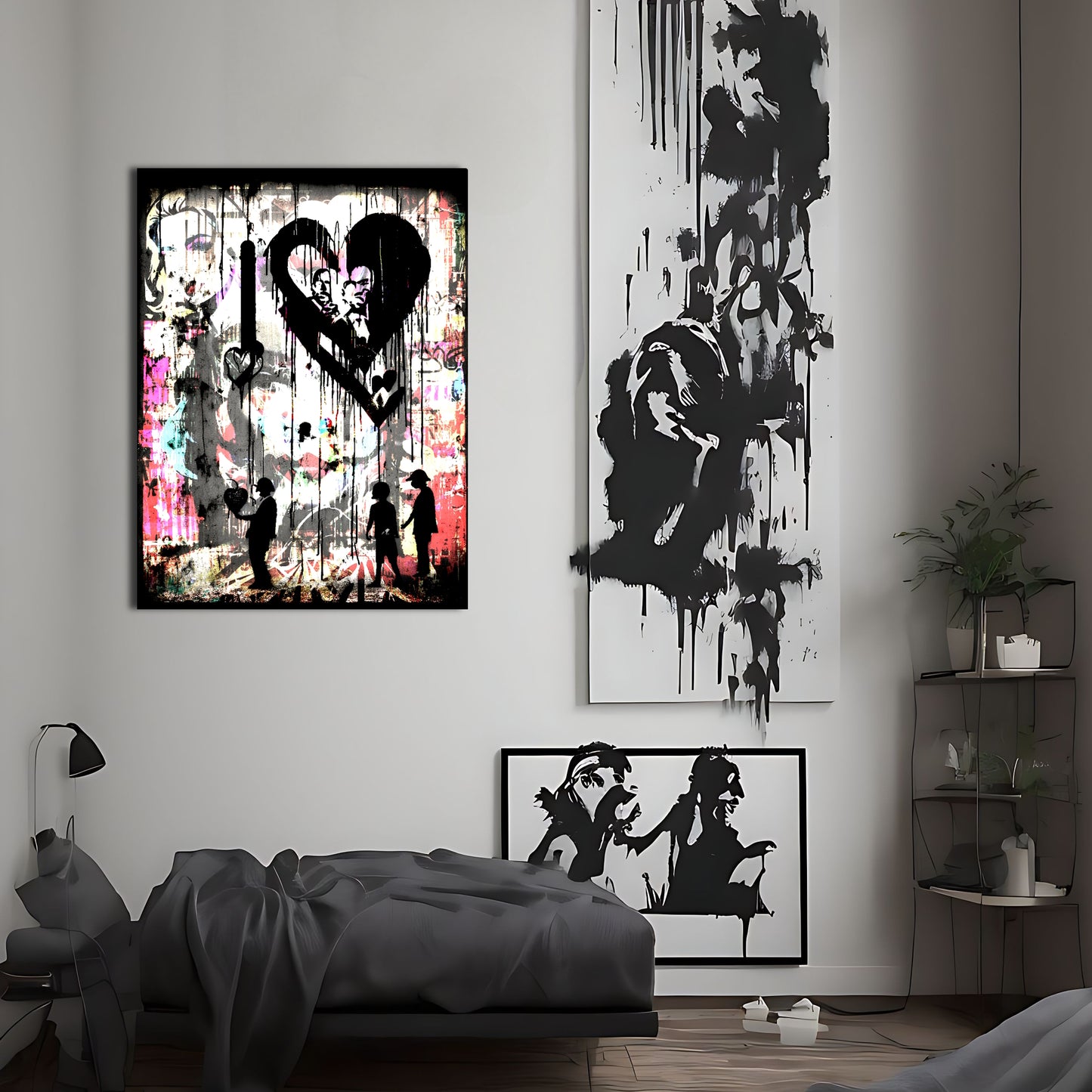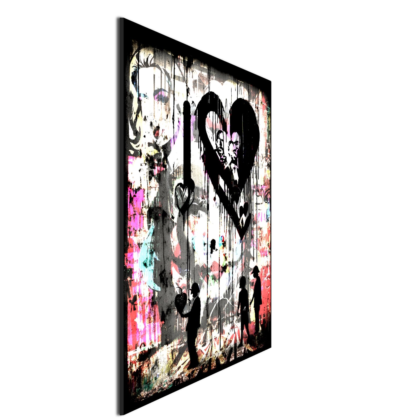 This stunning metal poster depicts a group of people standing in front of a colorful graffiti-covered wall, inspired by the renowned artist Banksy. The graffiti art is posterized and features several melting and dripping hearts, representing peace and love. The high-quality metal print showcases vivid colors and a unique texture, perfect for adding an urban and artistic touch to any room. This piece of wall art is a must-have for graffiti lovers and those who appreciate bold and meaningful artwork.