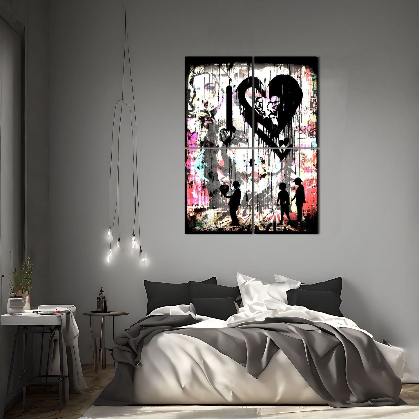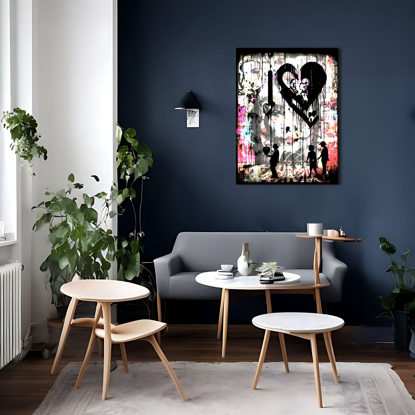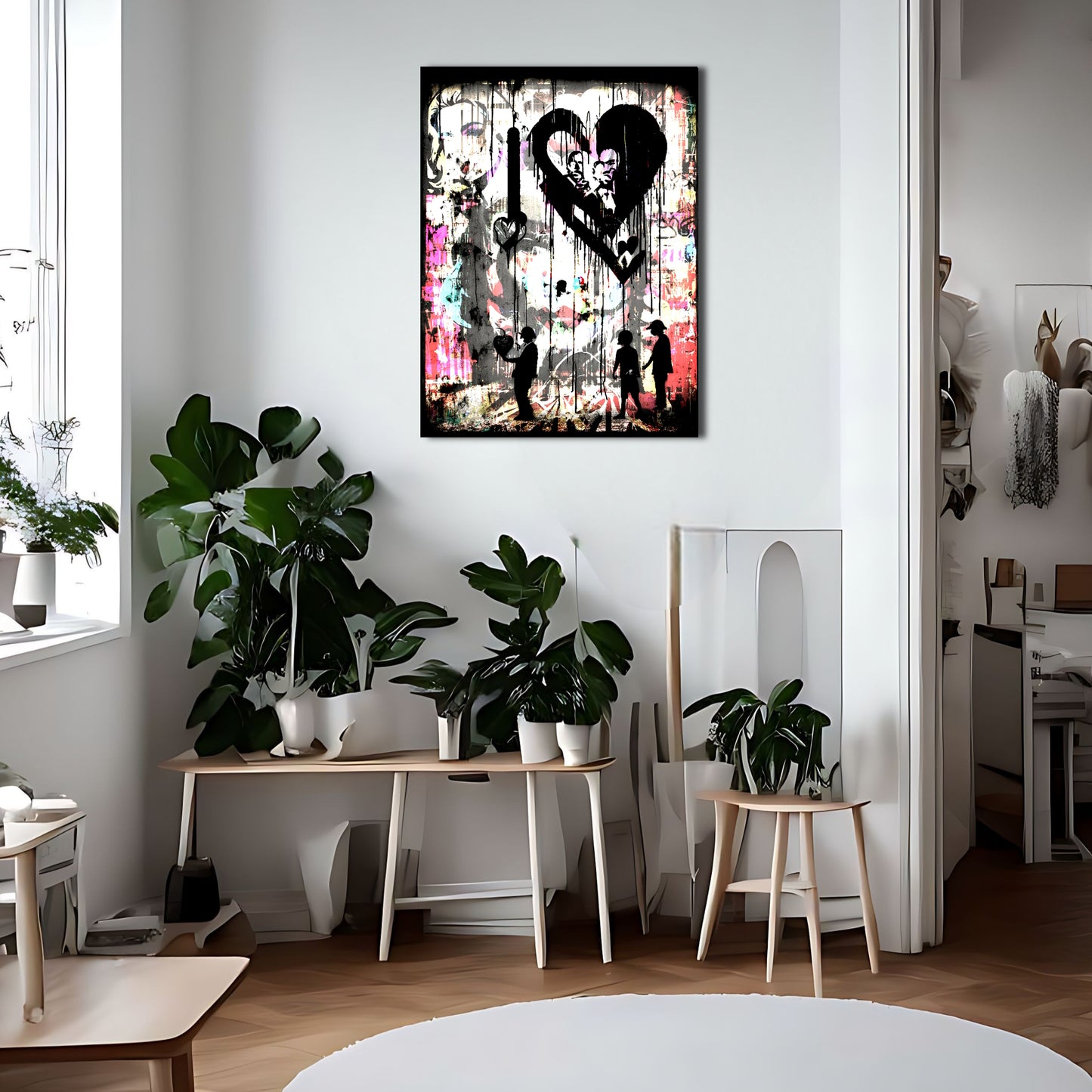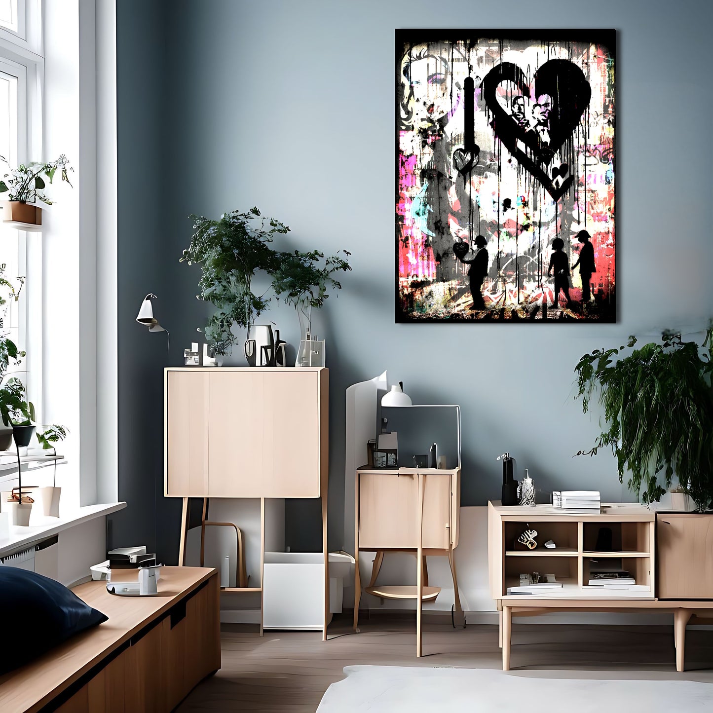 This stunning metal poster depicts a group of people standing in front of a colorful graffiti-covered wall, inspired by the renowned artist Banksy. The graffiti art is posterized and features several melting and dripping hearts, representing peace and love. The high-quality metal print showcases vivid colors and a unique texture, perfect for adding an urban and artistic touch to any room. This piece of wall art is a must-have for graffiti lovers and those who appreciate bold and meaningful artwork.