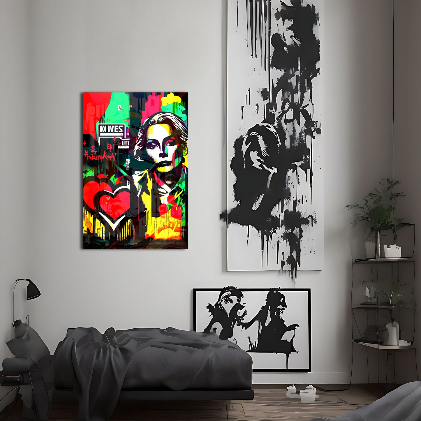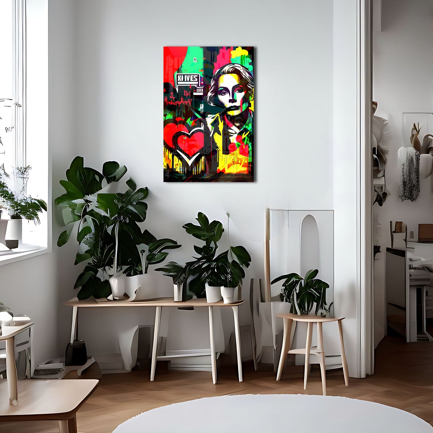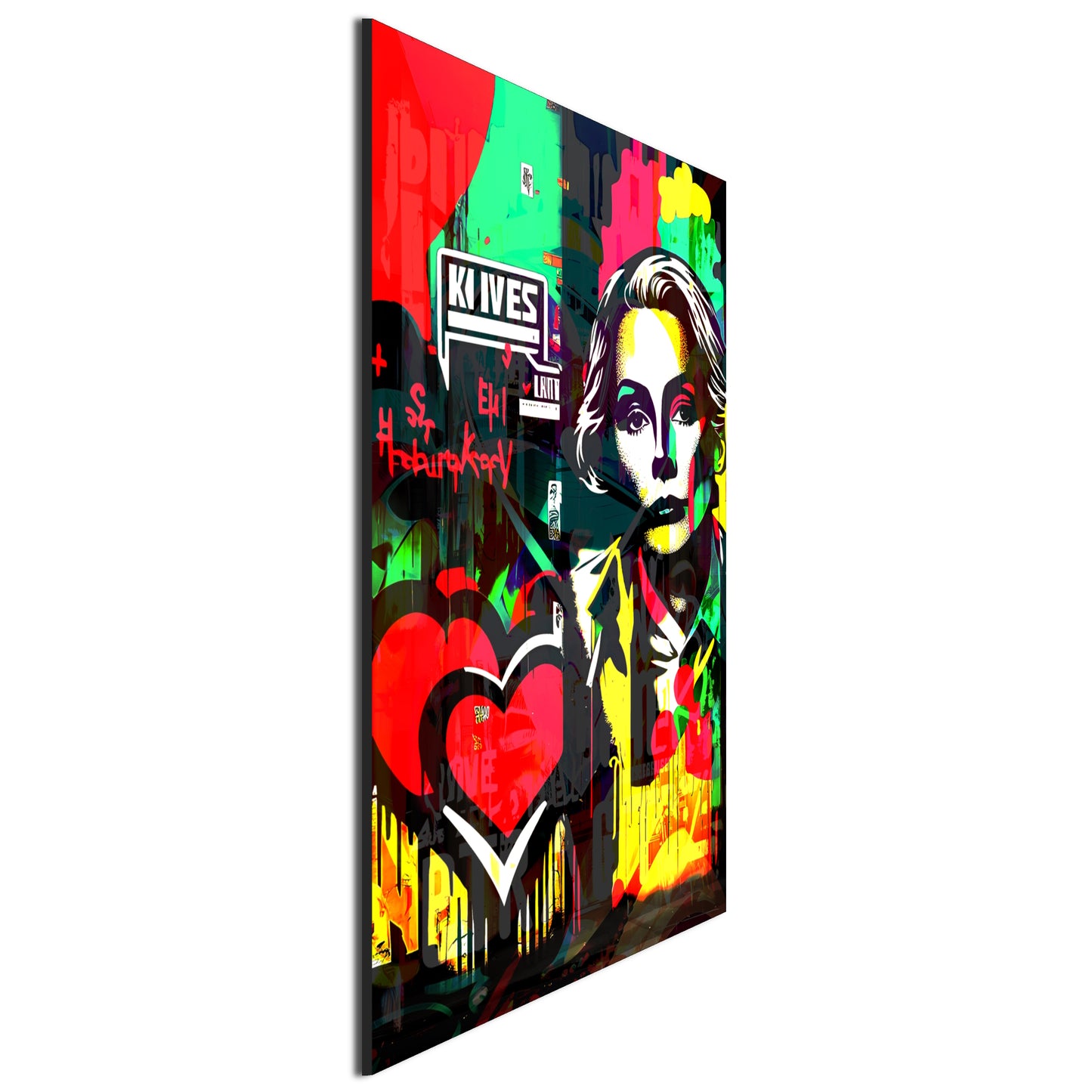 Bring a touch of kitsch-cool to your home decor with this pop art painting inspired by the works of Sandra Chevrier. Featuring a woman with a heart and a graffiti-like touch, this vector art piece exudes a very coherent and modern vibe while evoking the iconic style of Grace Kelly. Available as metal posters, this wall art decor is a must-have for any contemporary art enthusiast looking to elevate their interior design.