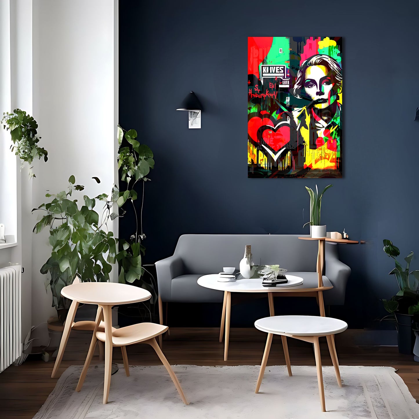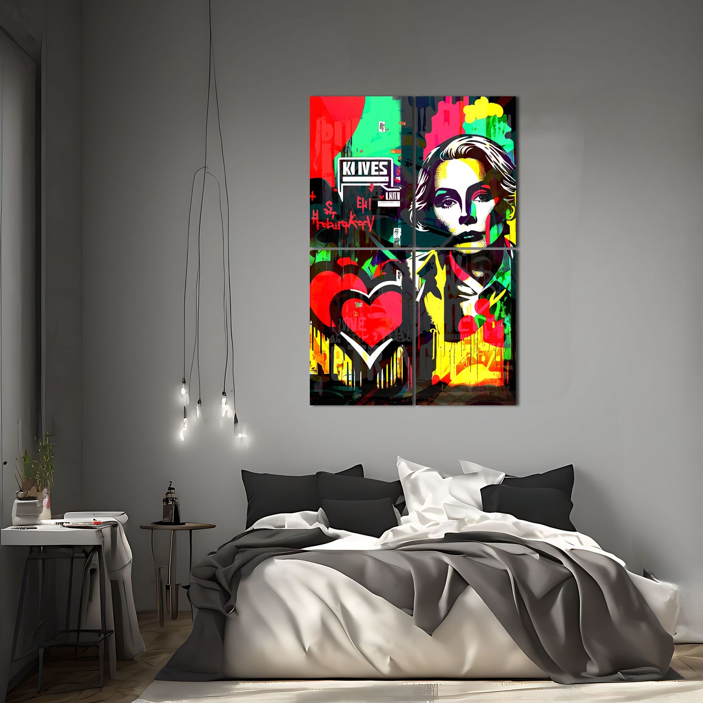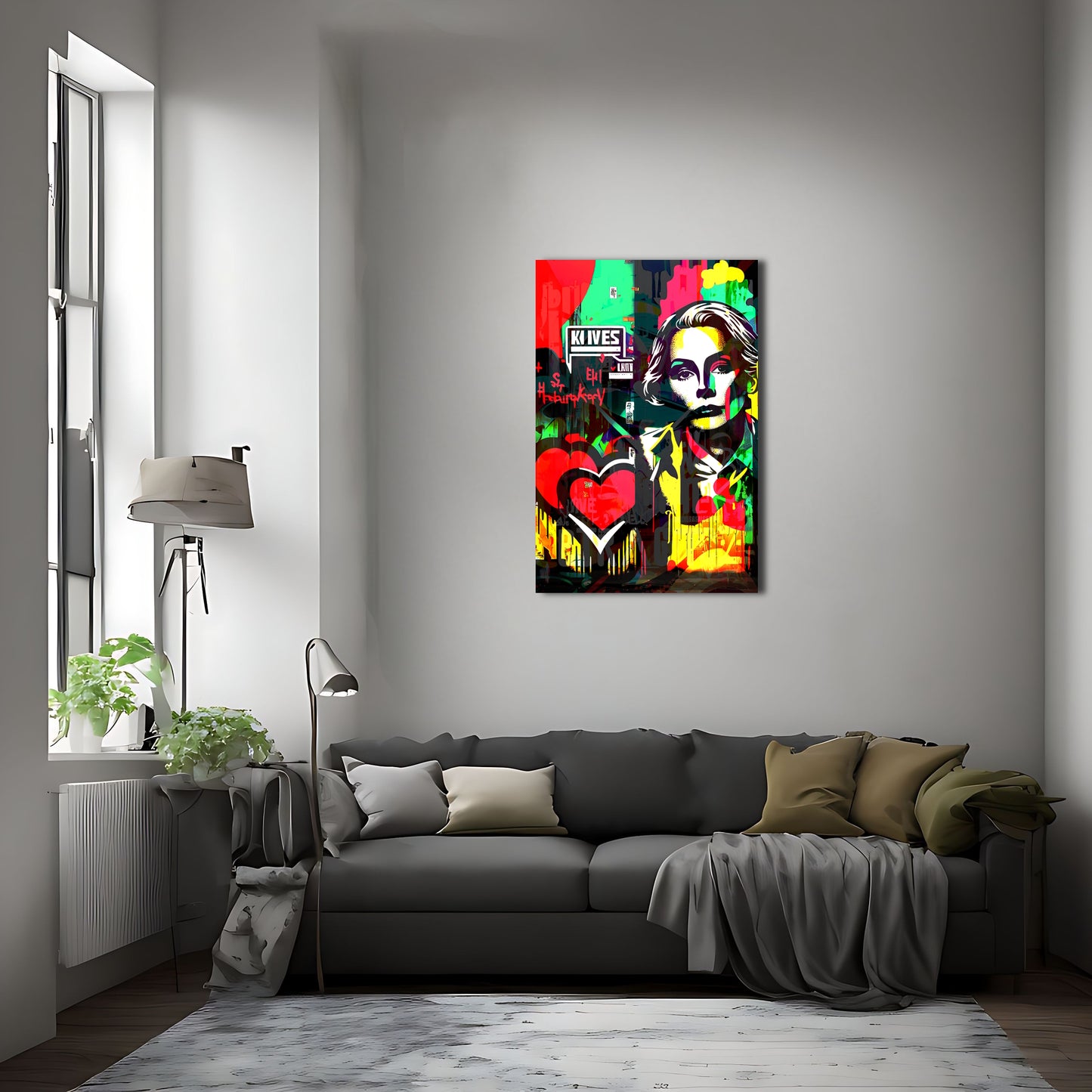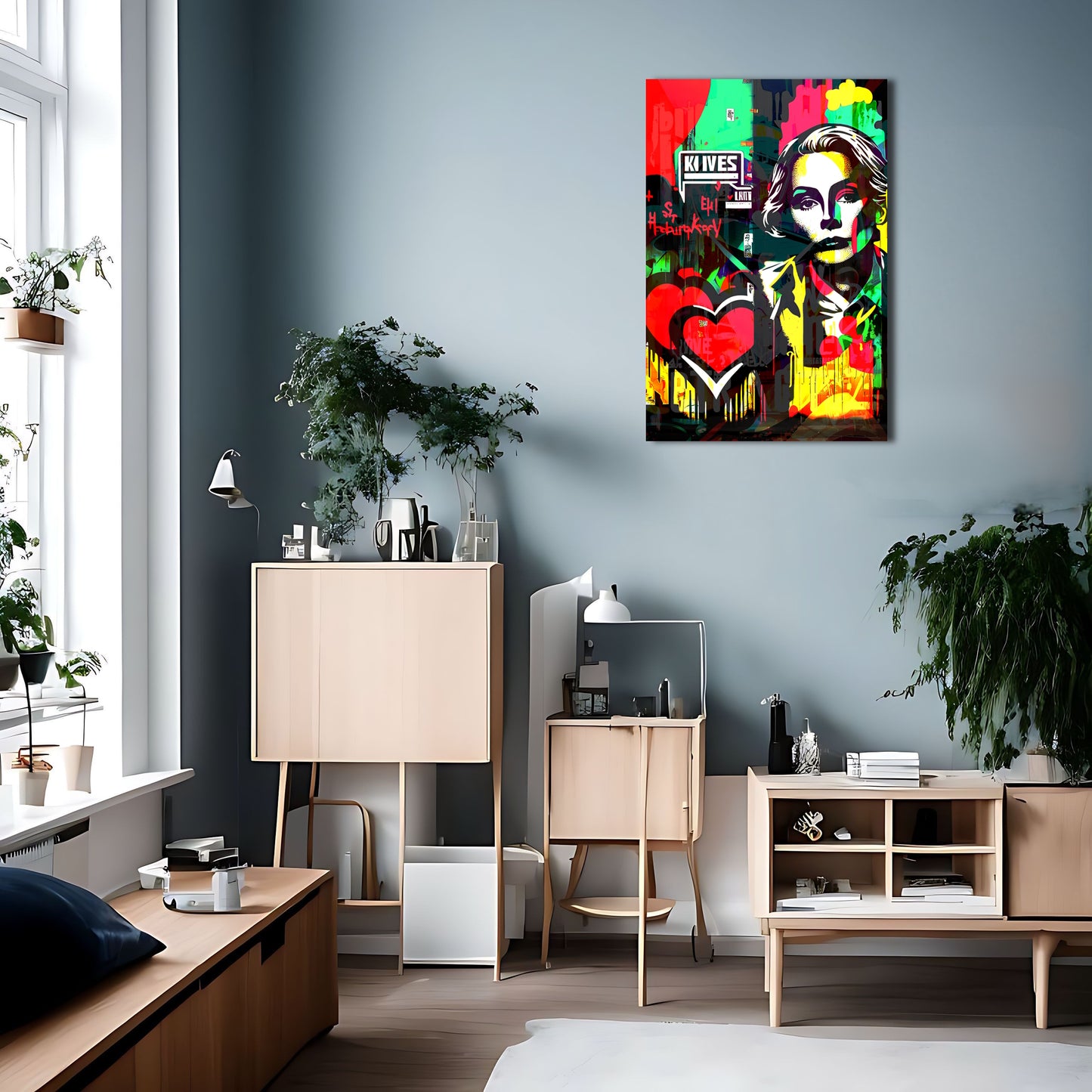 Bring a touch of kitsch-cool to your home decor with this pop art painting inspired by the works of Sandra Chevrier. Featuring a woman with a heart and a graffiti-like touch, this vector art piece exudes a very coherent and modern vibe while evoking the iconic style of Grace Kelly. Available as metal posters, this wall art decor is a must-have for any contemporary art enthusiast looking to elevate their interior design.