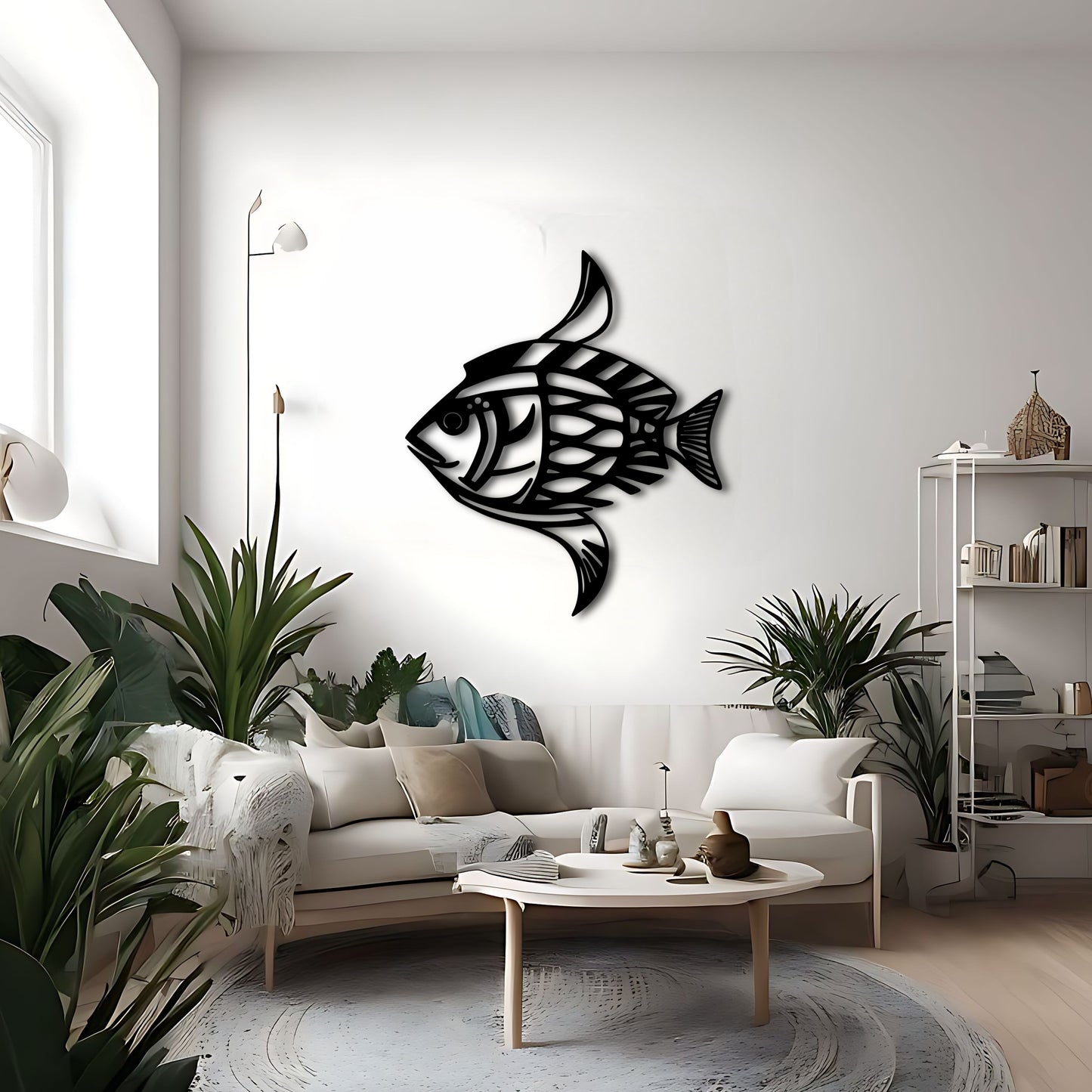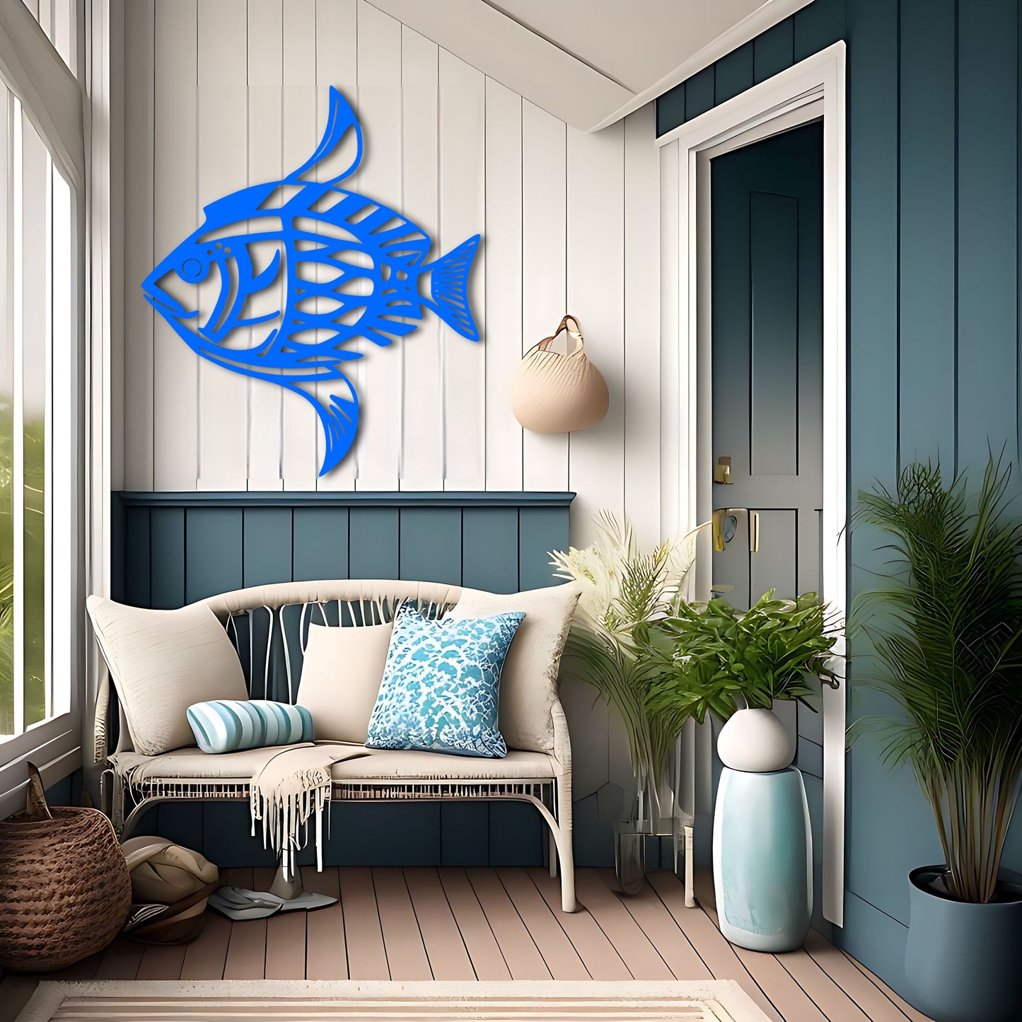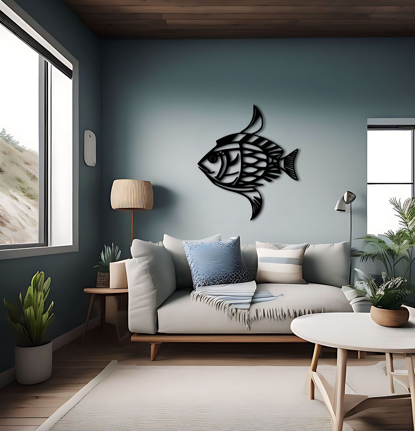 Bring the beauty of the ocean into your home with this stunning fish metal wall art inspired by the works of Karl Pümpin. The fish dazzle camouflage pattern and clear lines create a gorgeous and unique piece that is perfect for any inhabitant or ocean lover. The tilt up angle adds depth and dimension to the design. This metal artwork makes a great gift for fishing enthusiasts and marine life lovers, and is perfect for beach or lake house decor. Available in custom color options.