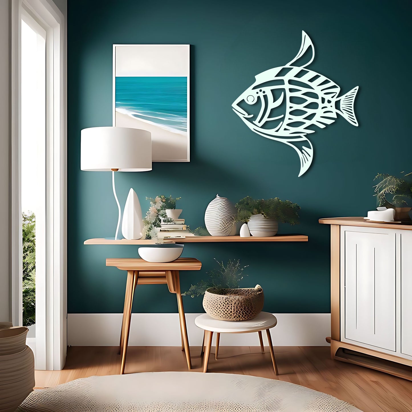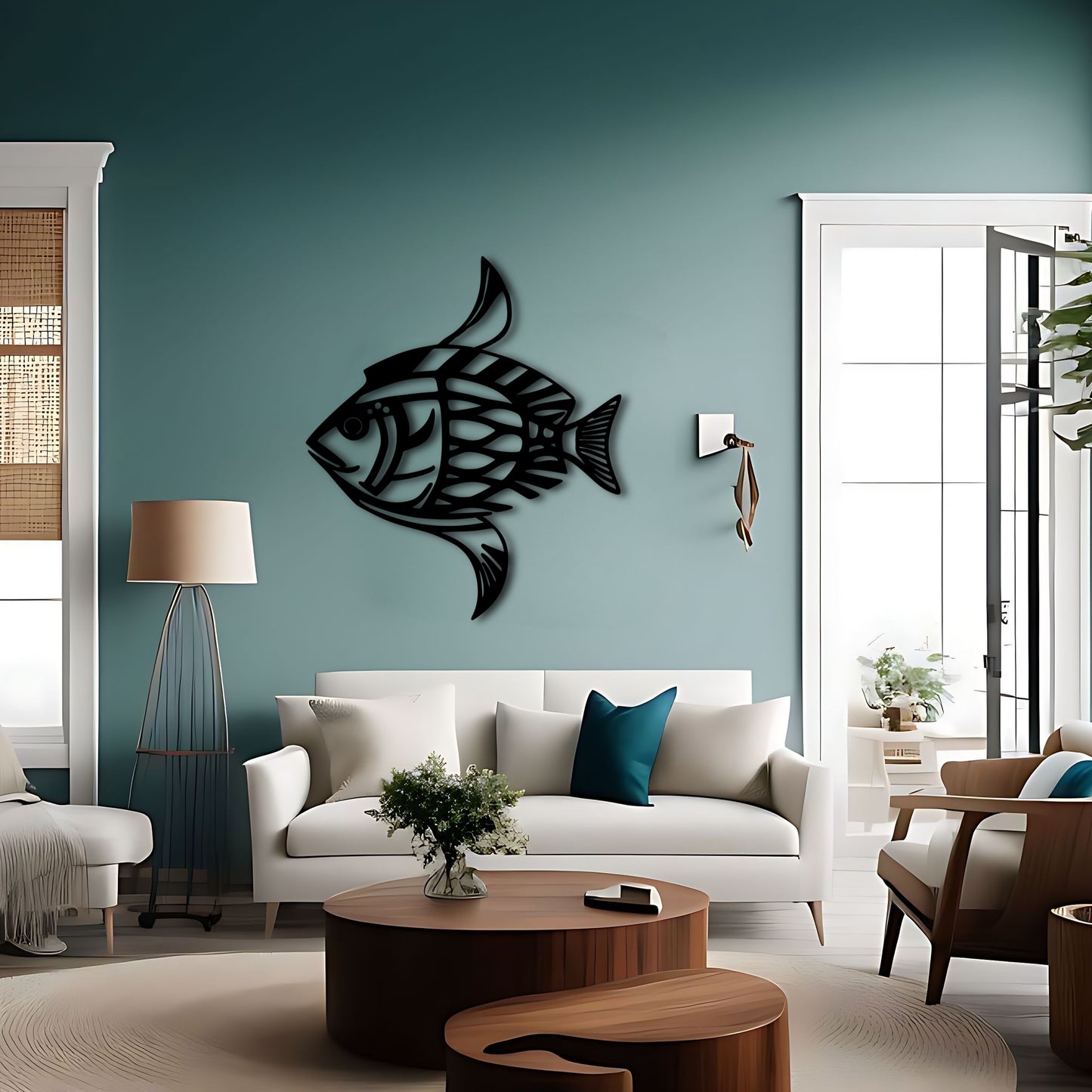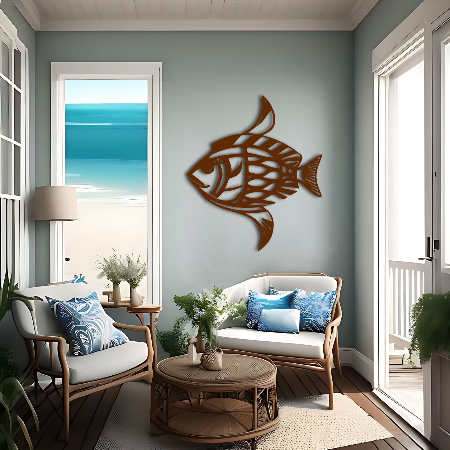 Bring the beauty of the ocean into your home with this stunning fish metal wall art inspired by the works of Karl Pümpin. The fish dazzle camouflage pattern and clear lines create a gorgeous and unique piece that is perfect for any inhabitant or ocean lover. The tilt up angle adds depth and dimension to the design. This metal artwork makes a great gift for fishing enthusiasts and marine life lovers, and is perfect for beach or lake house decor. Available in custom color options.