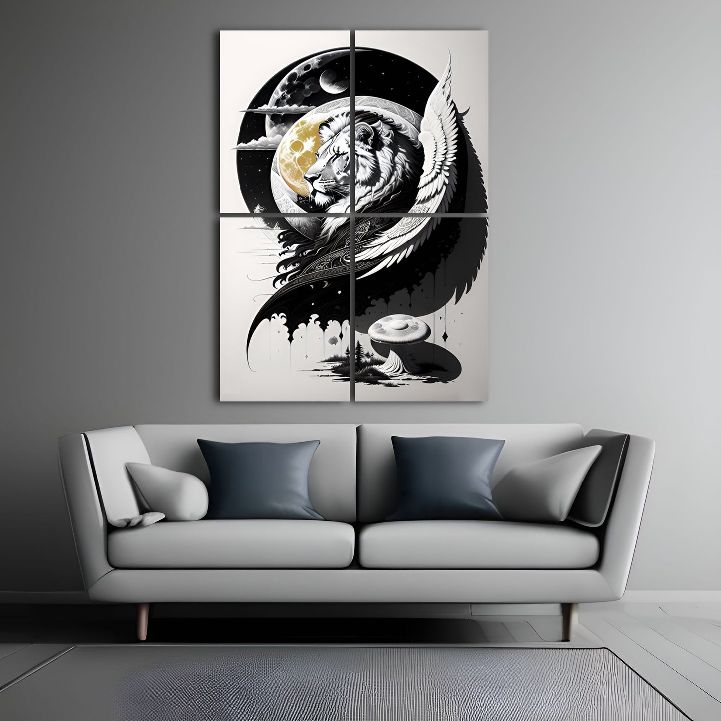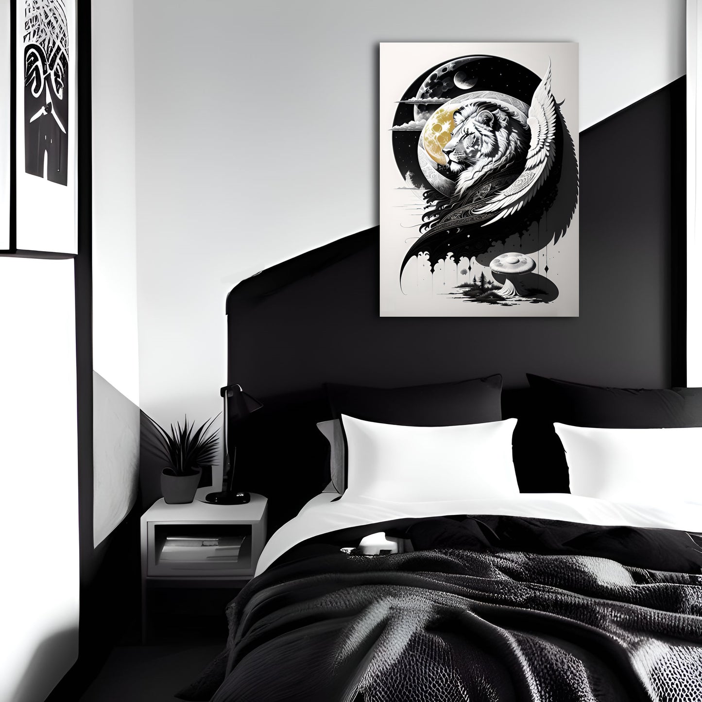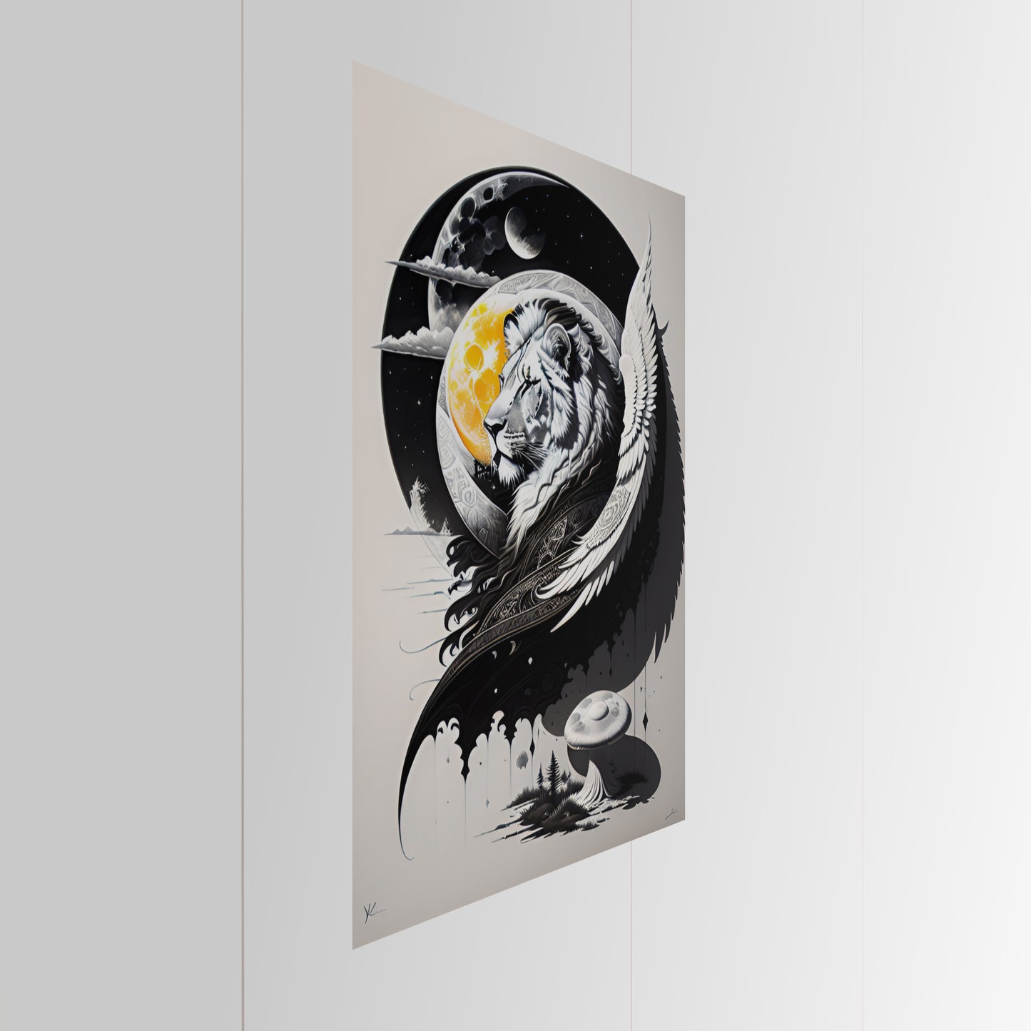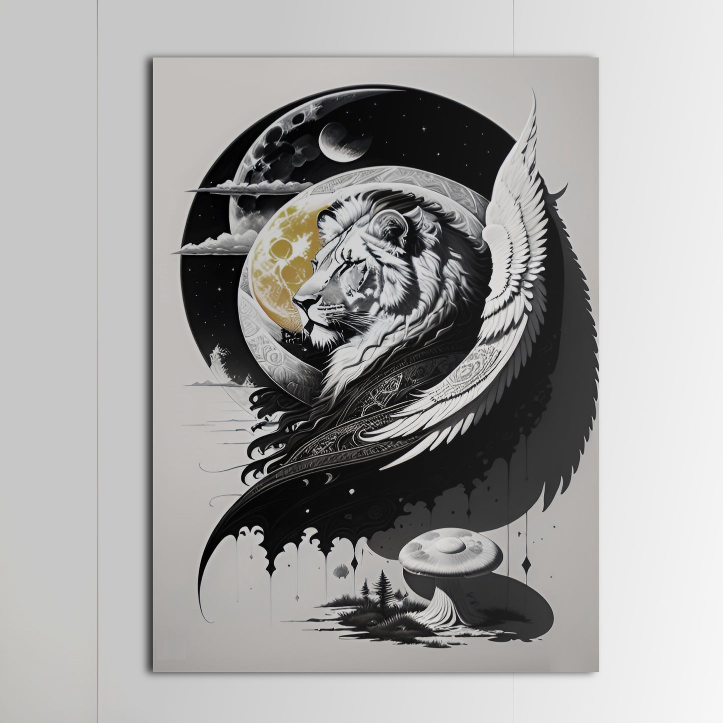 Explore our "Lion and Moon" collection featuring stunning black and white drawings of lions, exquisite digital illustrations of the moon, and intricate paintings of coastal scenes and mushroom landscapes. Our collection also includes beautiful depictions of lion guardians with angel wings, all available as metal posters and prints perfect for wall art decor. Elevate your space with these great digital art pieces that showcase incredible details and bring a touch of wild beauty to any room.