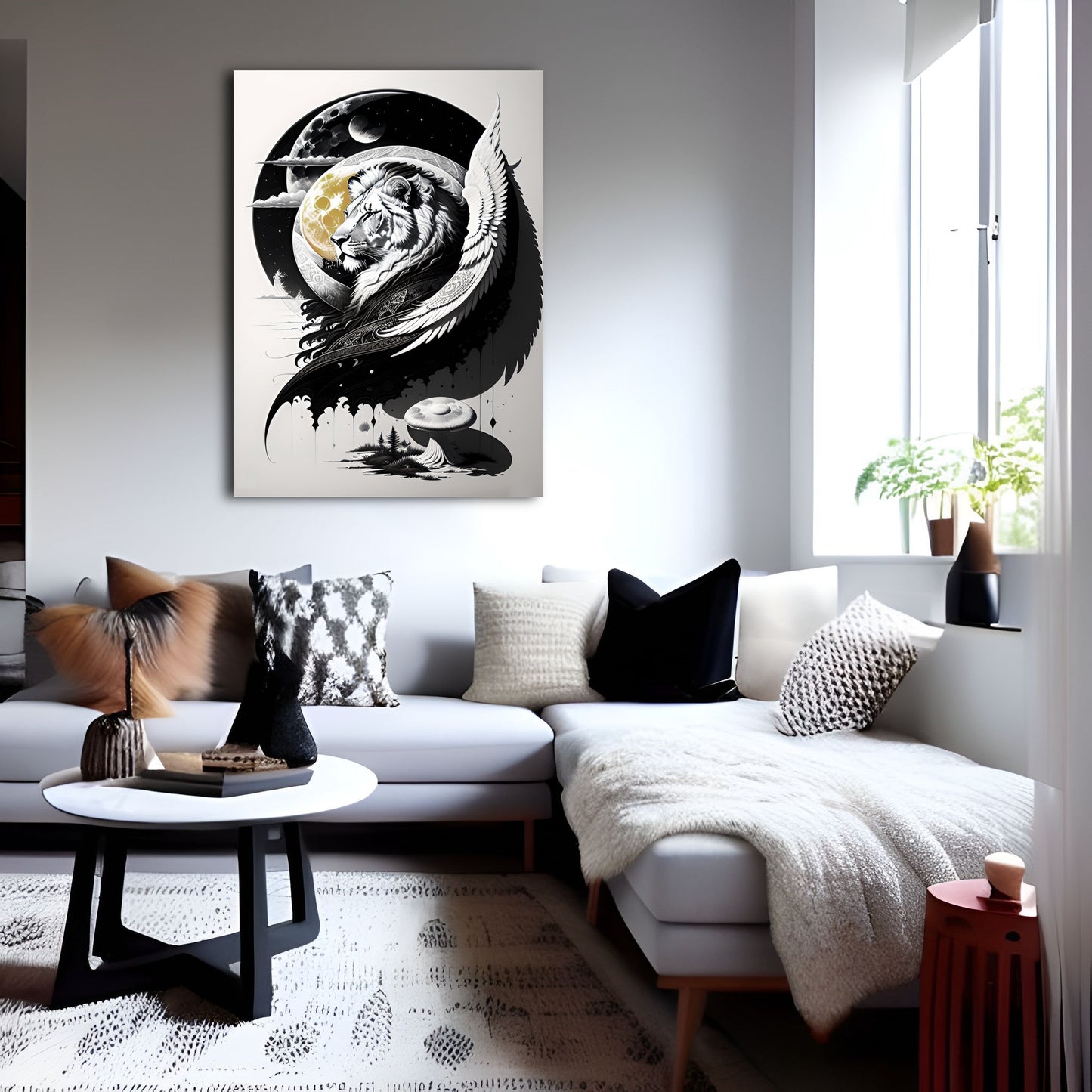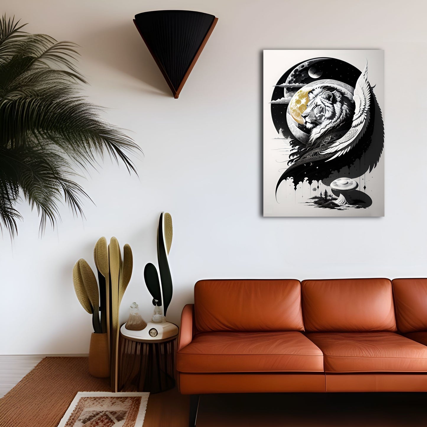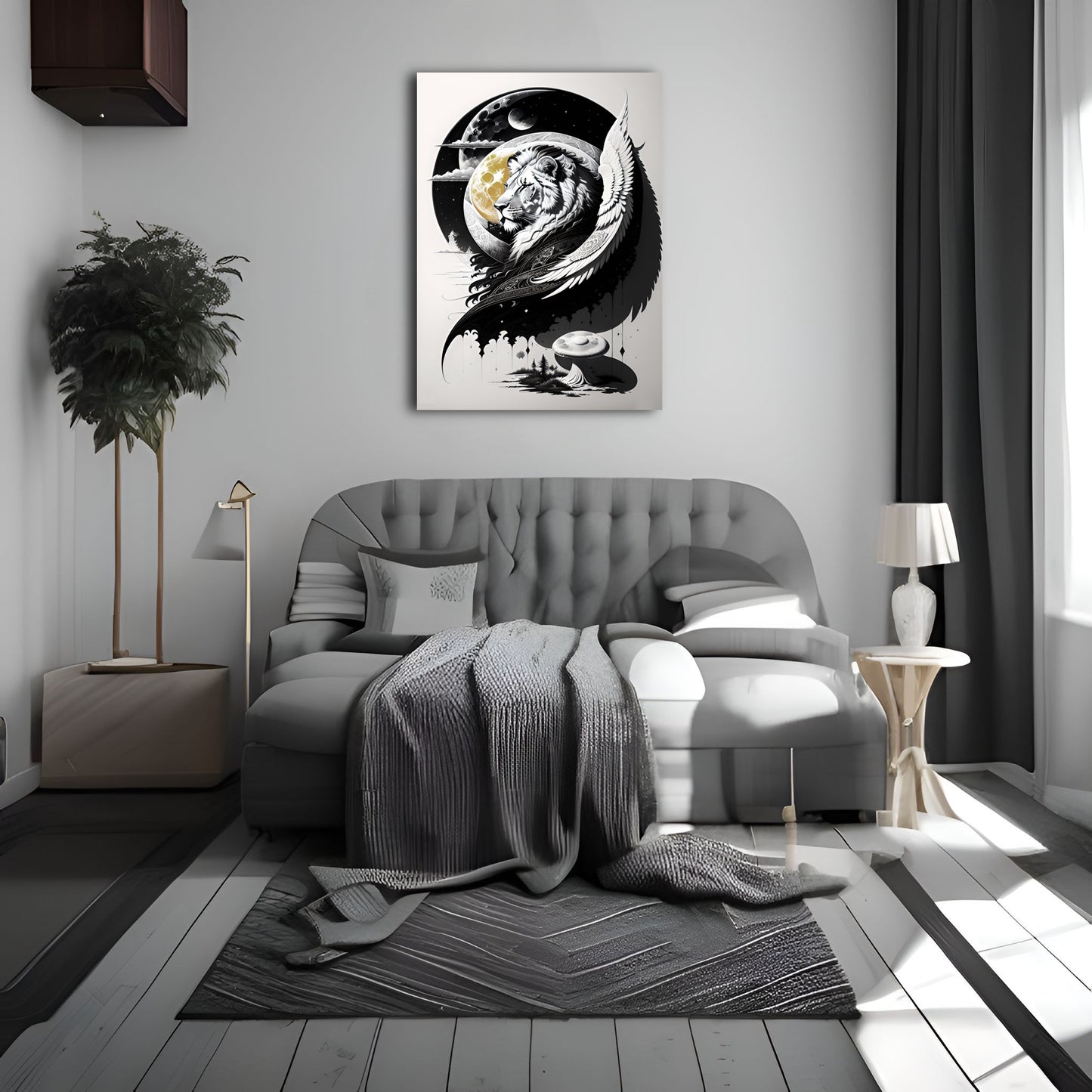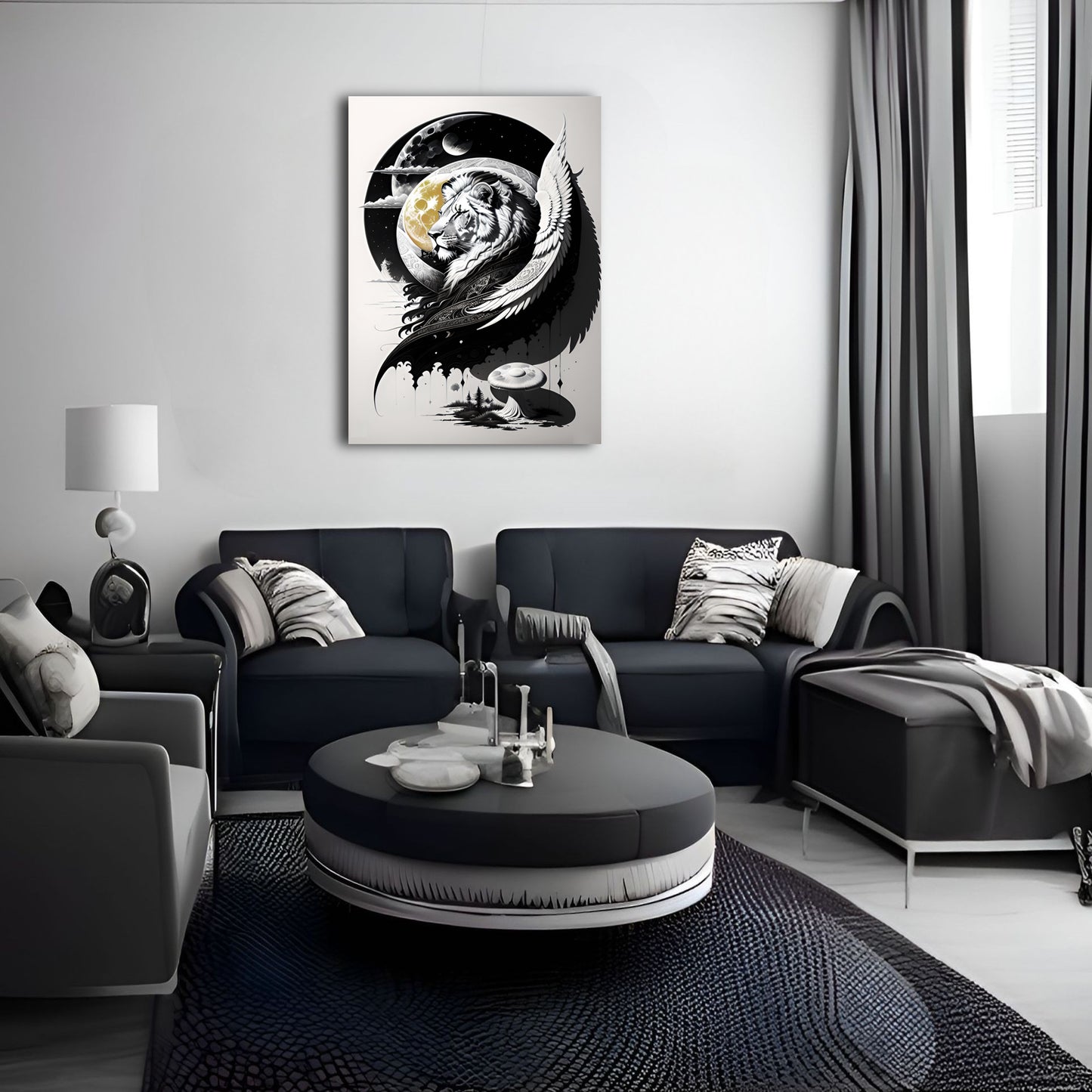 Explore our "Lion and Moon" collection featuring stunning black and white drawings of lions, exquisite digital illustrations of the moon, and intricate paintings of coastal scenes and mushroom landscapes. Our collection also includes beautiful depictions of lion guardians with angel wings, all available as metal posters and prints perfect for wall art decor. Elevate your space with these great digital art pieces that showcase incredible details and bring a touch of wild beauty to any room.