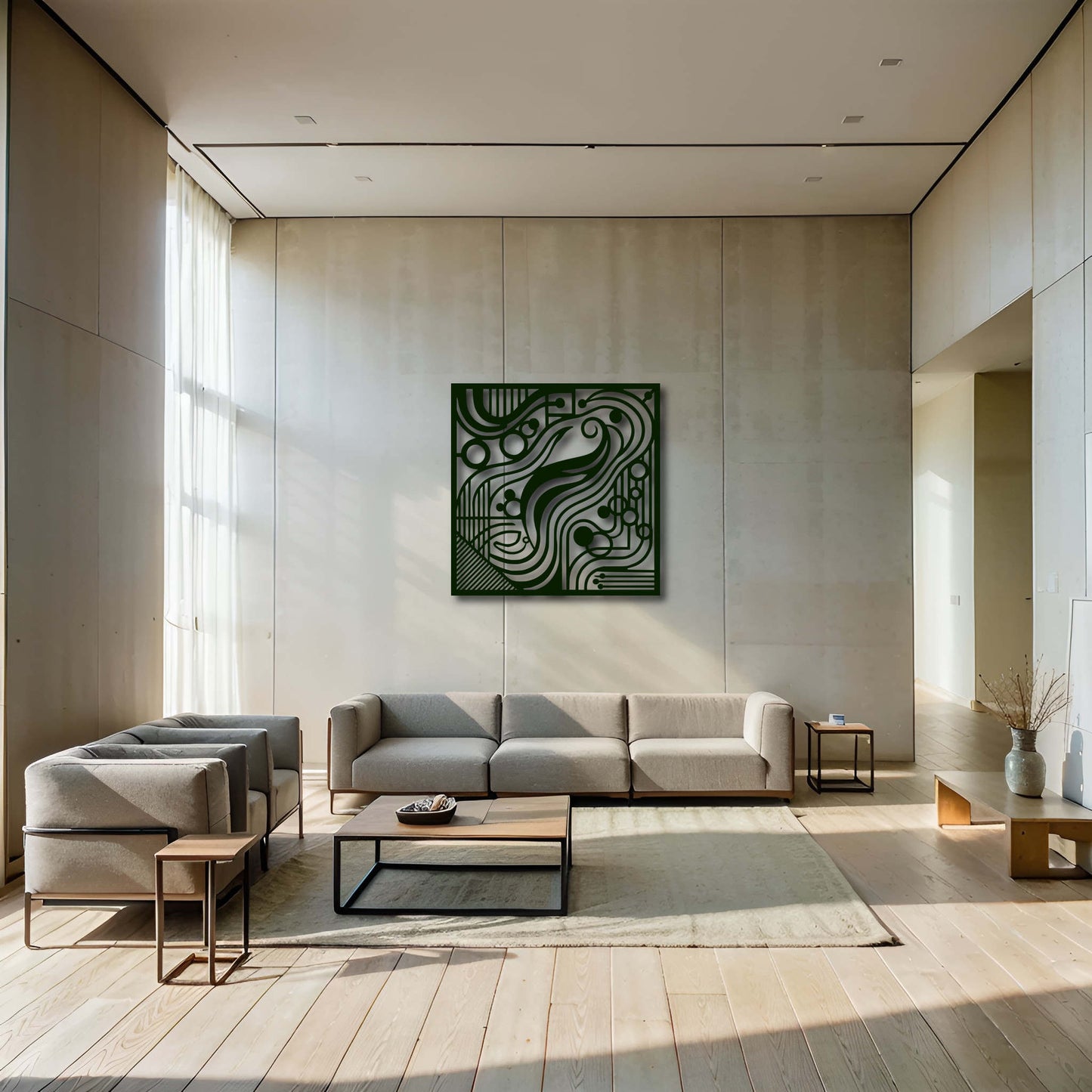 Transform your space with this striking modern geometric metal wall art, featuring an intricate abstract design in dark green. Perfect for minimalistic and contemporary interiors, this unique piece effortlessly adds a touch of elegance and artistic flair to your living room, bedroom, or office.