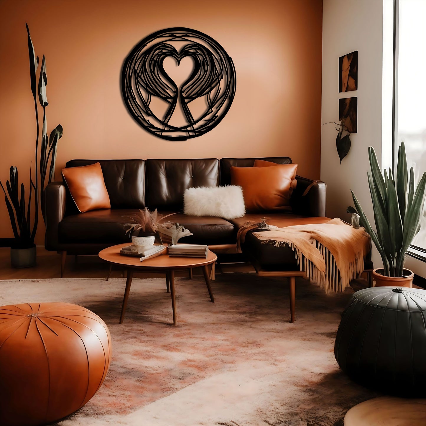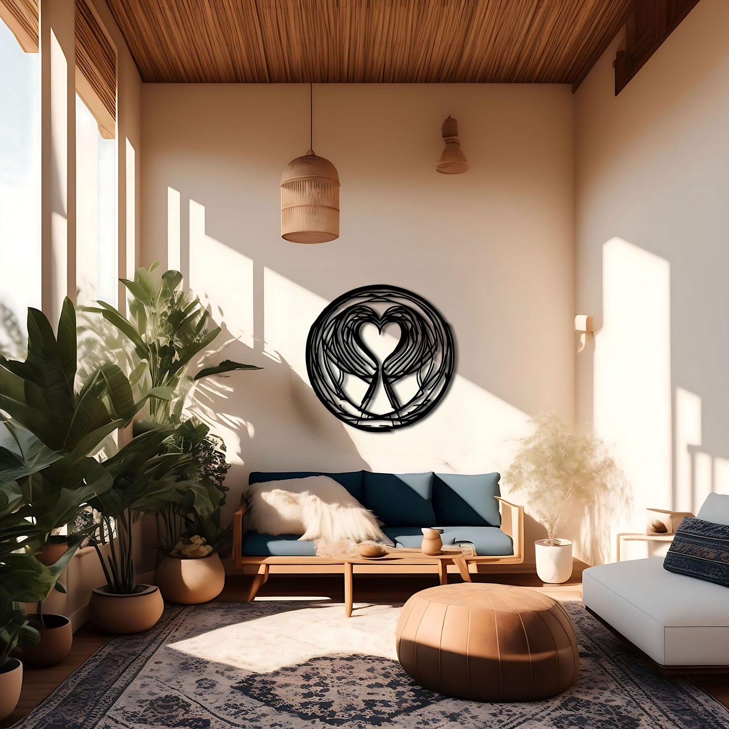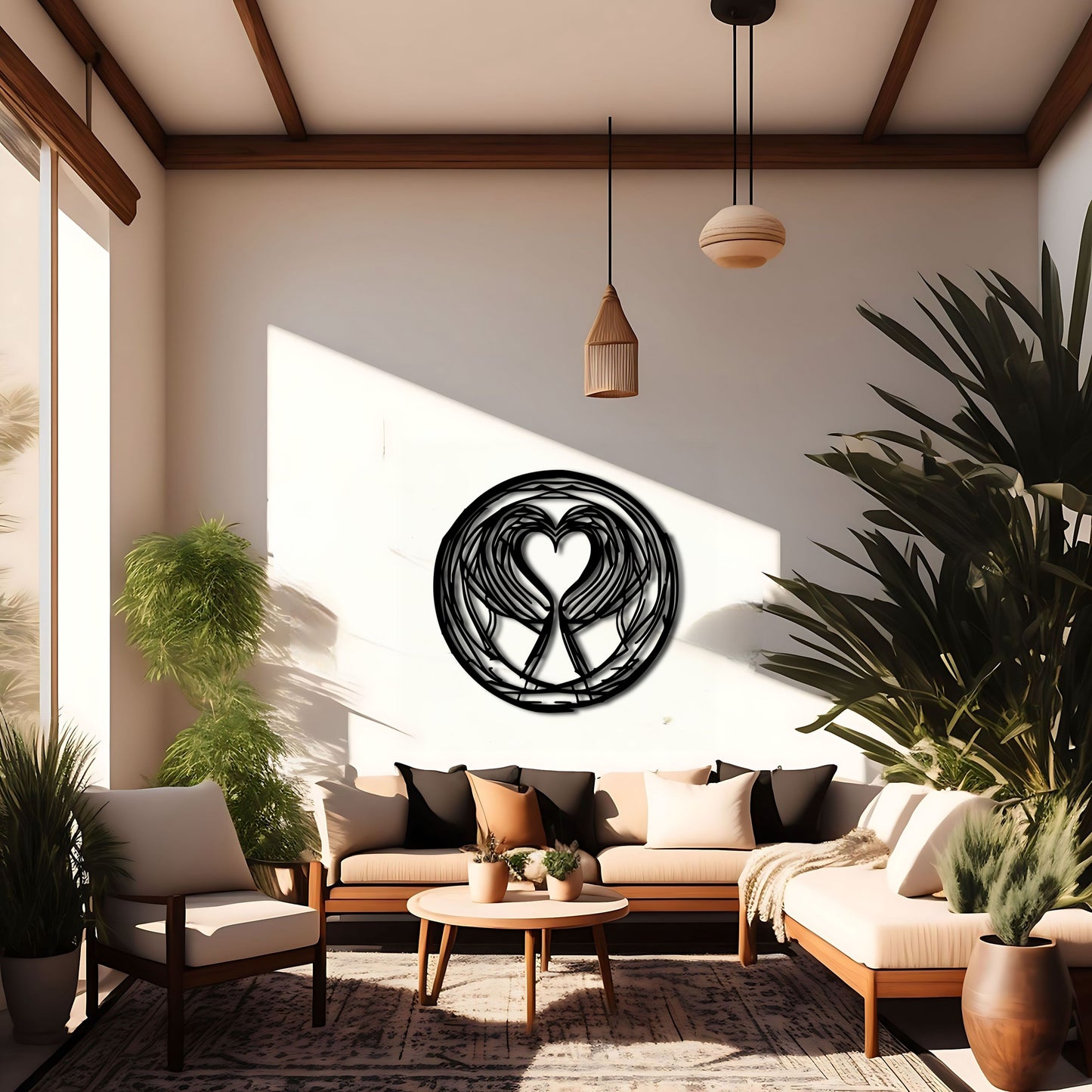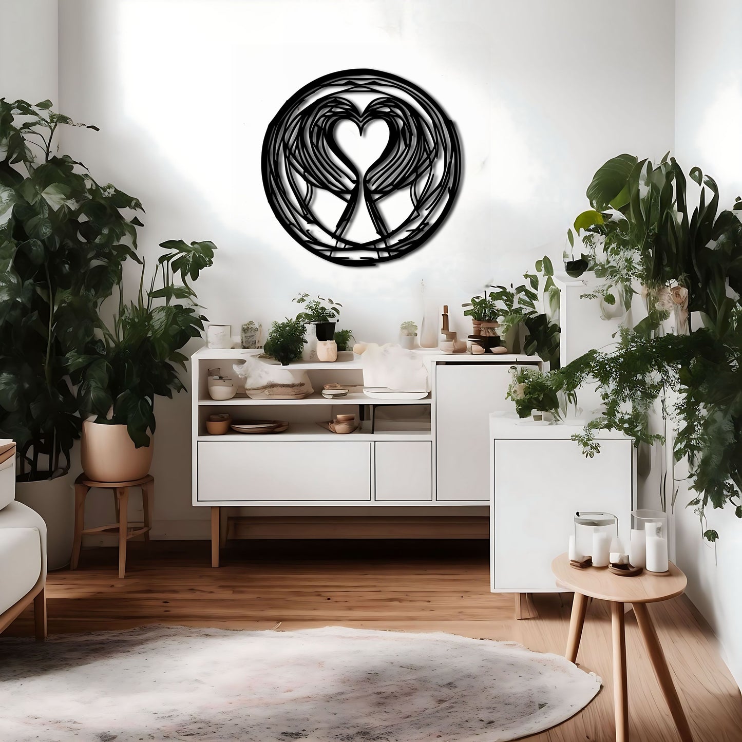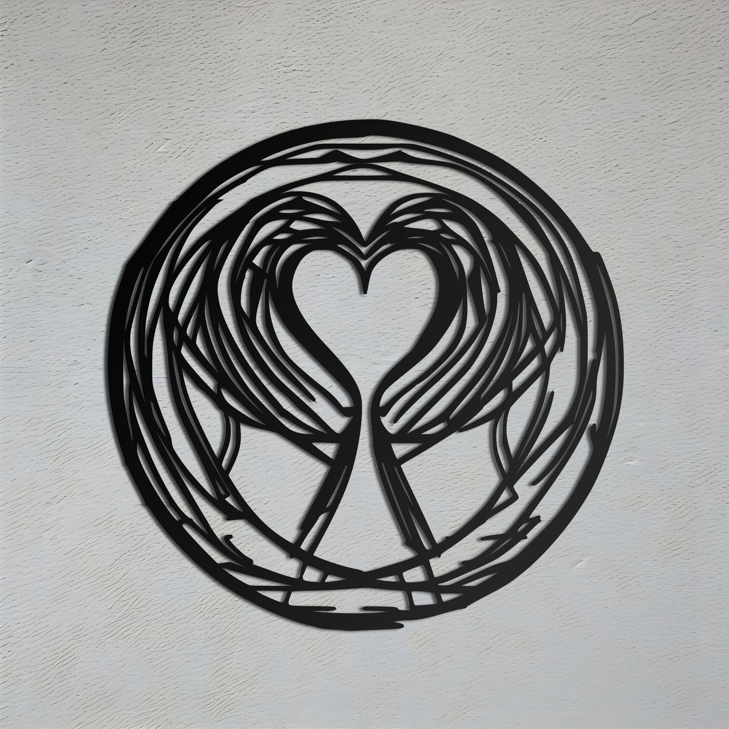 Stylized Heron Metal Wall Art with Symbolic Heart in Circle Design