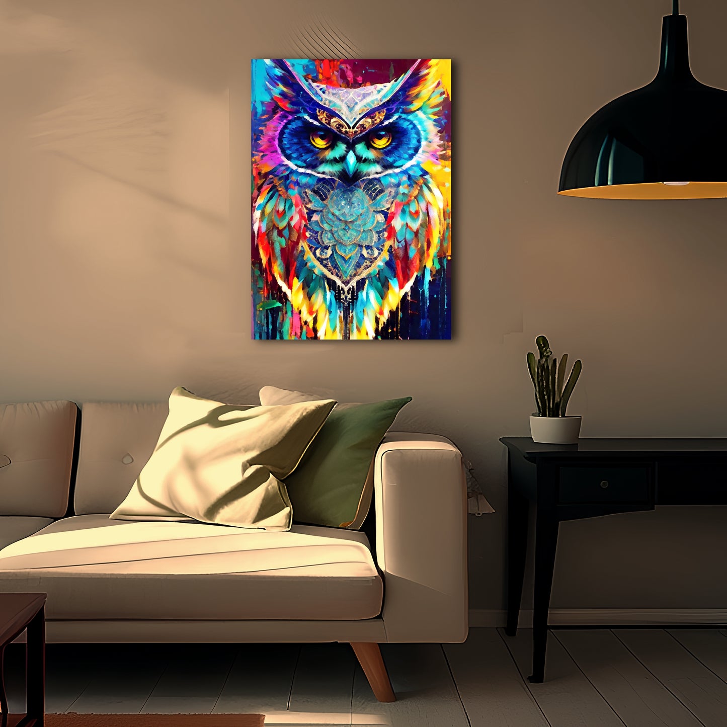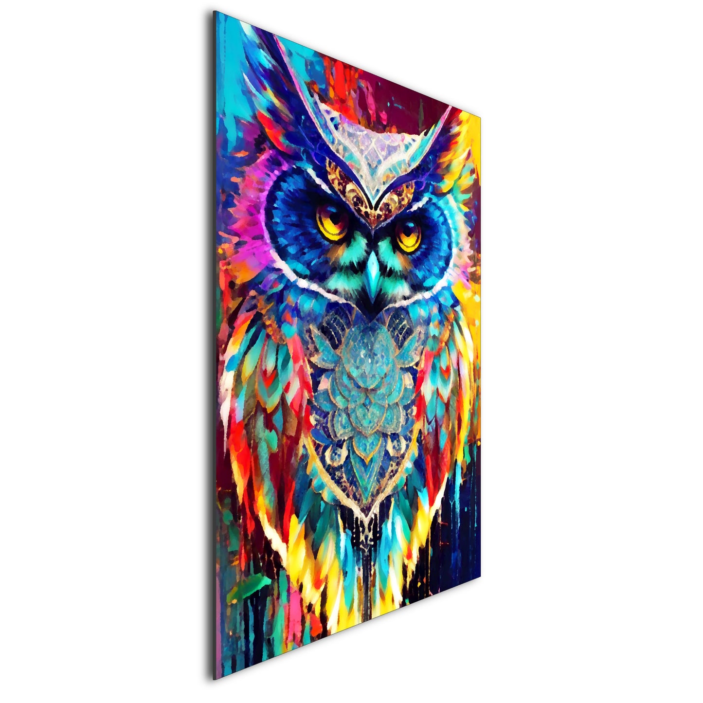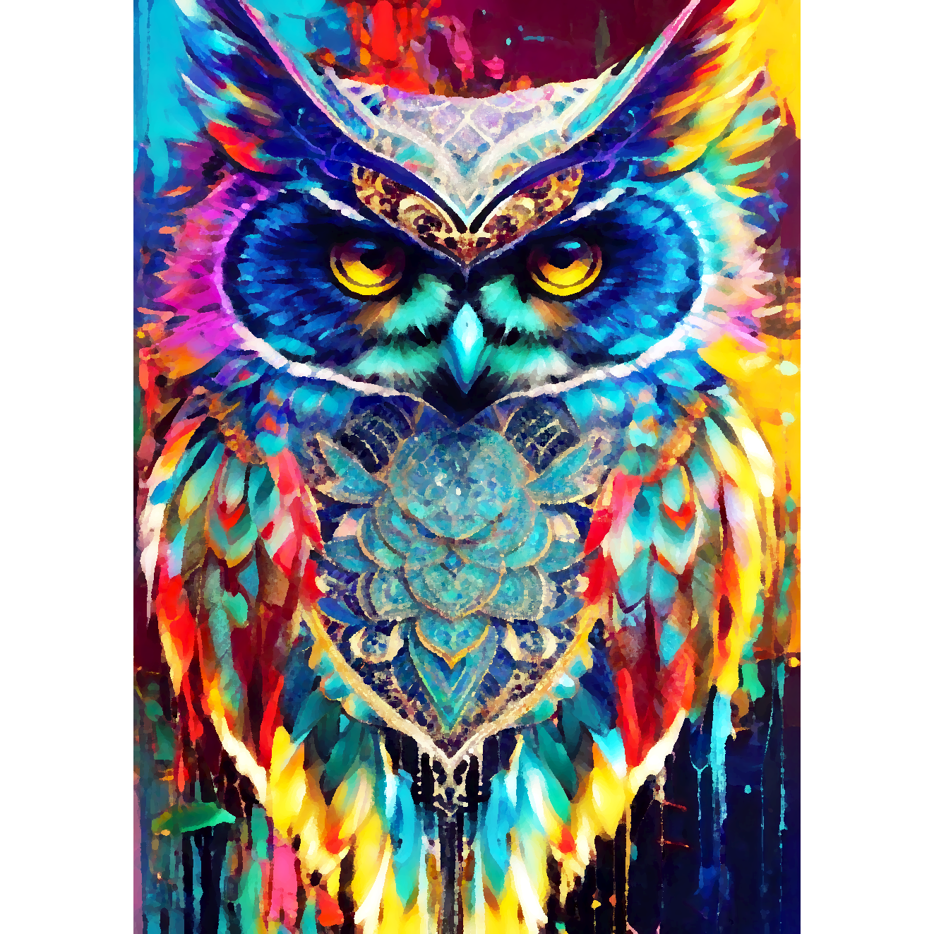 This stunning digital painting captures an owl with colorful feathers perched on a branch amidst a vibrant and psychedelic landscape. The rich and deep vibrant colors of the background contrast beautifully with the cerulean feathers of the owl. The artwork is highly detailed with colorful crystals and is perfect in high resolution. The artwork has a cute and adorable quality, and the overall composition presents a burst of color. The dusk setting adds to the chic and elegant feel of the piece.