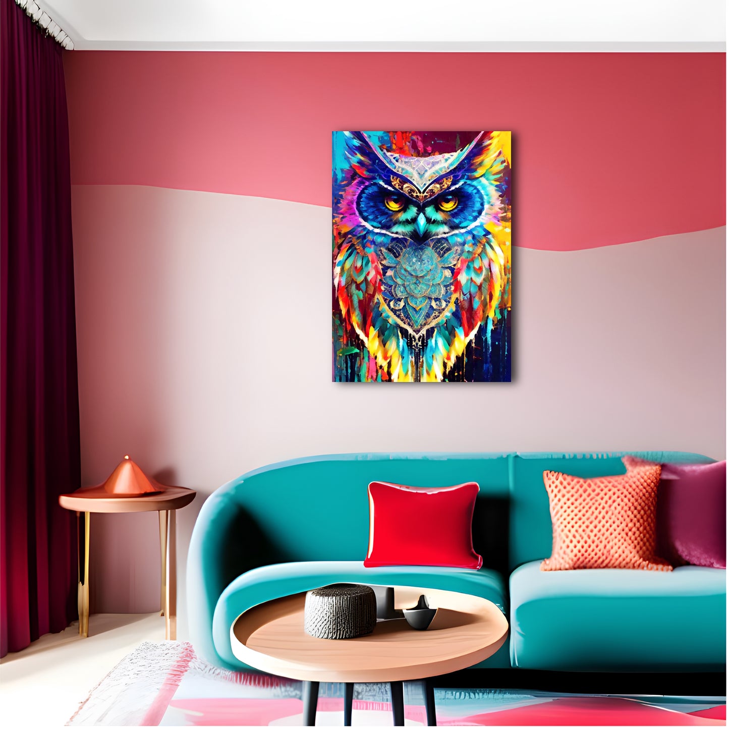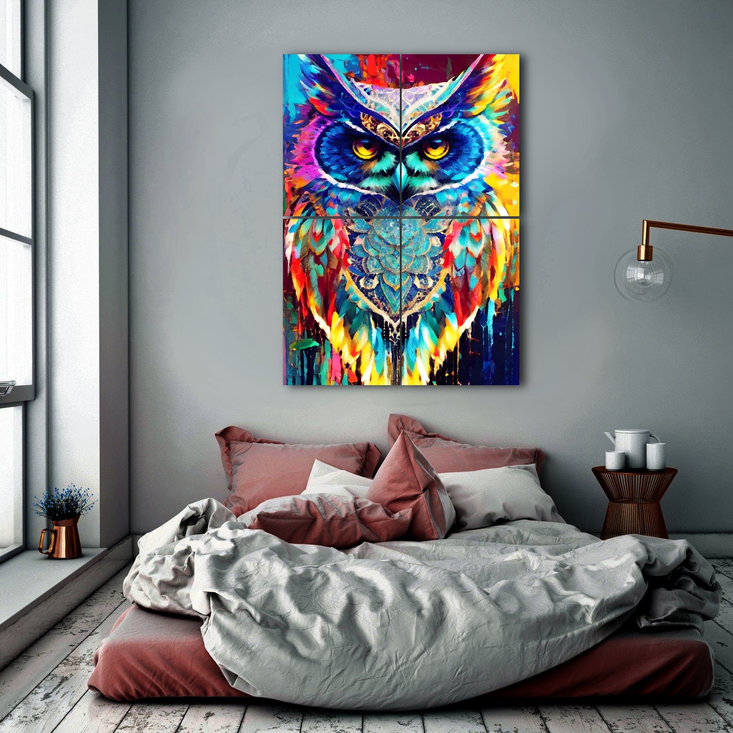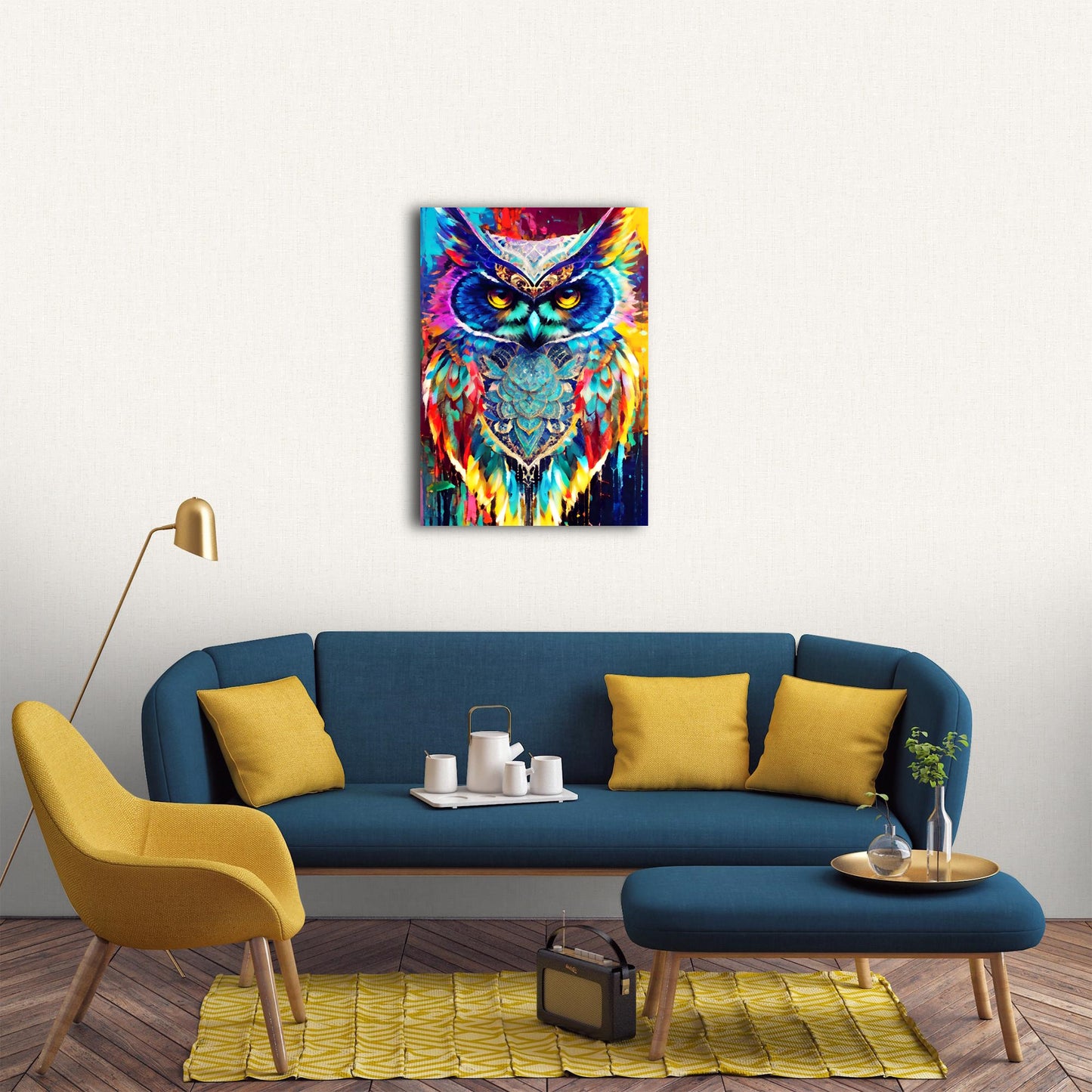 This stunning digital painting captures an owl with colorful feathers perched on a branch amidst a vibrant and psychedelic landscape. The rich and deep vibrant colors of the background contrast beautifully with the cerulean feathers of the owl. The artwork is highly detailed with colorful crystals and is perfect in high resolution. The artwork has a cute and adorable quality, and the overall composition presents a burst of color. The dusk setting adds to the chic and elegant feel of the piece.