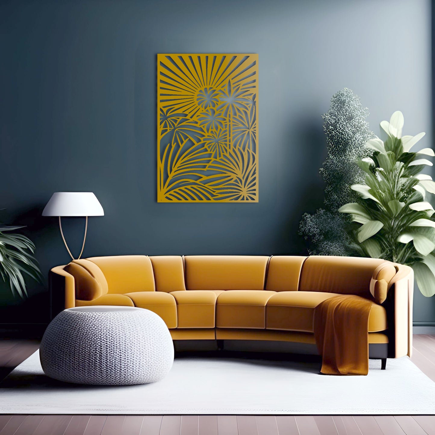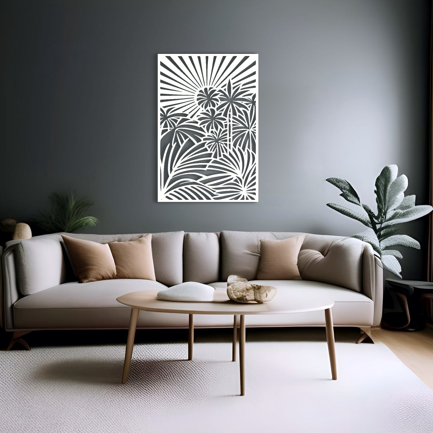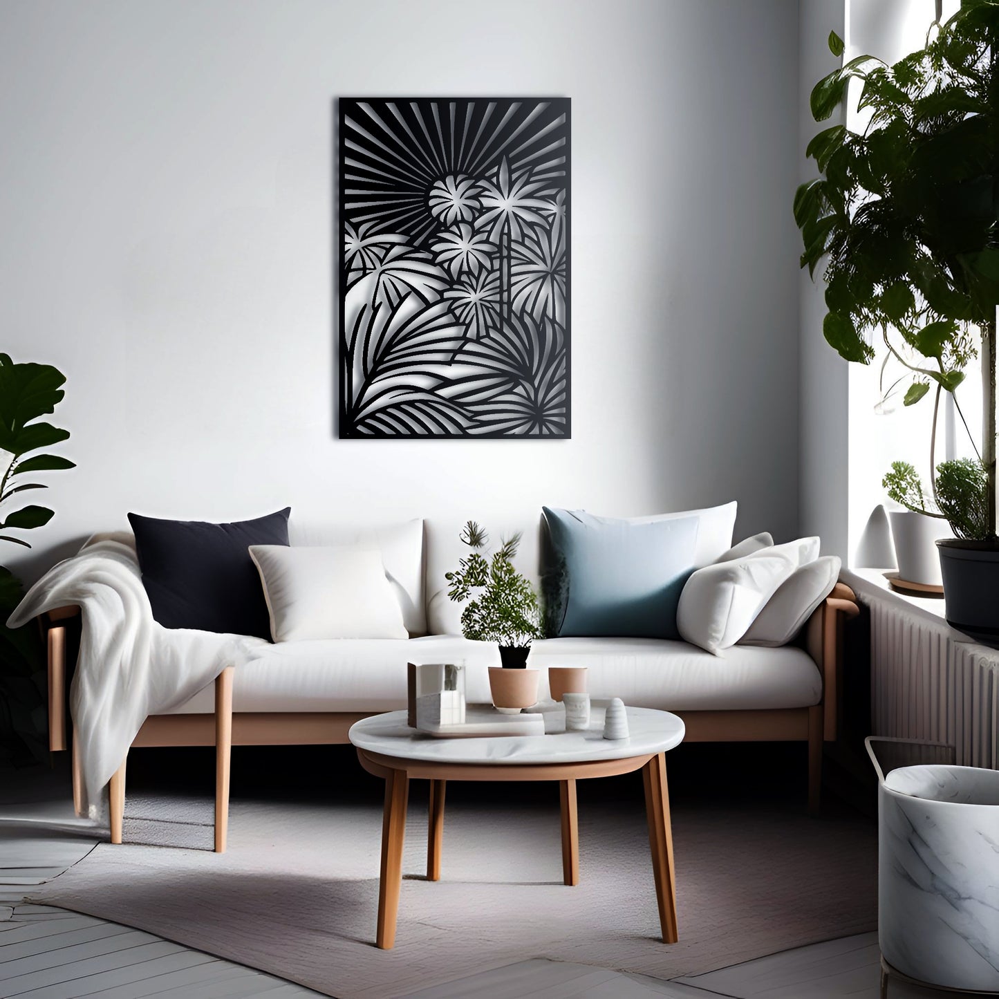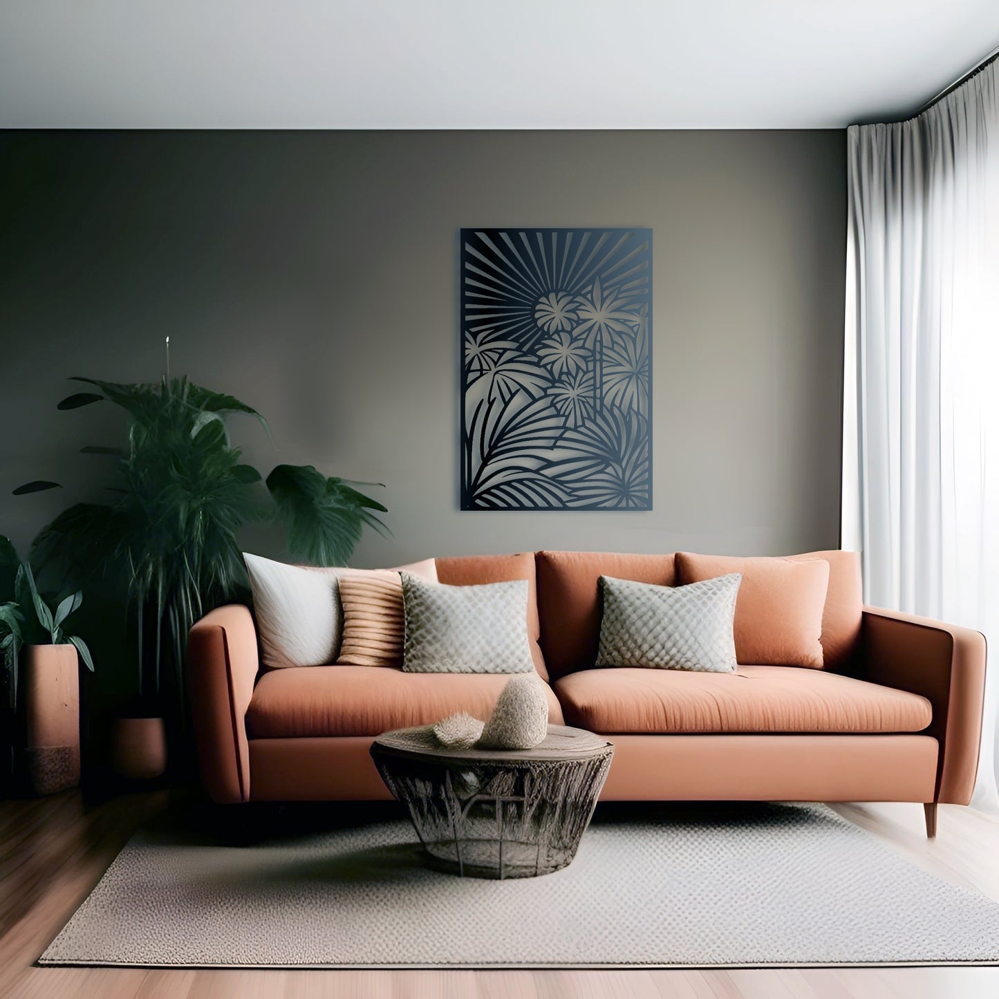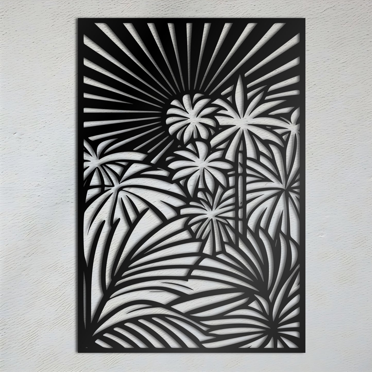 Bring the beauty of a tropical jungle to your home with this stunning metal wall art featuring a detailed abstract design of palm trees and jungle vines, all enclosed within a rectangular border. The sun shining above adds a touch of warmth and brightness to the scene.