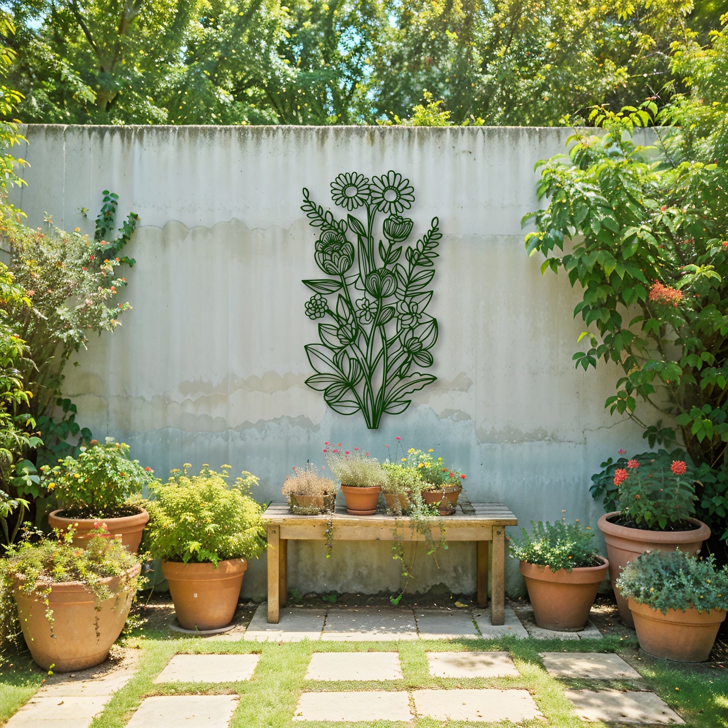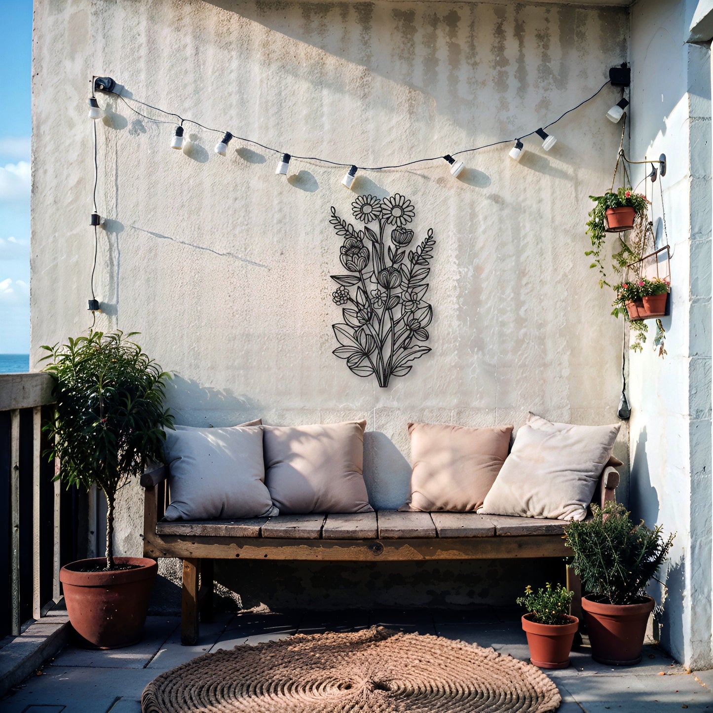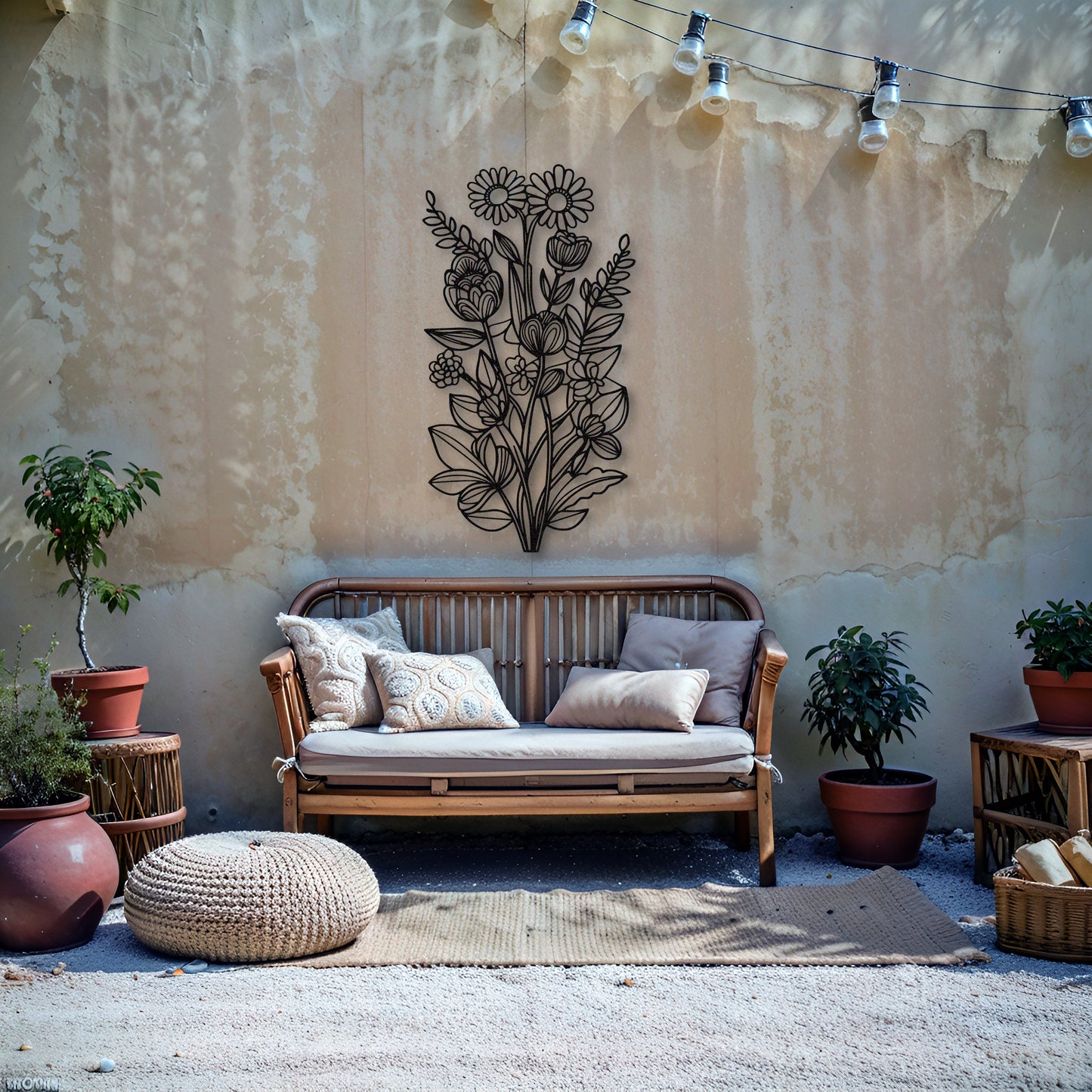 Bring nature indoors with this Vertical Floral Bouquet Metal Wall Art, featuring a delicate arrangement of flowers and leaves in a vertical steel design. Perfect for enhancing narrow wall spaces in your living room, bedroom, or as a charming outdoor accent on a patio or garden wall. This handcrafted metal décor combines modern elegance with timeless beauty.
