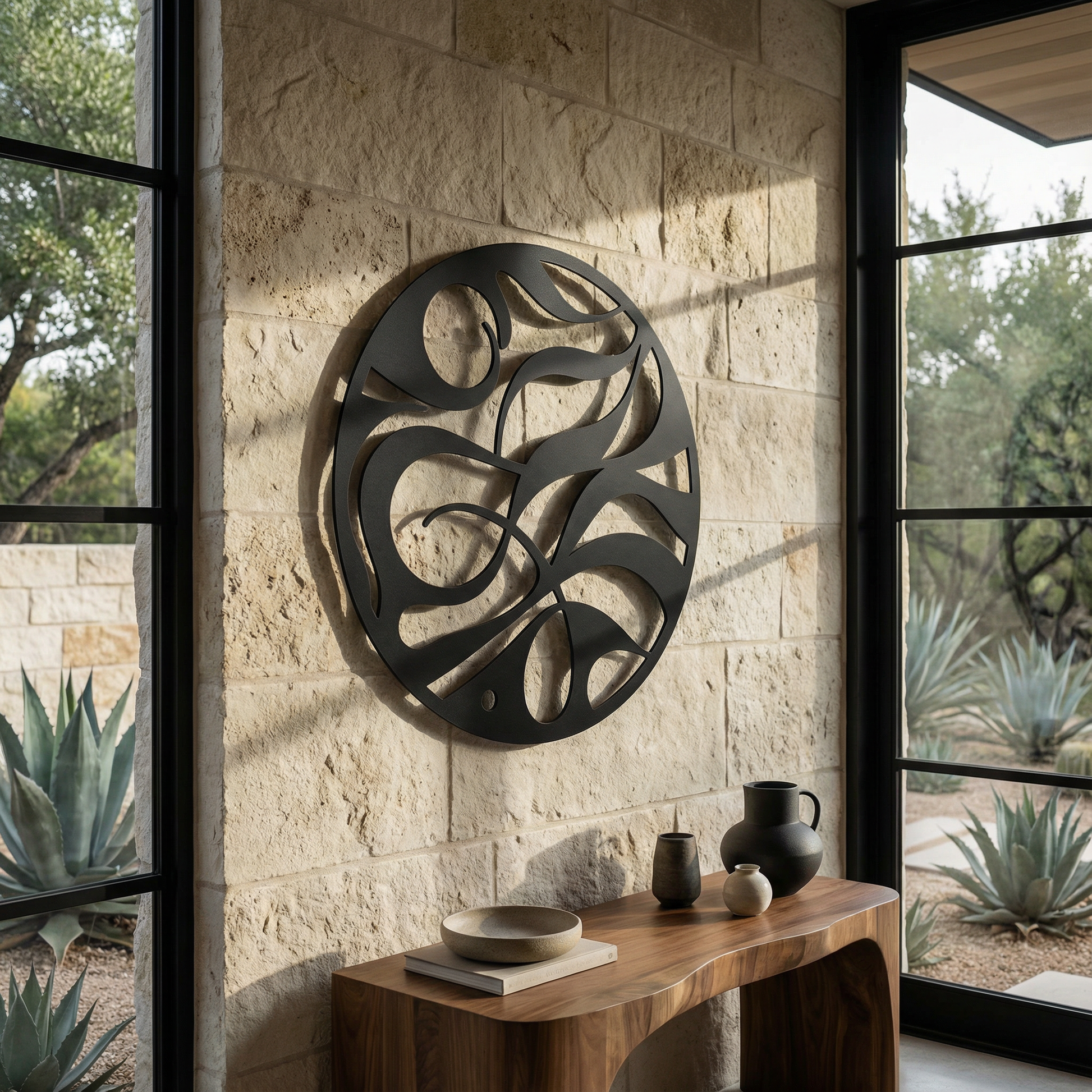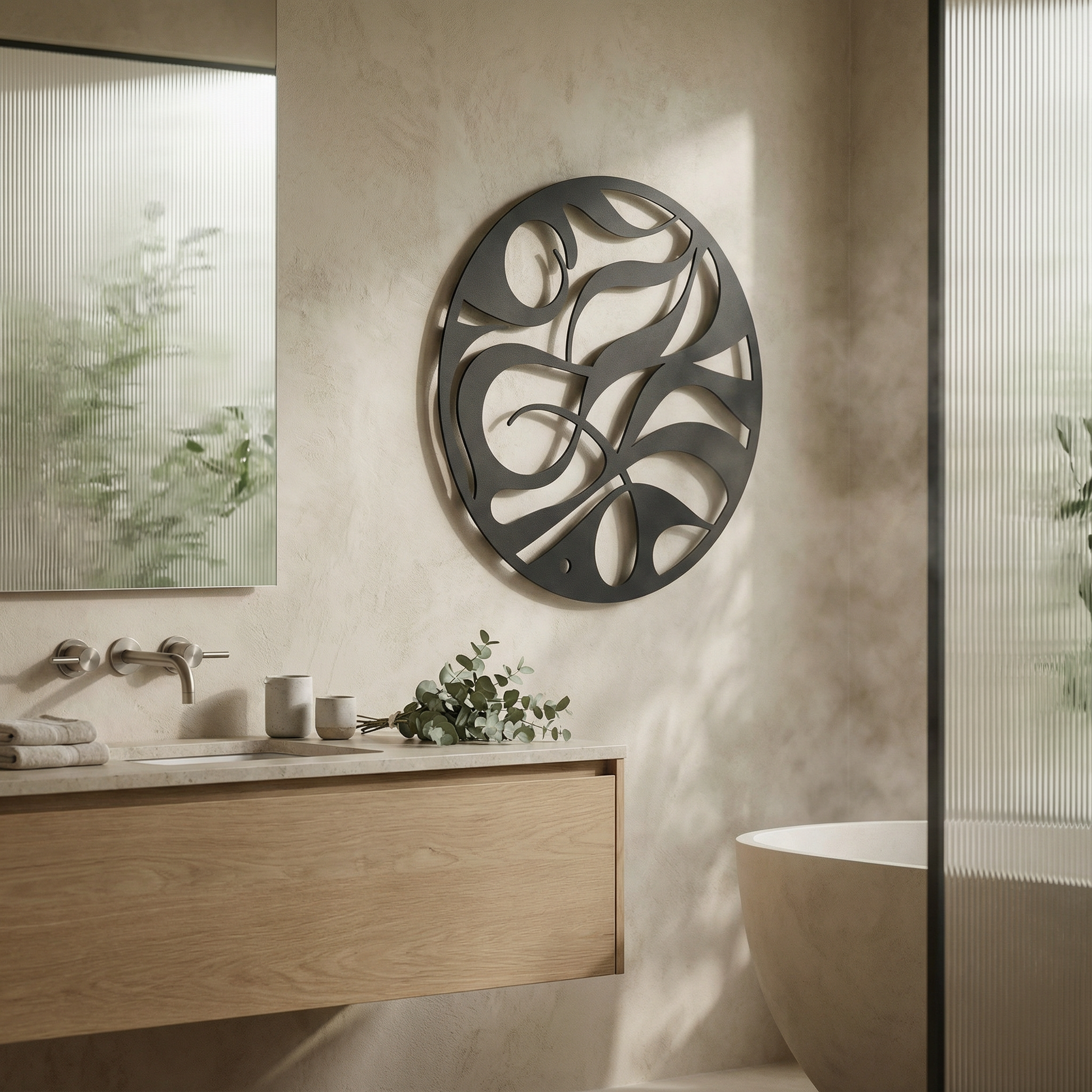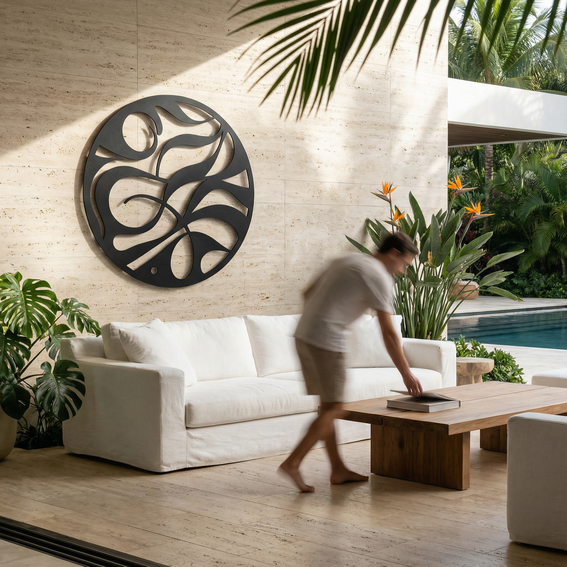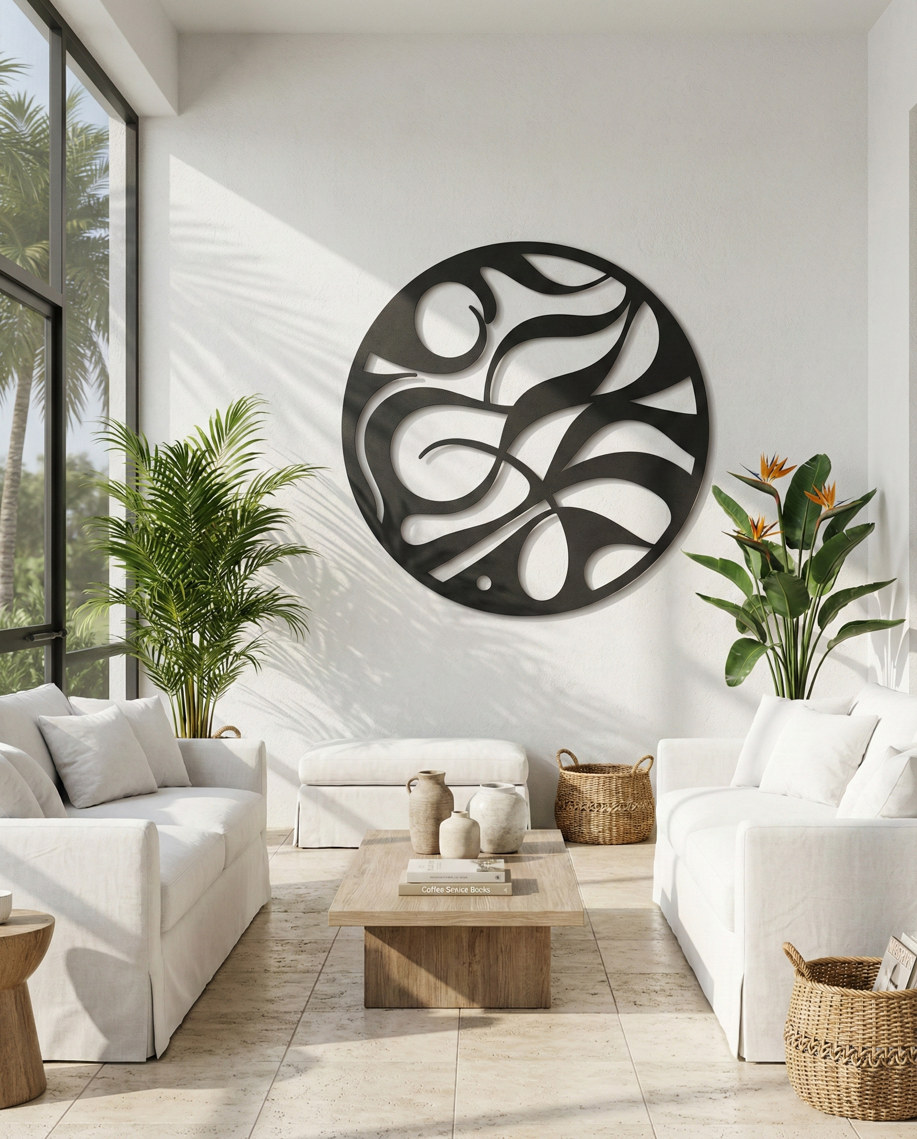 In metal, the composition is defined through a strong circular boundary that stabilizes the flowing interior shapes. Leaf cutouts and curved channels are formed as clean negative space, allowing light to pass through and sharpen the floating shadow effect. The thick line weight keeps the silhouette crisp while the interior openings preserve air and motion.