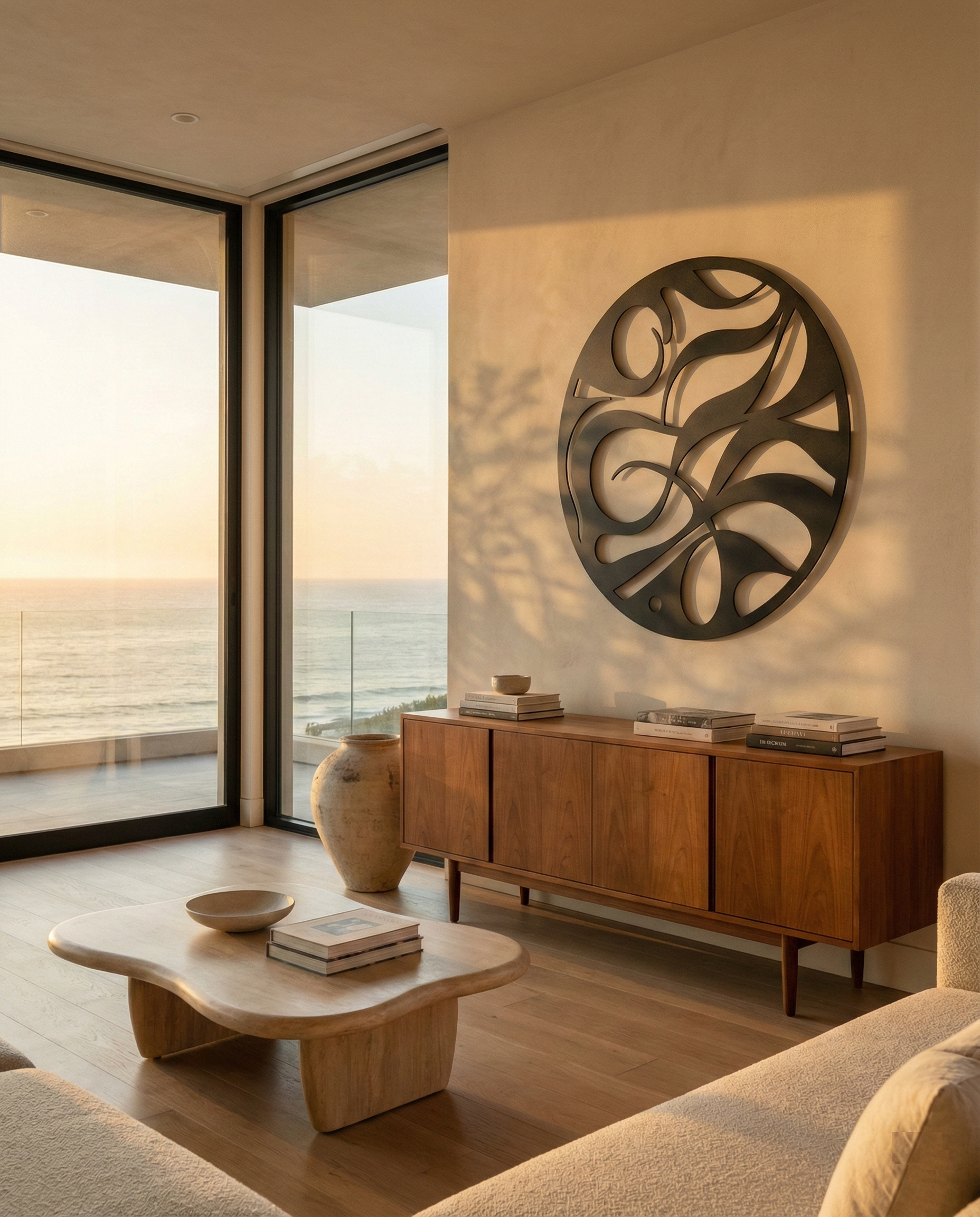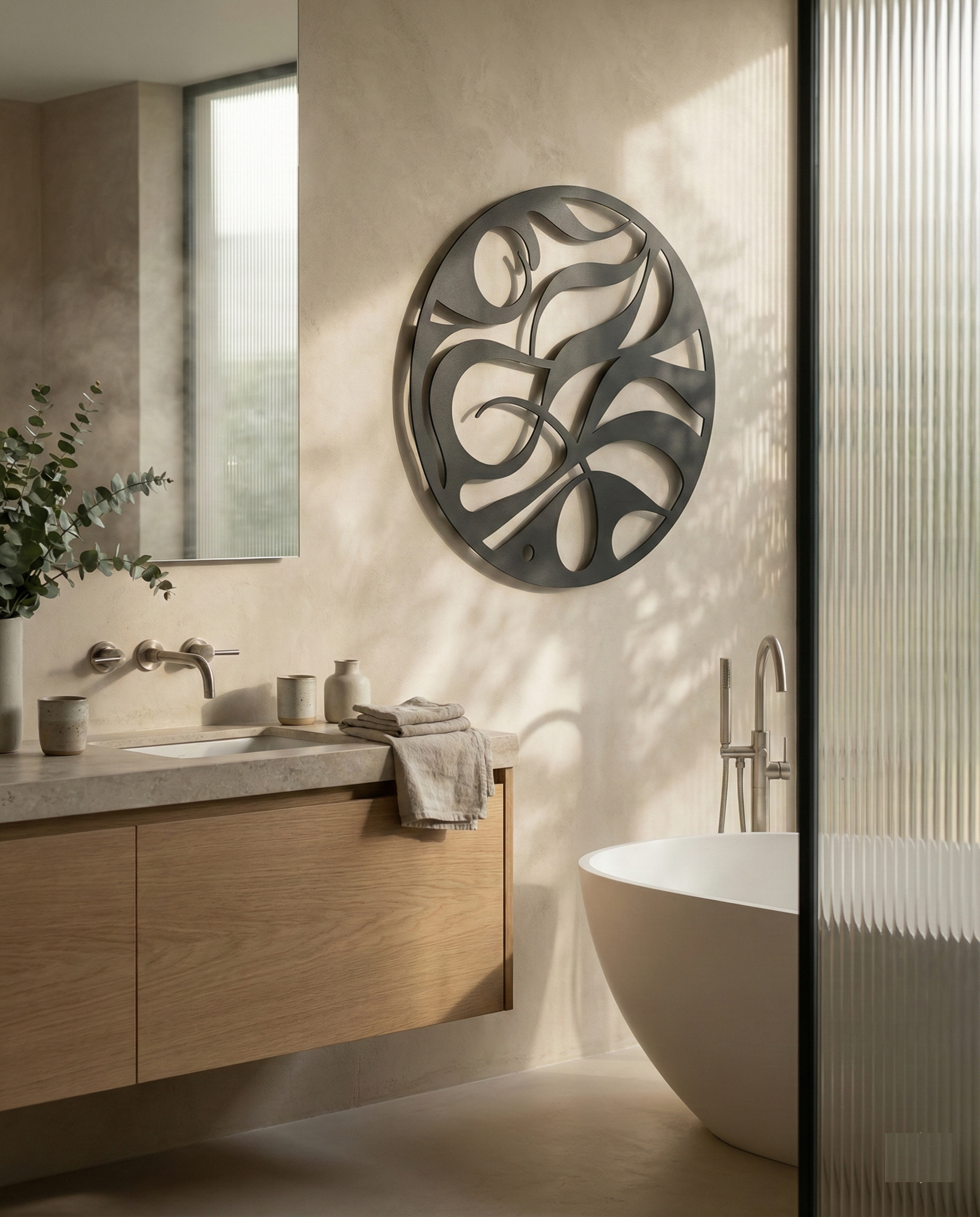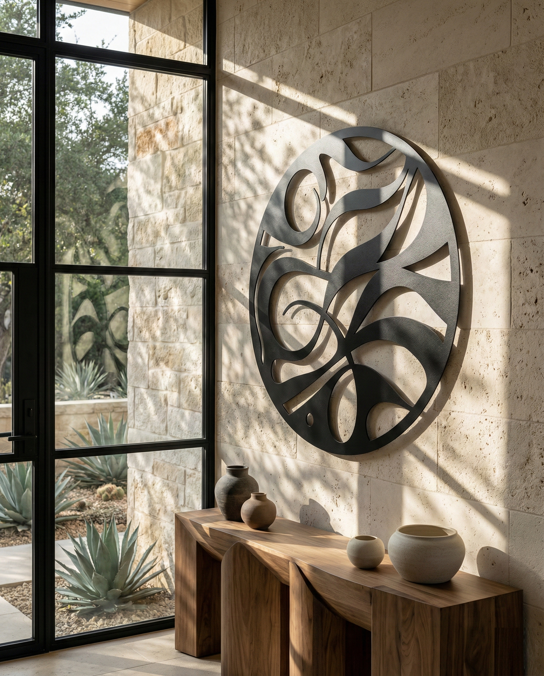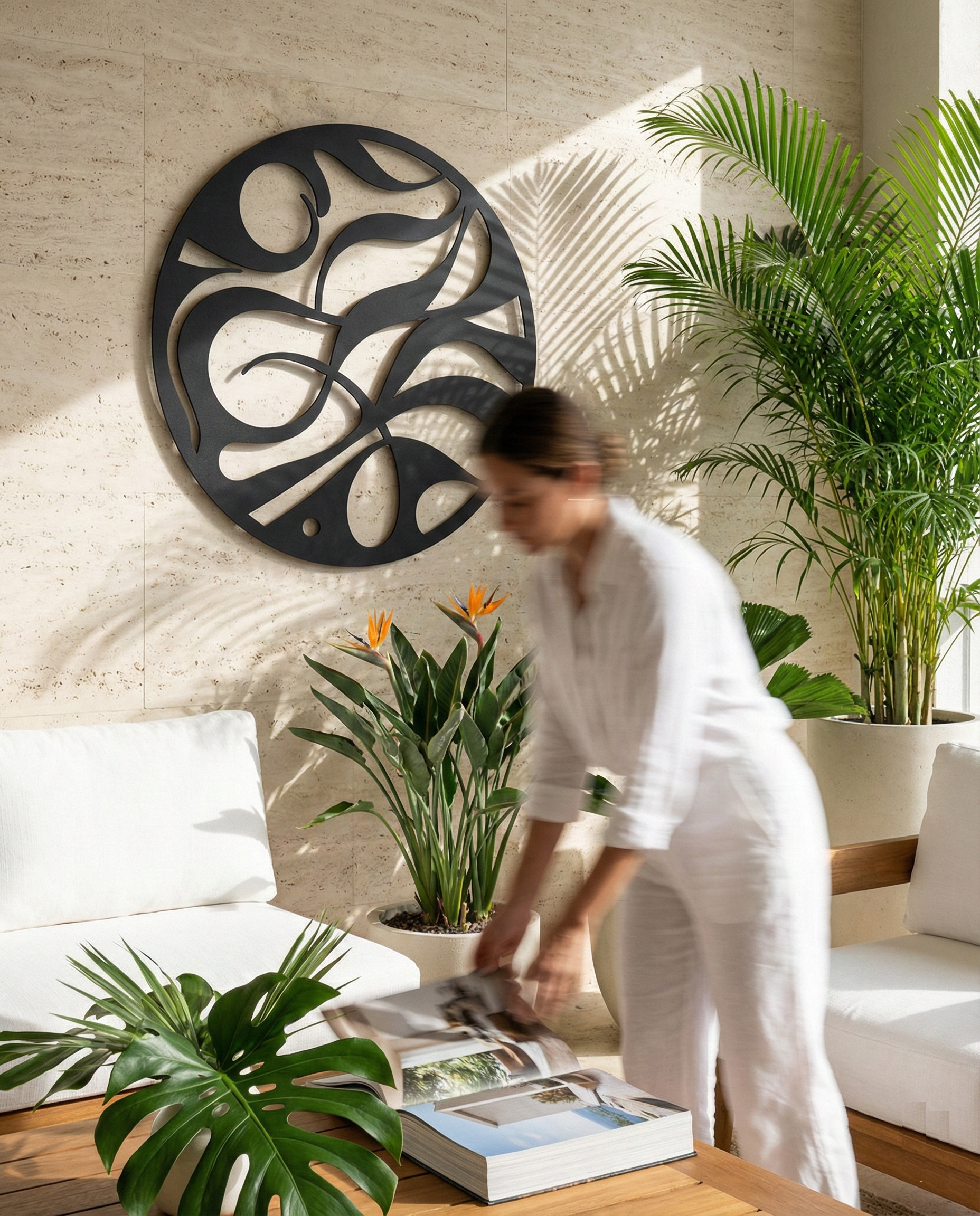 In metal, the composition is defined through a strong circular boundary that stabilizes the flowing interior shapes. Leaf cutouts and curved channels are formed as clean negative space, allowing light to pass through and sharpen the floating shadow effect. The thick line weight keeps the silhouette crisp while the interior openings preserve air and motion.