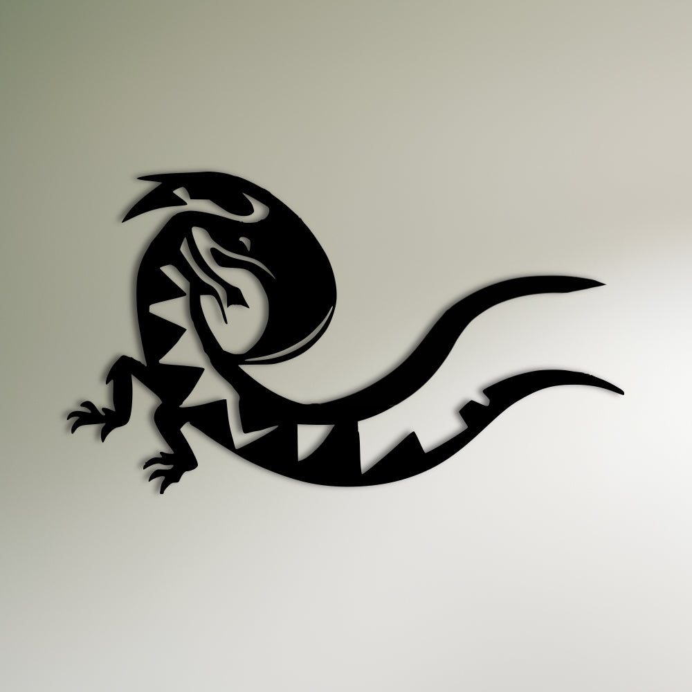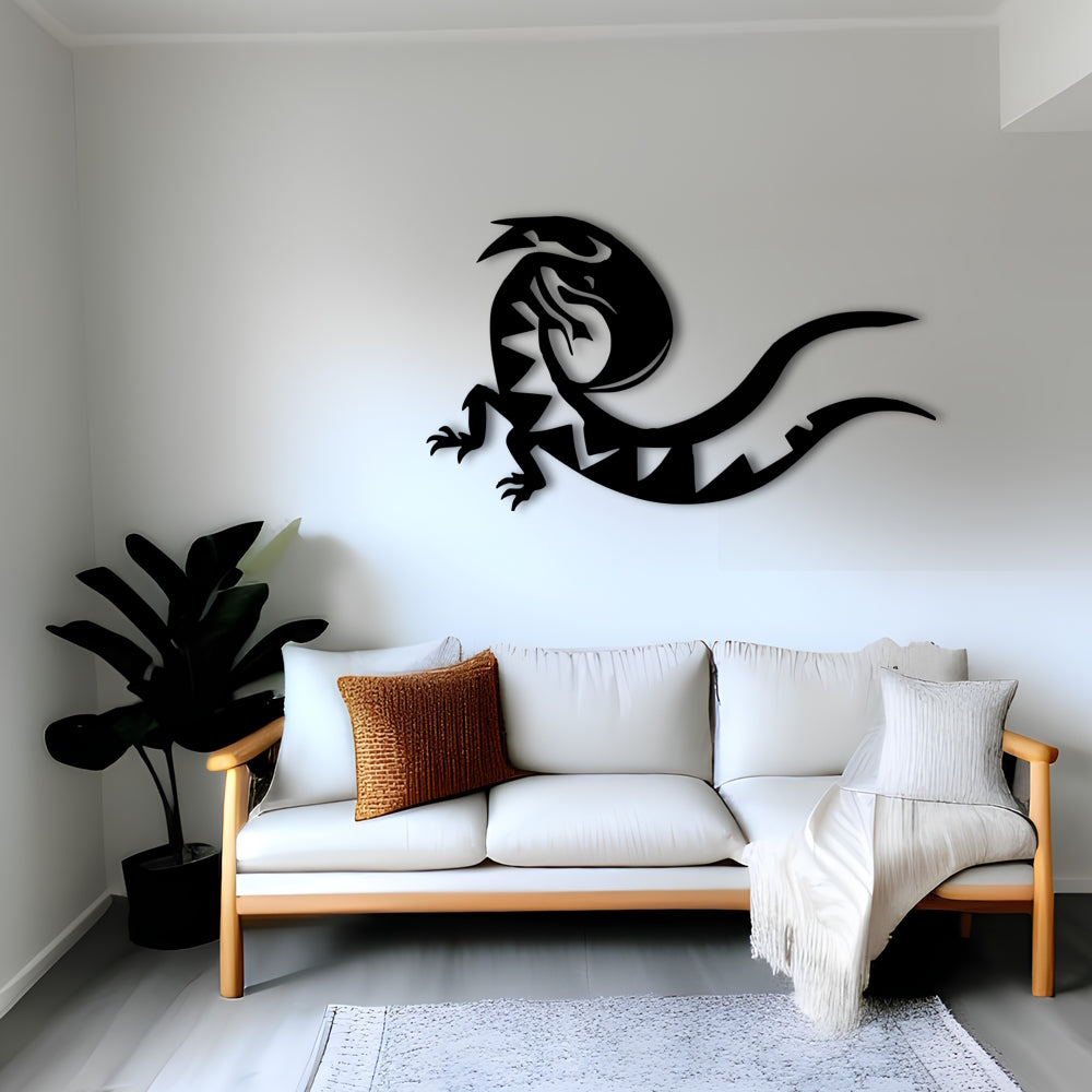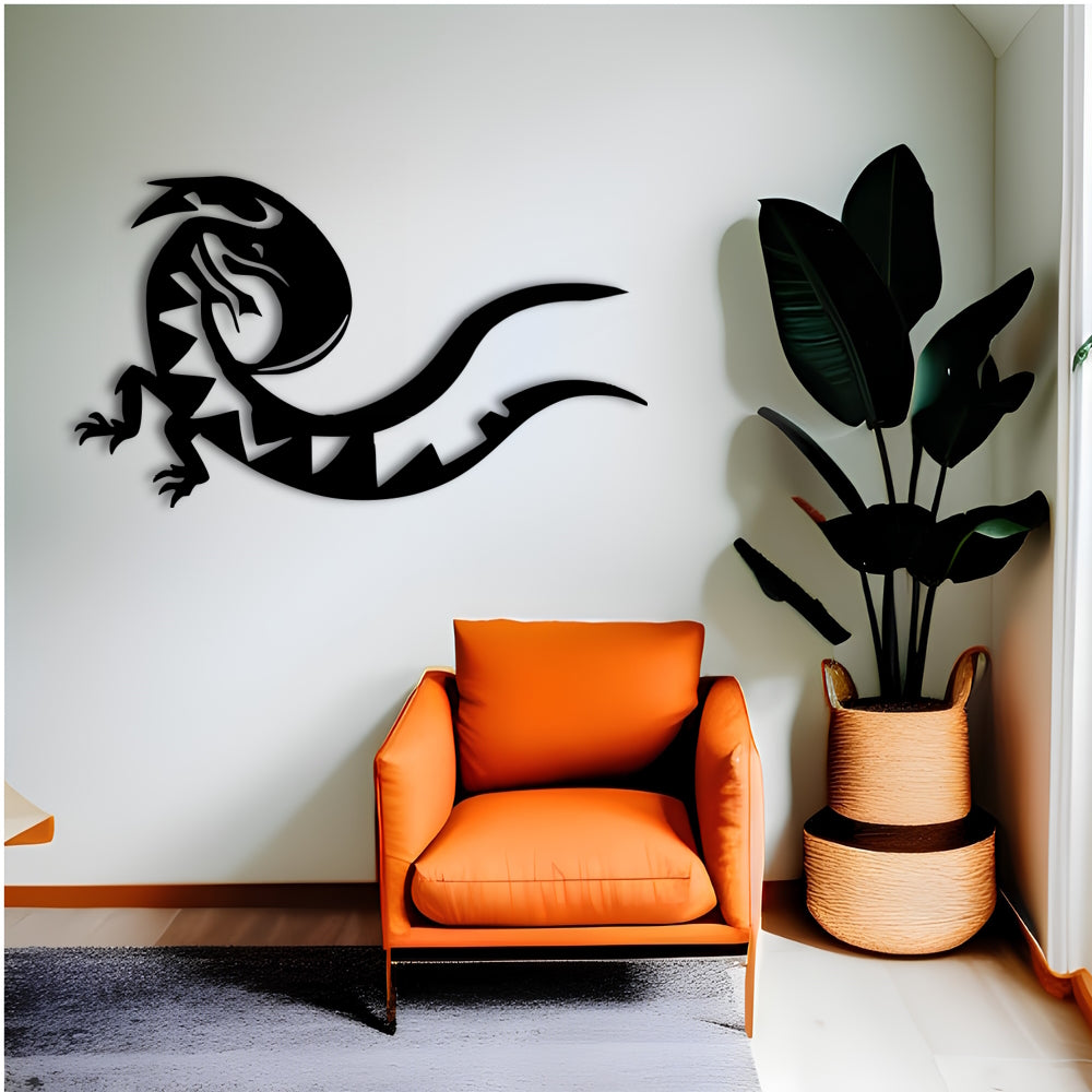 Add a touch of mythical charm to your space with this tribal dragon inspired metal wall art. The intricate design features a monster lizard with intricate tribal patterns and a fierce expression. The high-quality metal construction ensures durability, making it perfect for both indoor and outdoor use. This wall art is sure to make a statement and add a bold, unique touch to any room.