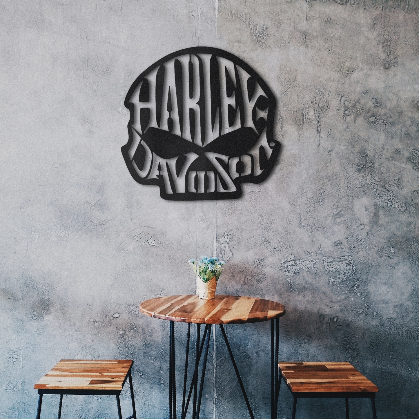 The "Skull Harley Davidson Metal Wall Art" is a metal wall decor piece that features a skull head design and Harley Davidson lettering. It is intended as a gift for a boyfriend who is a biker or a fan of Harley Davidson motorcycles.