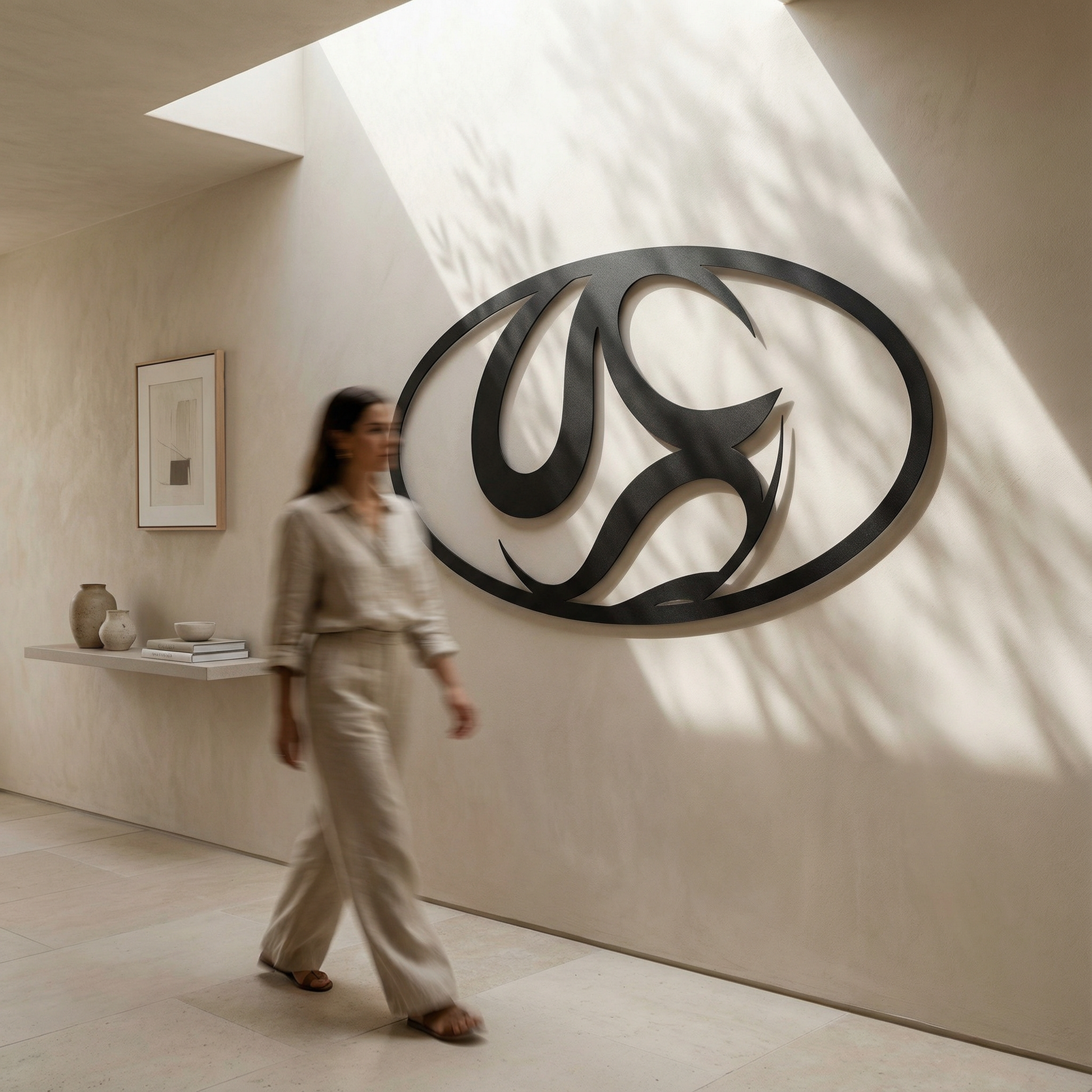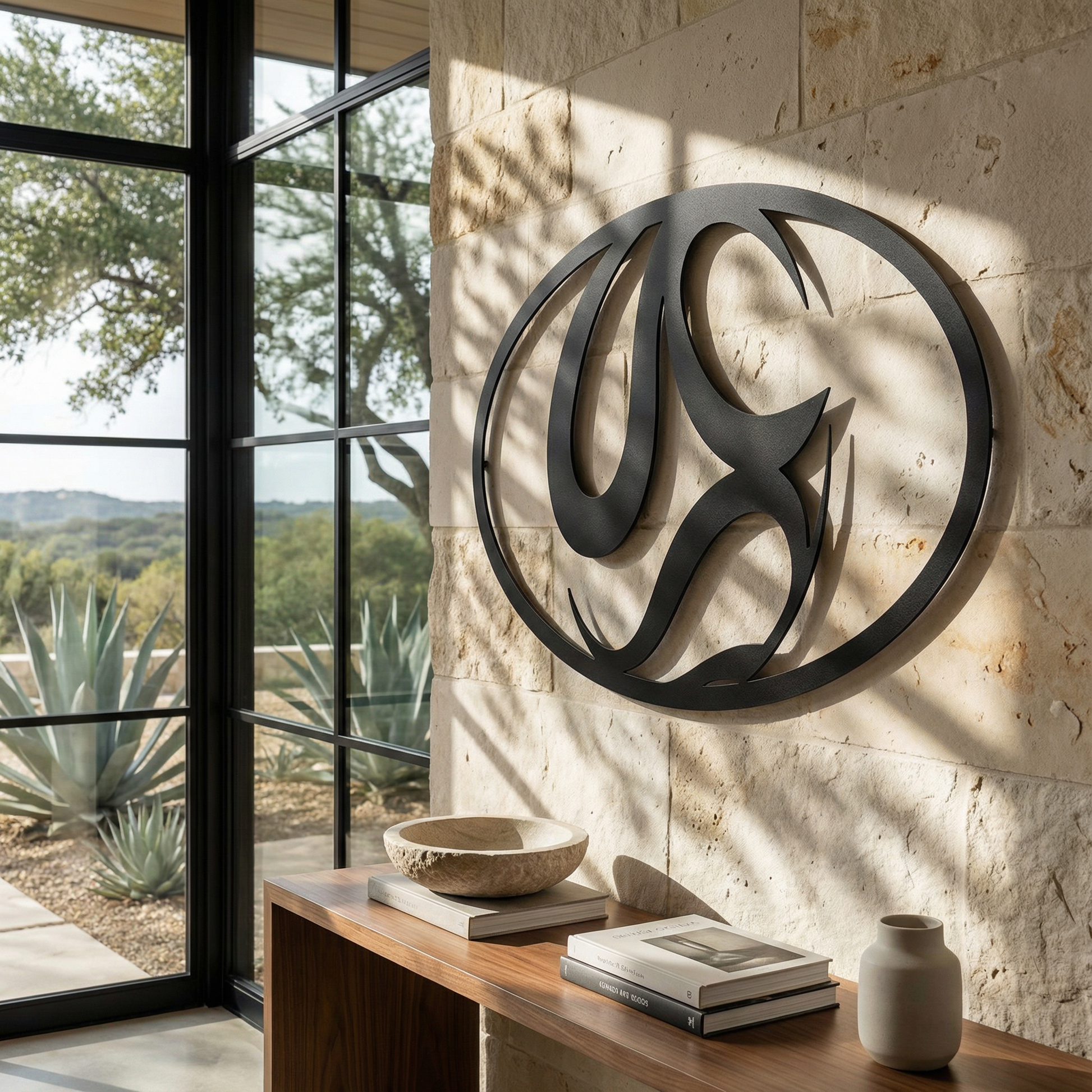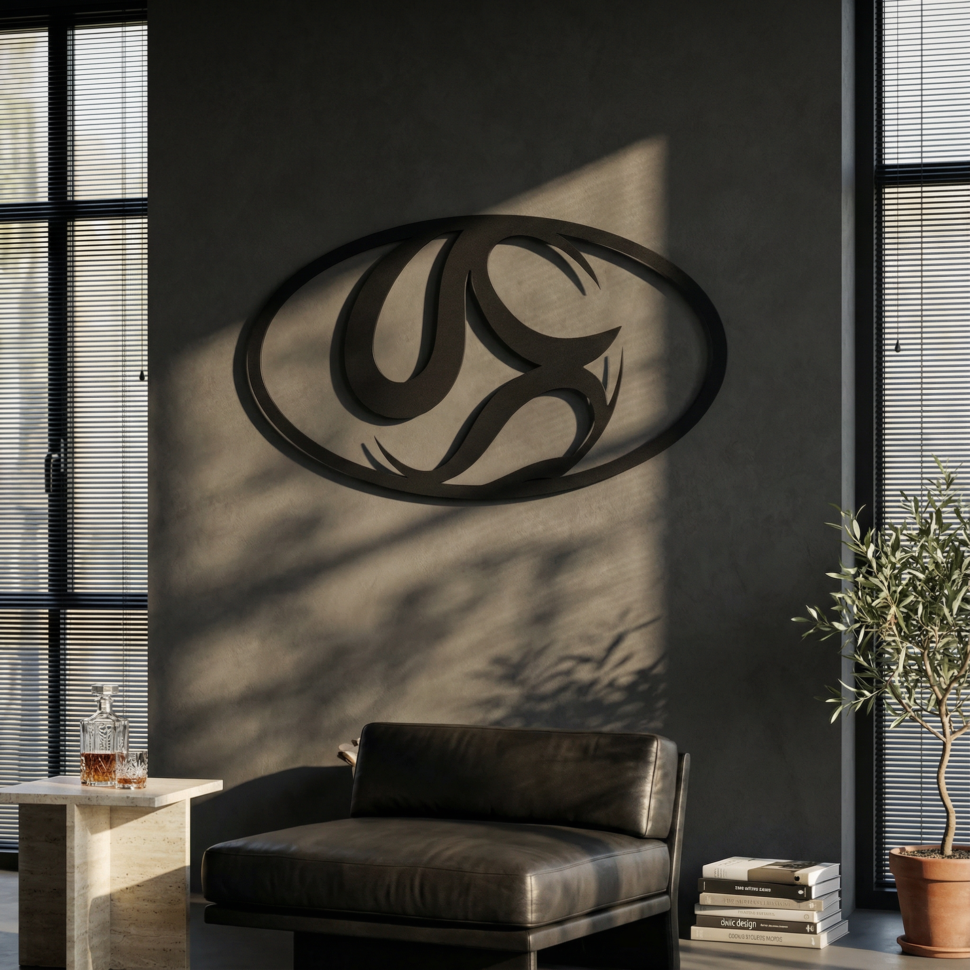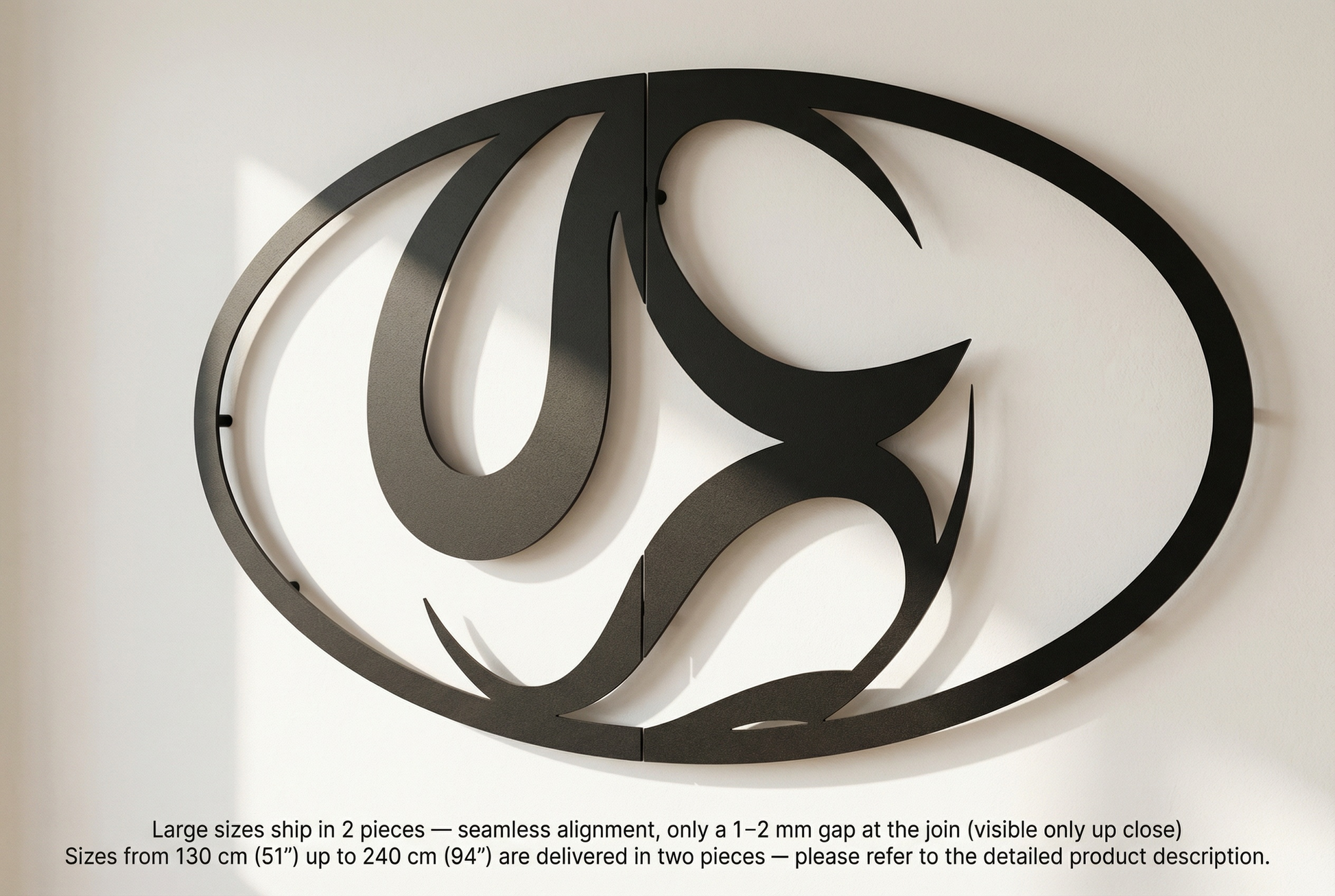The design is translated into powder coated metal through thick, confident curves and carefully preserved negative space. The interlocking shapes are defined by smooth transitions and tapered points, allowing shadow and outline to do equal work as the piece floats slightly off the wall.