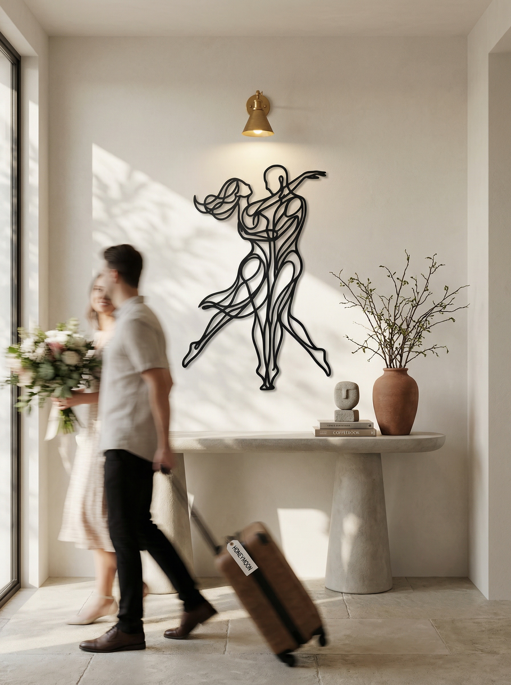 In metal, the design is carried by confident line weight and purposeful overlaps that create depth without shading. The extended stride and lifted arm generate forward momentum, while the interlaced torso lines keep the center grounded. The floating offset amplifies the choreography with shadow, turning every curve into a second, softer contour behind the primary stroke.
