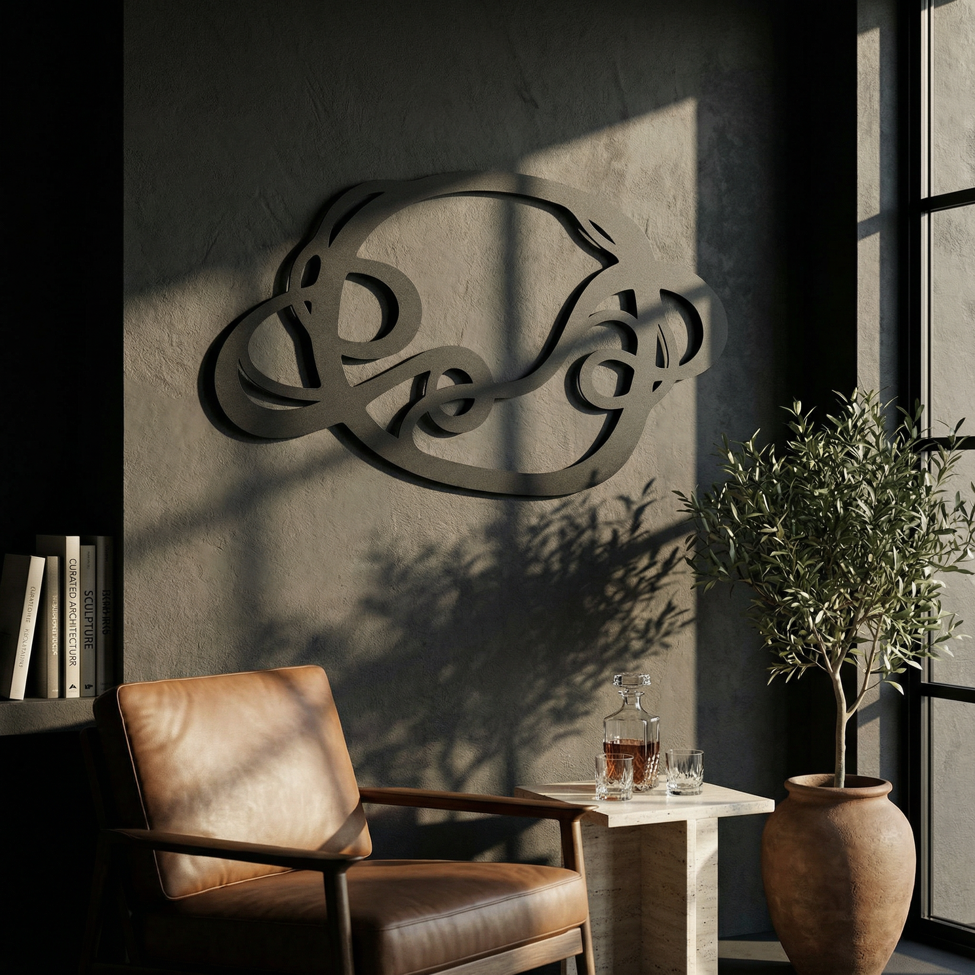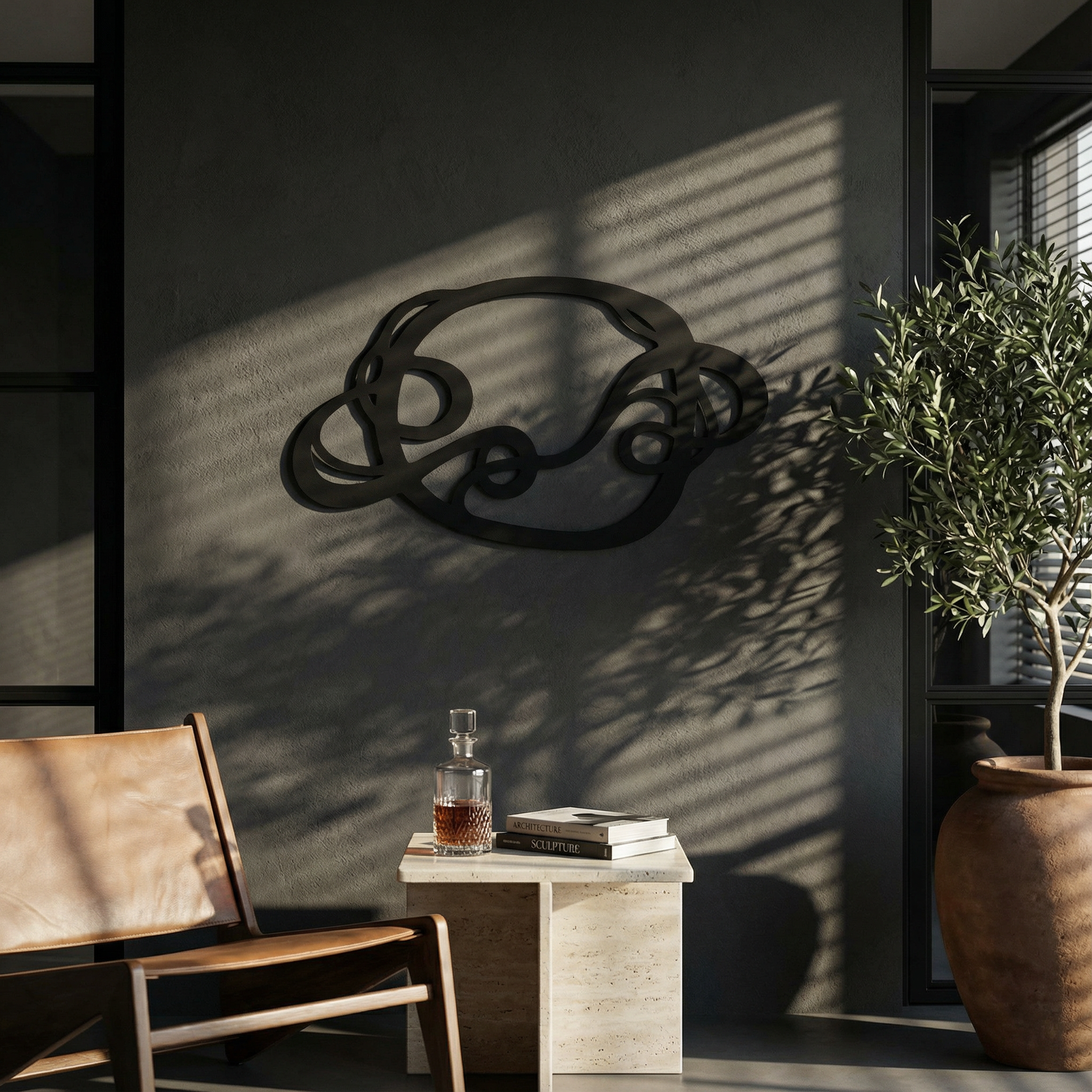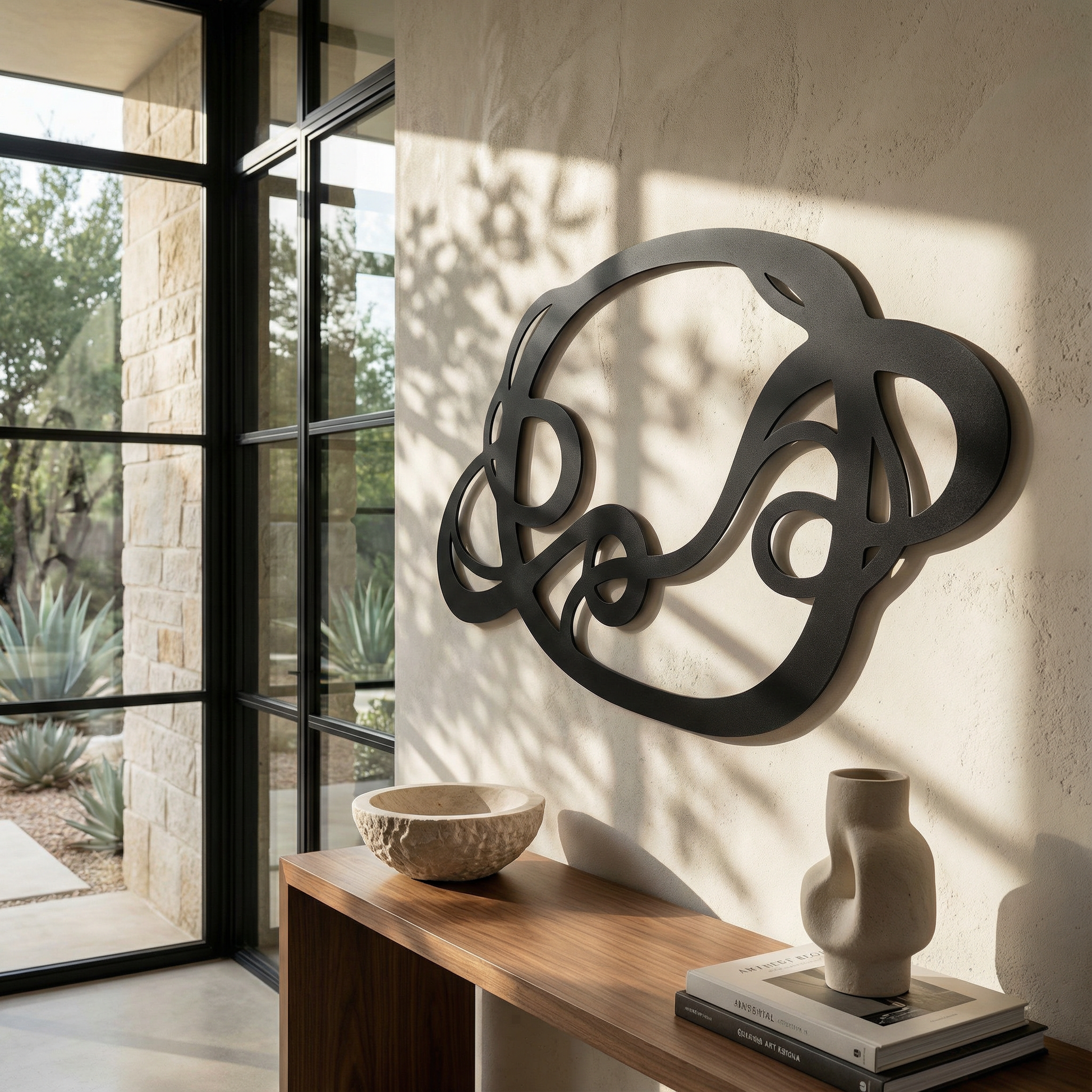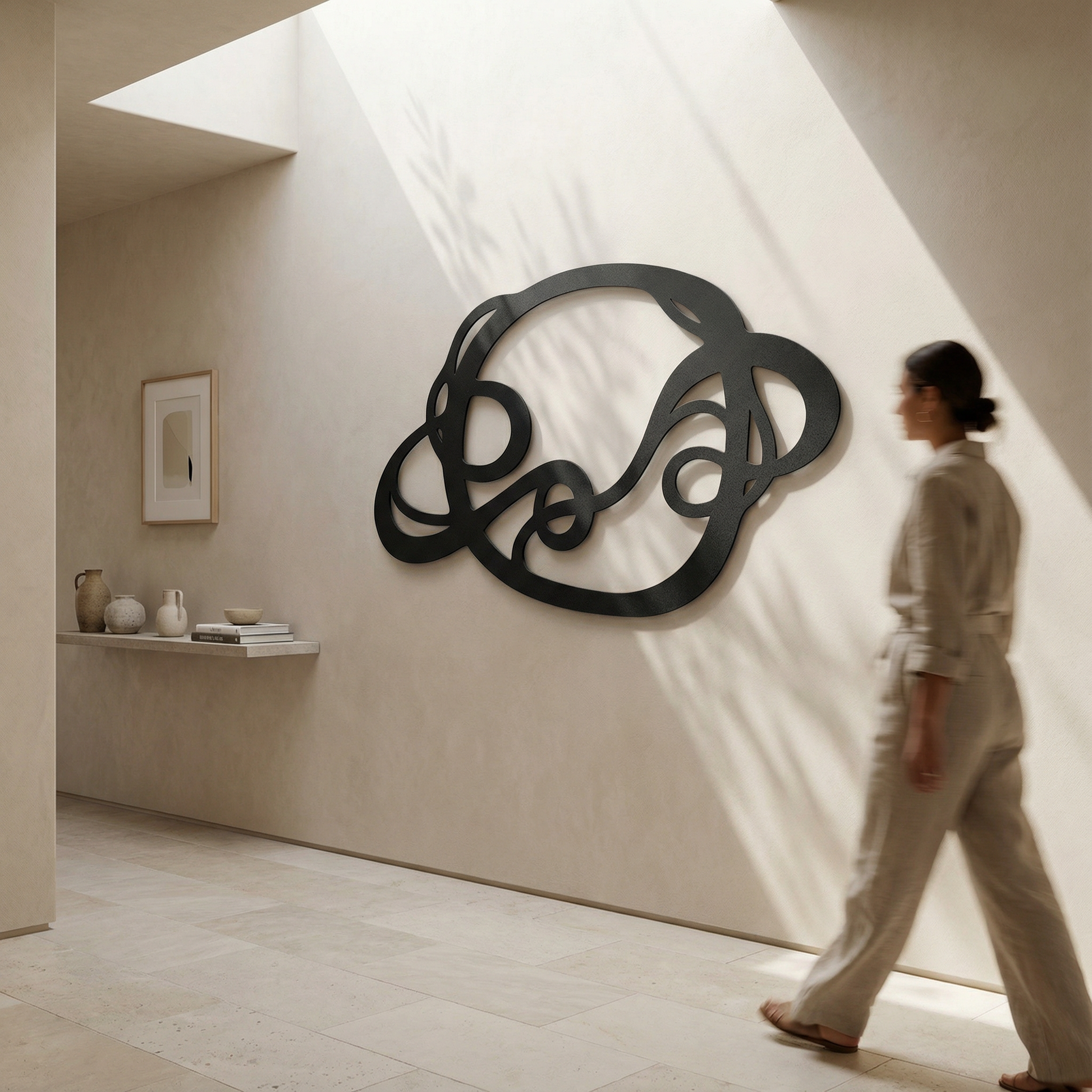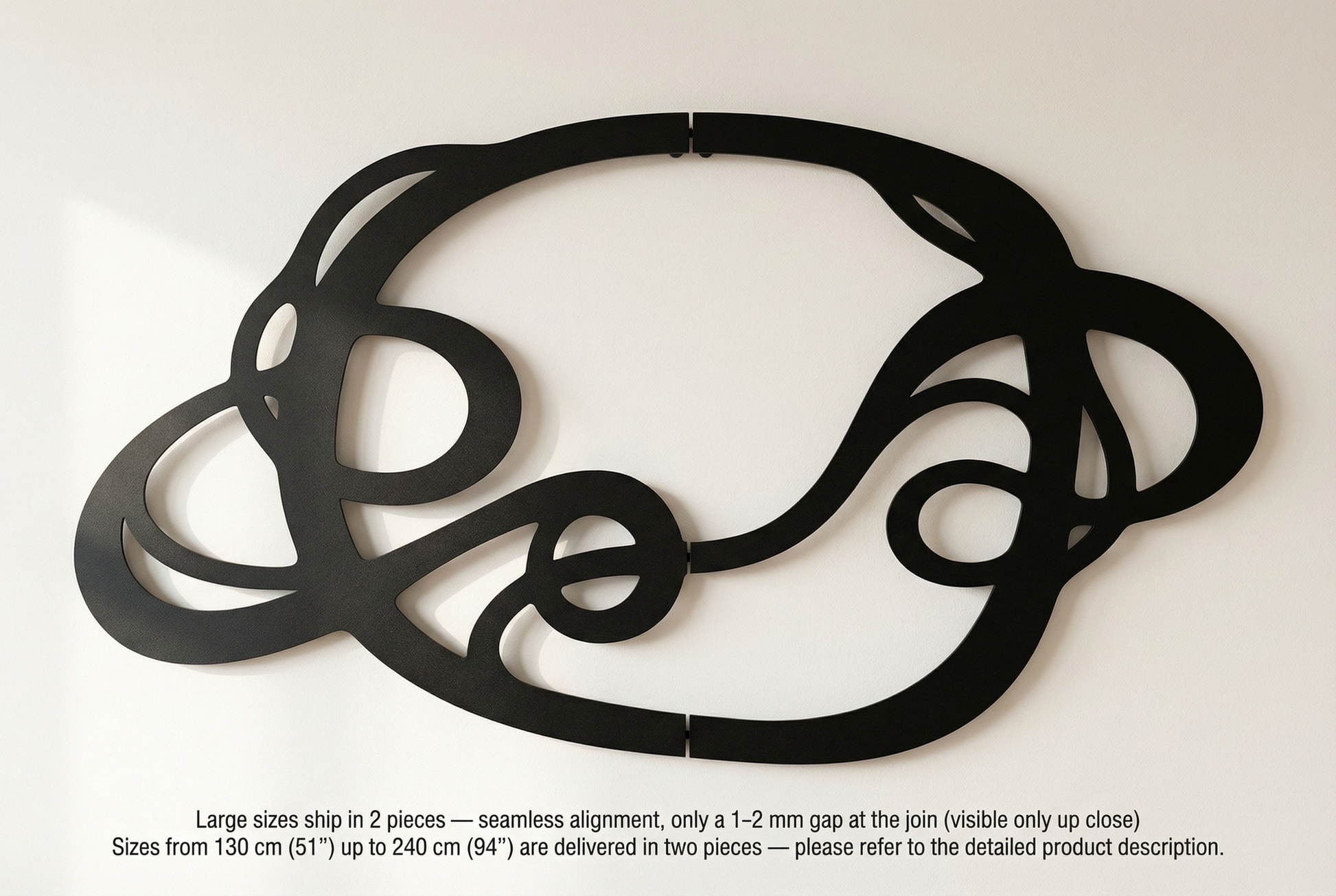 The design is translated into powder coated metal through thick ribbon-like lines and carefully preserved negative space that keeps the interlace readable. The rounded turns and looped cutouts are engineered to hold visual weight without feeling heavy, while the floating offset adds a shadow outline that emphasizes every crossing.