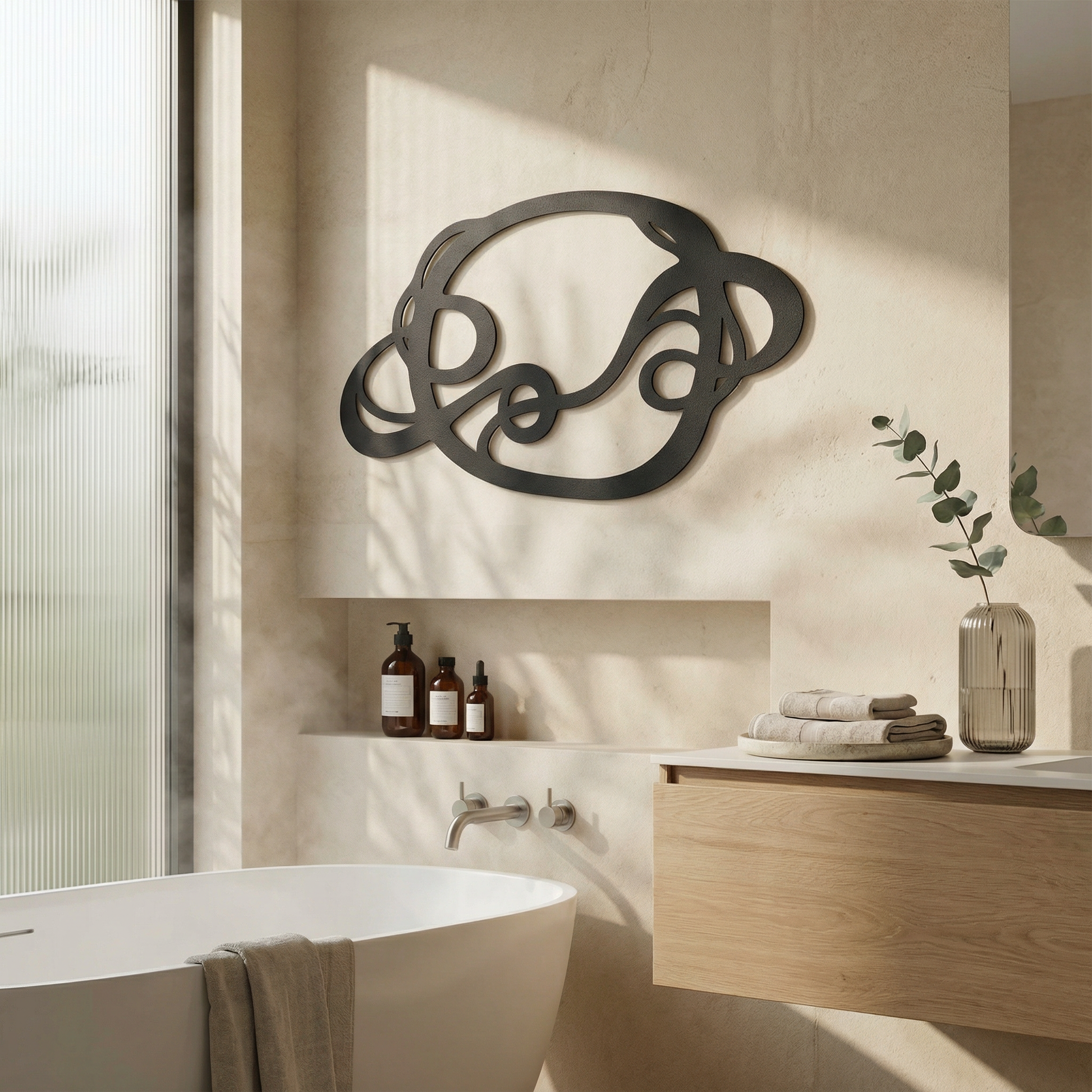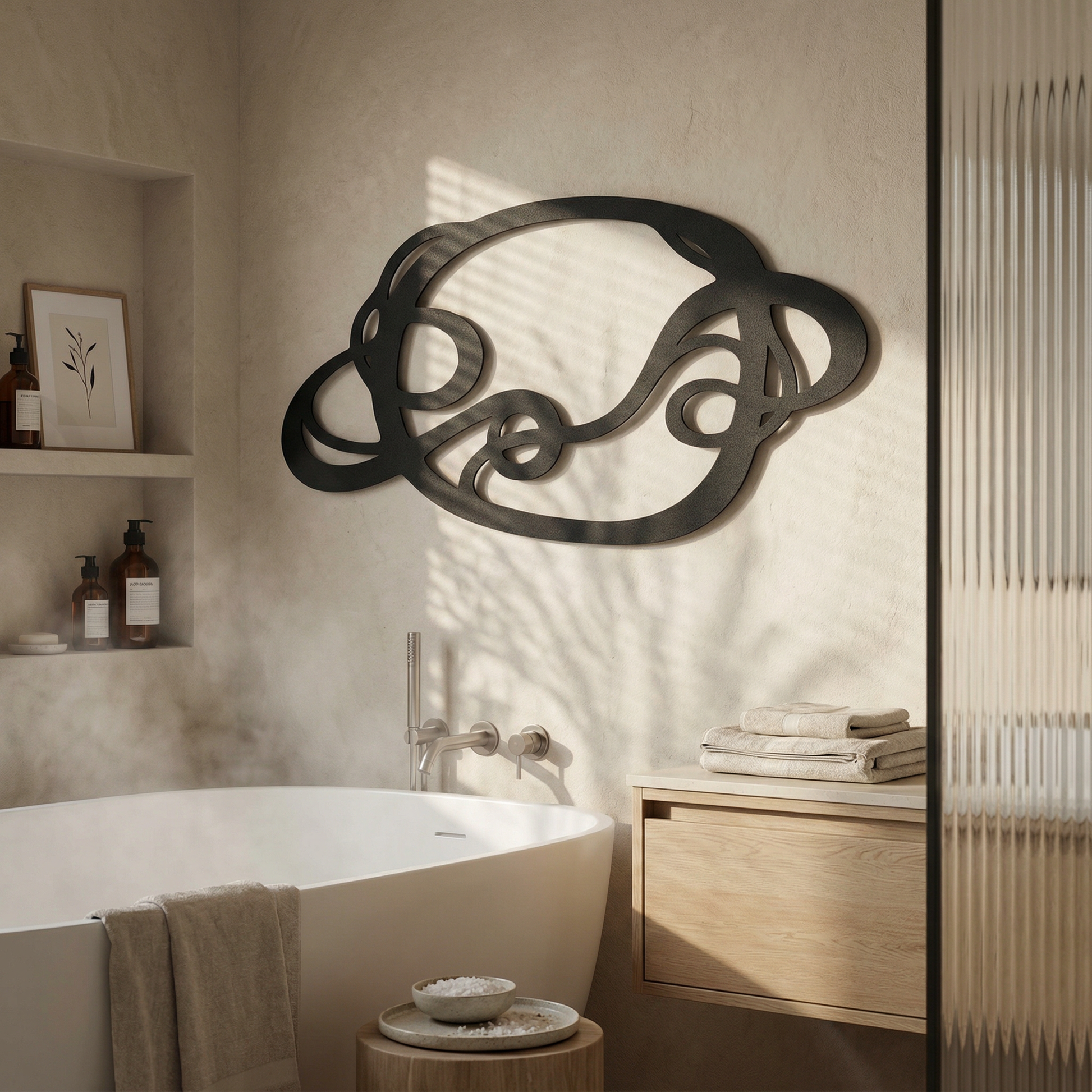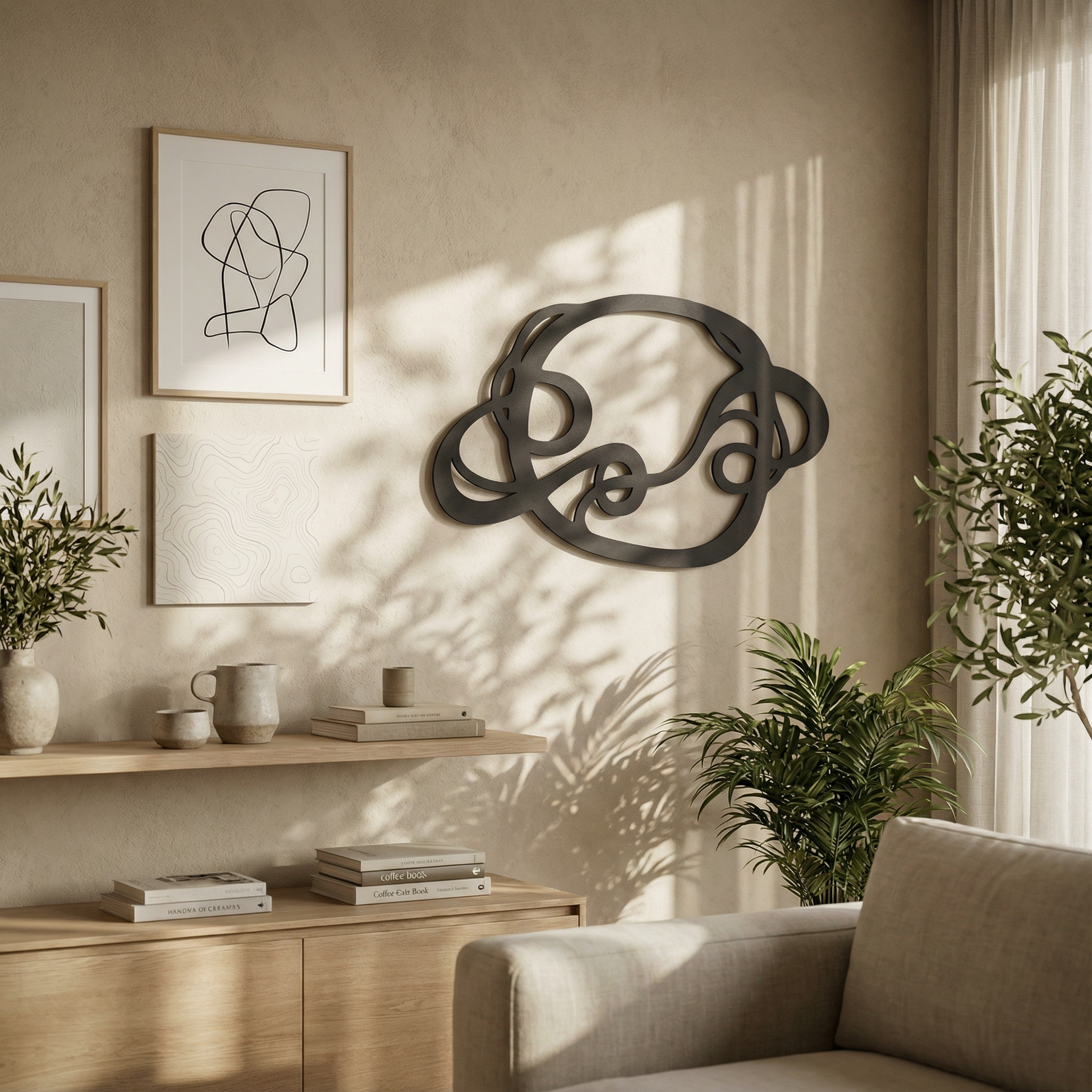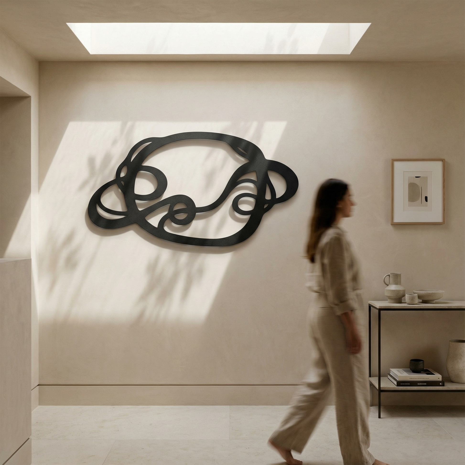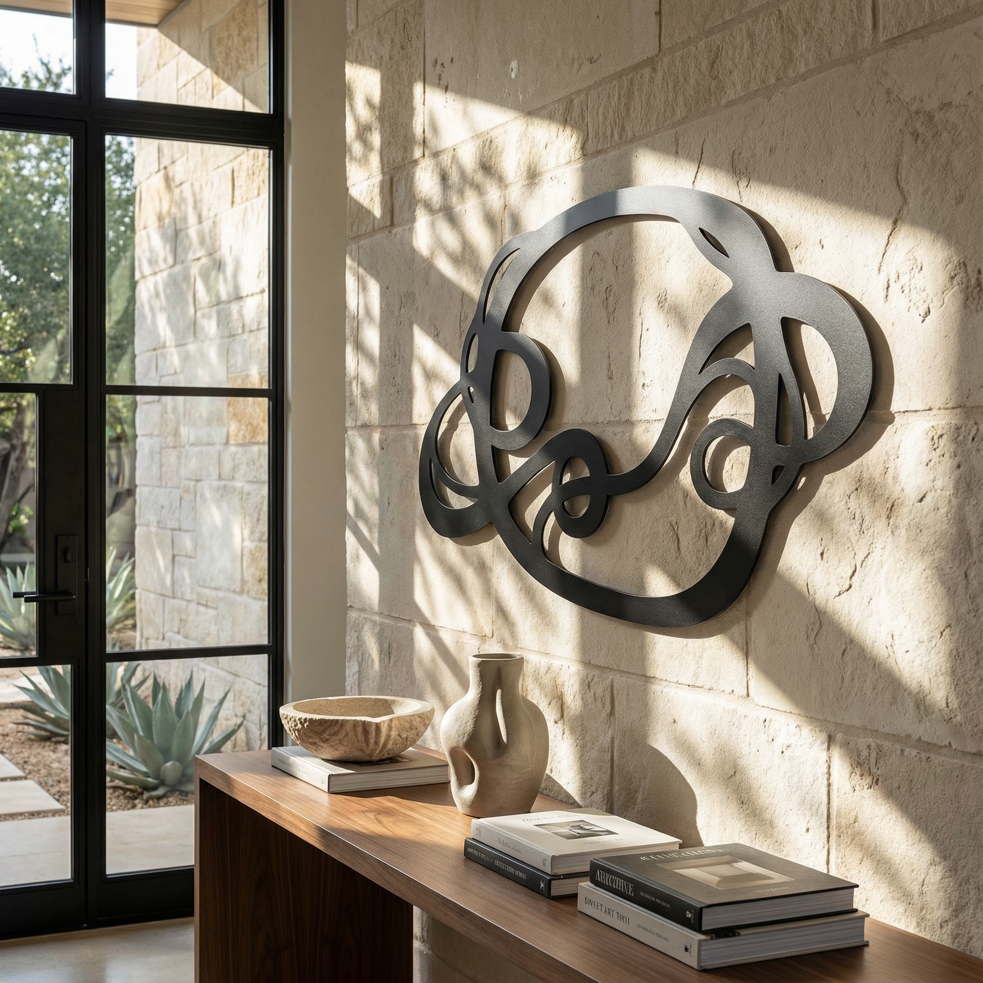 The design is translated into powder coated metal through thick ribbon-like lines and carefully preserved negative space that keeps the interlace readable. The rounded turns and looped cutouts are engineered to hold visual weight without feeling heavy, while the floating offset adds a shadow outline that emphasizes every crossing.