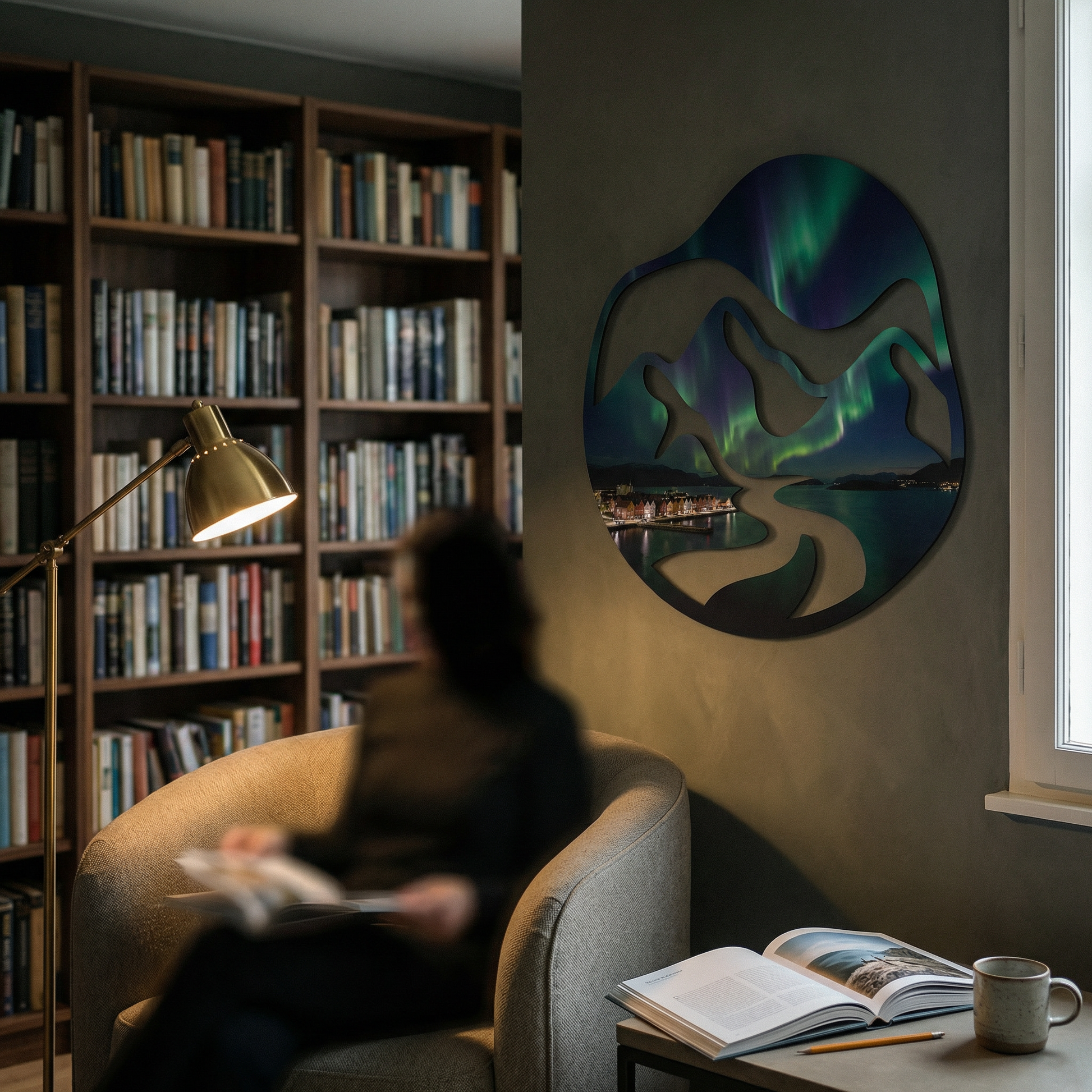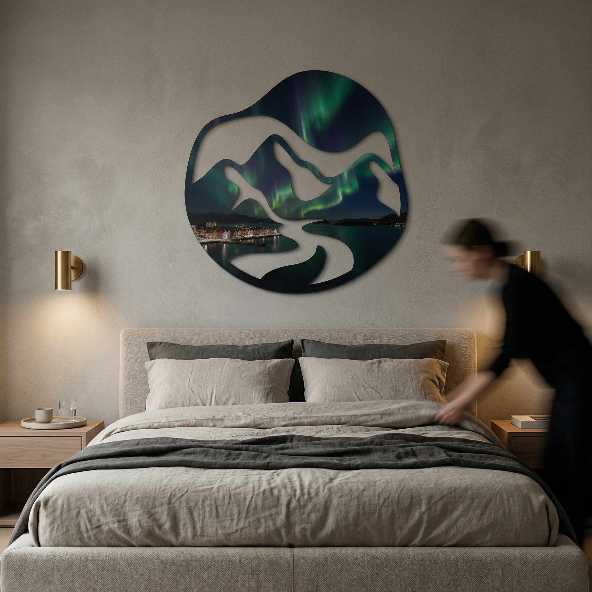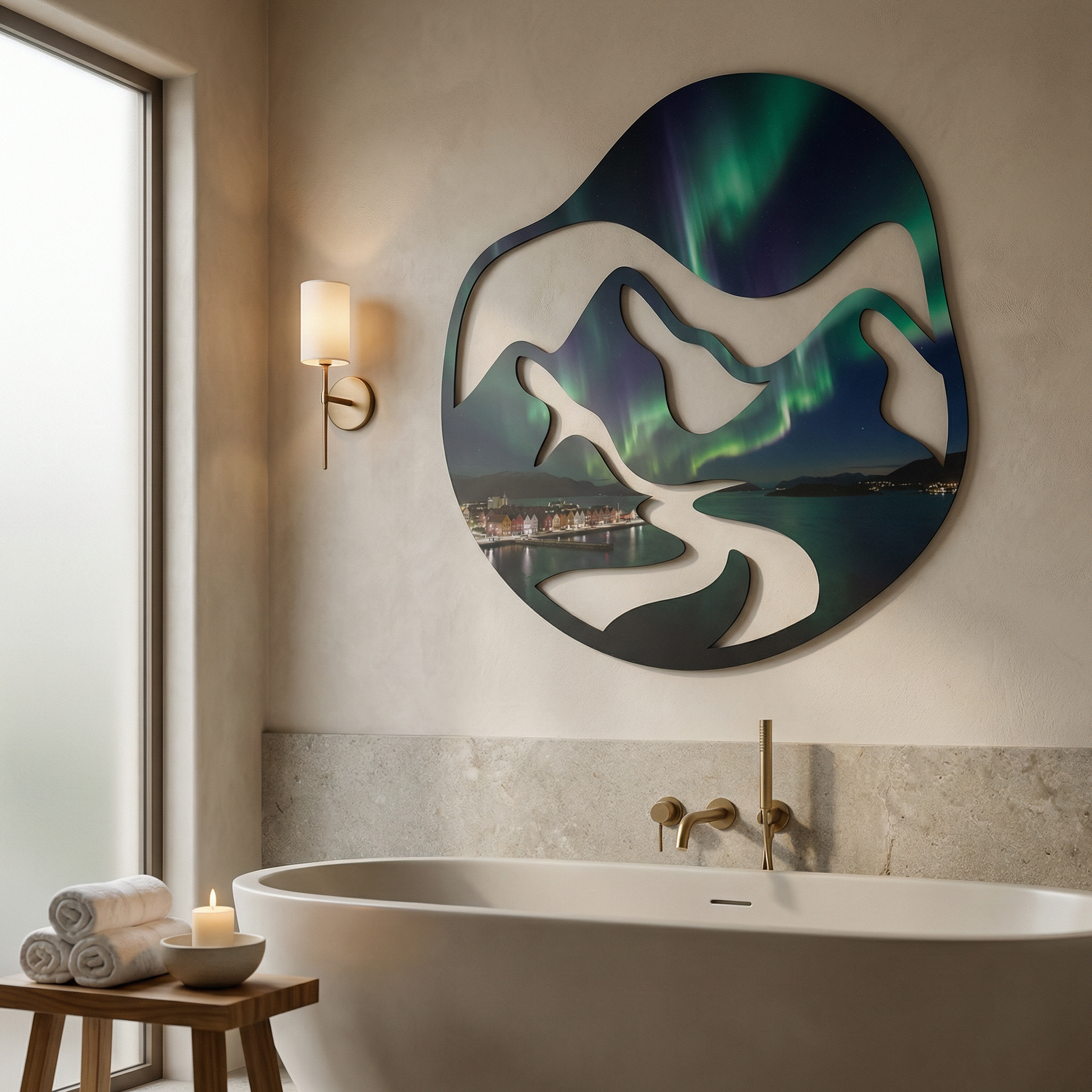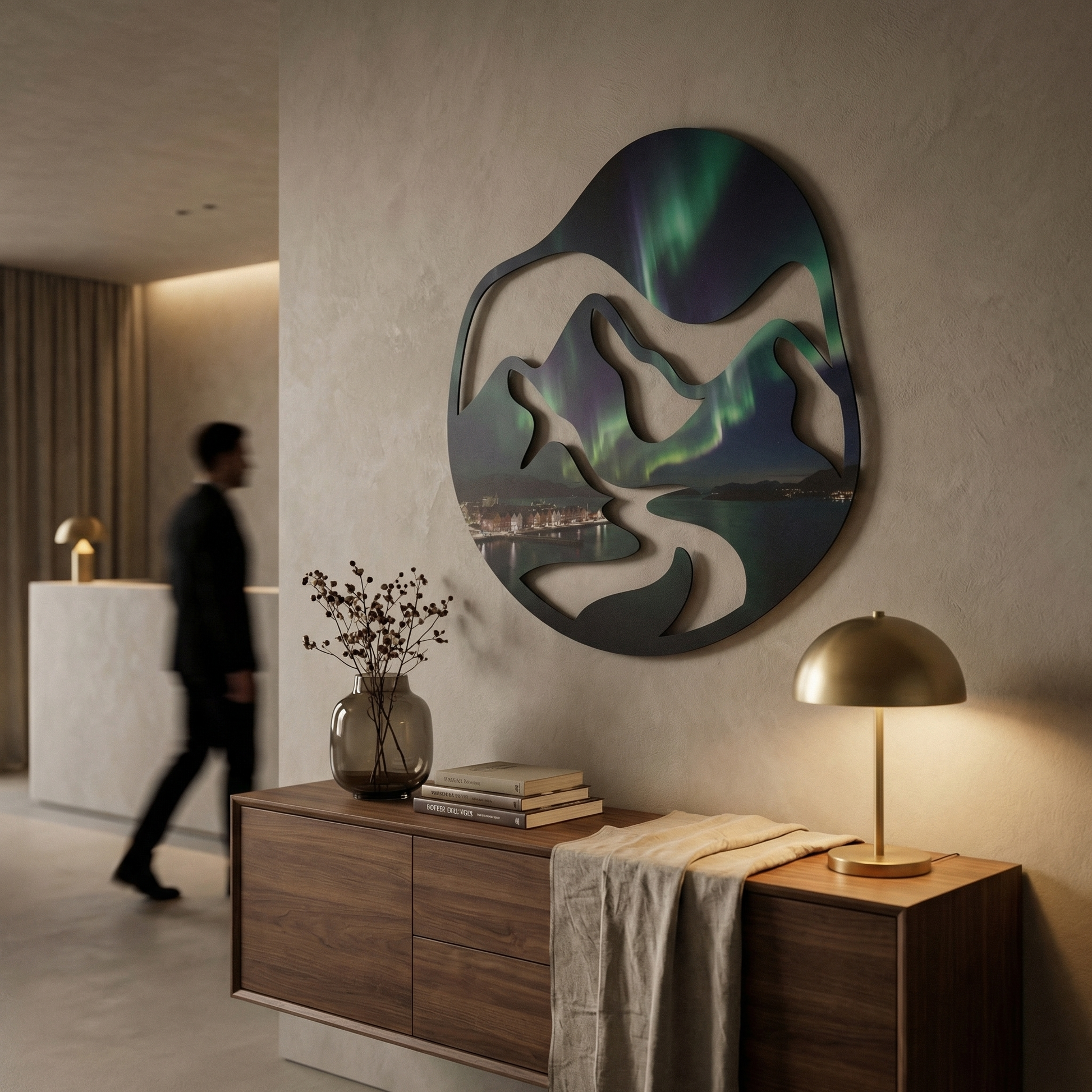 Symbolizing the harmonious balance between human habitation and untamed nature, this factual representation of a fjord landscape serves as a grounded yet awe-inspiring focal point. It explores the interplay of elevation and depth through clean, organic lines.