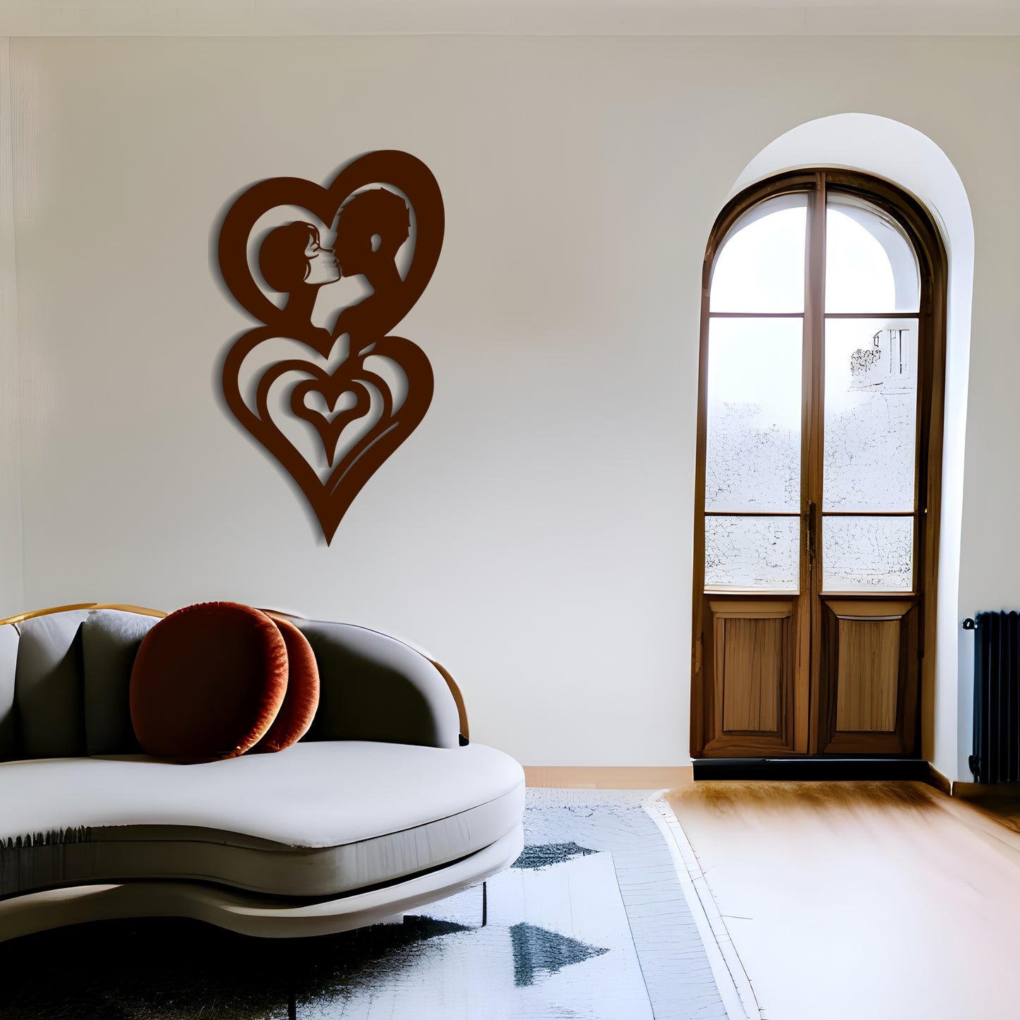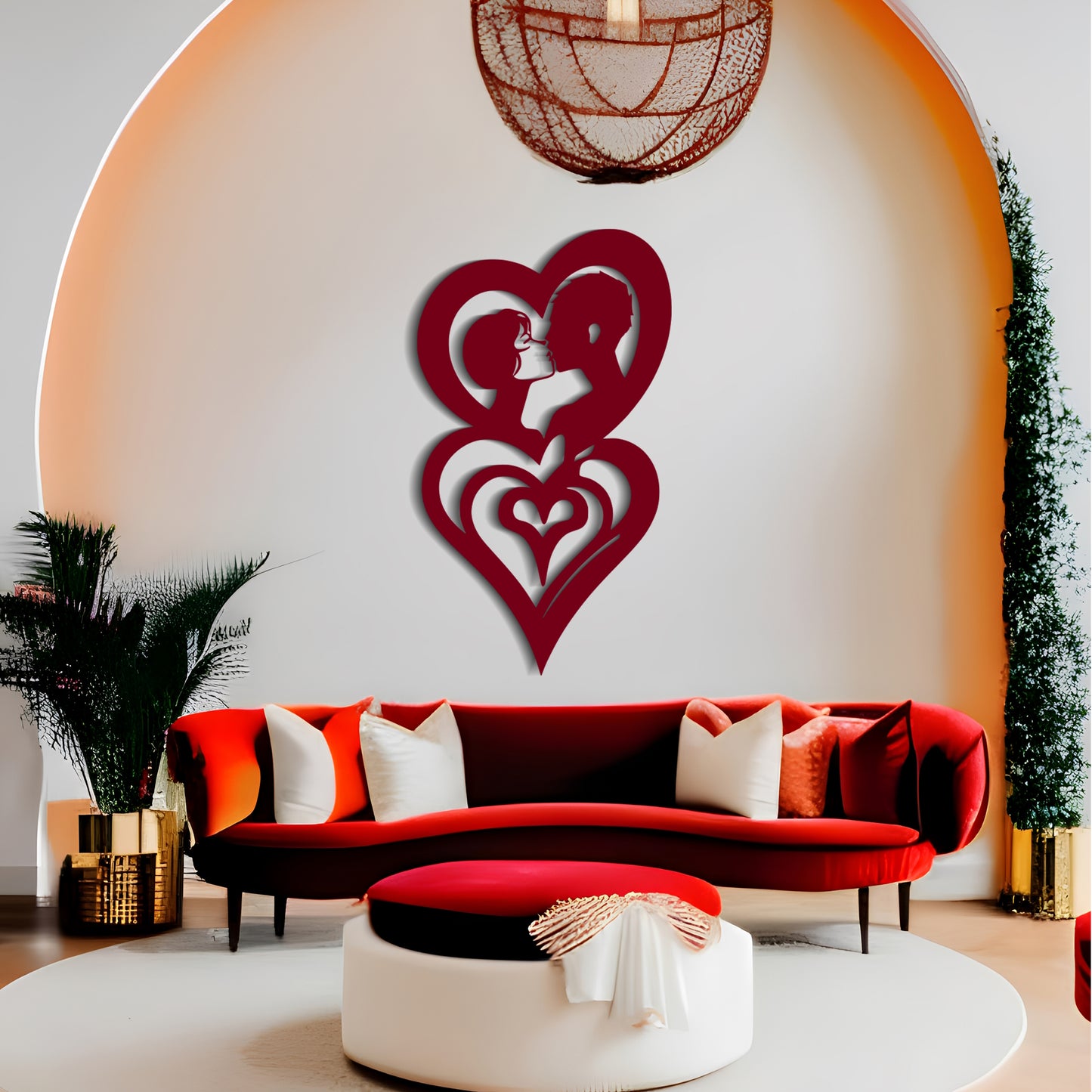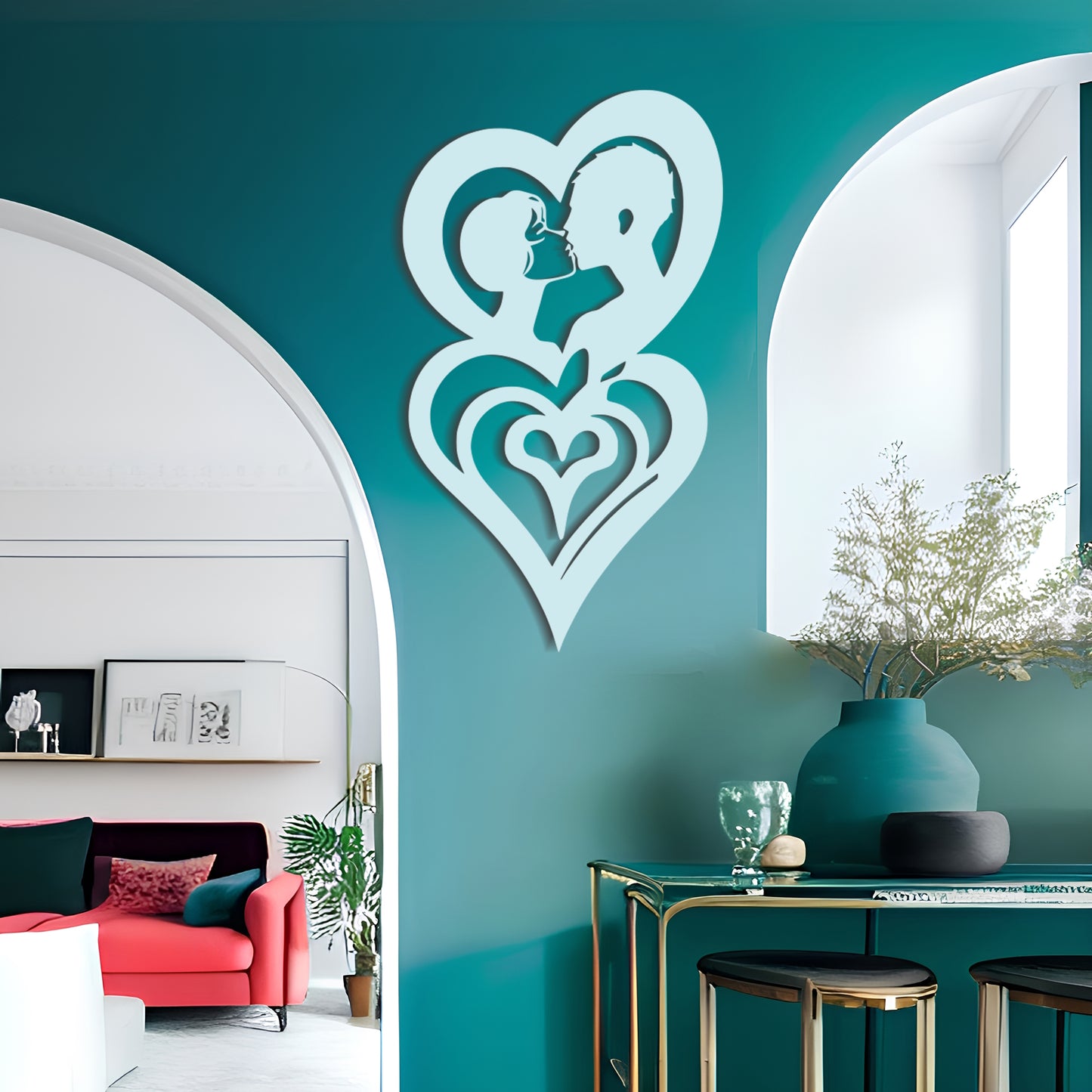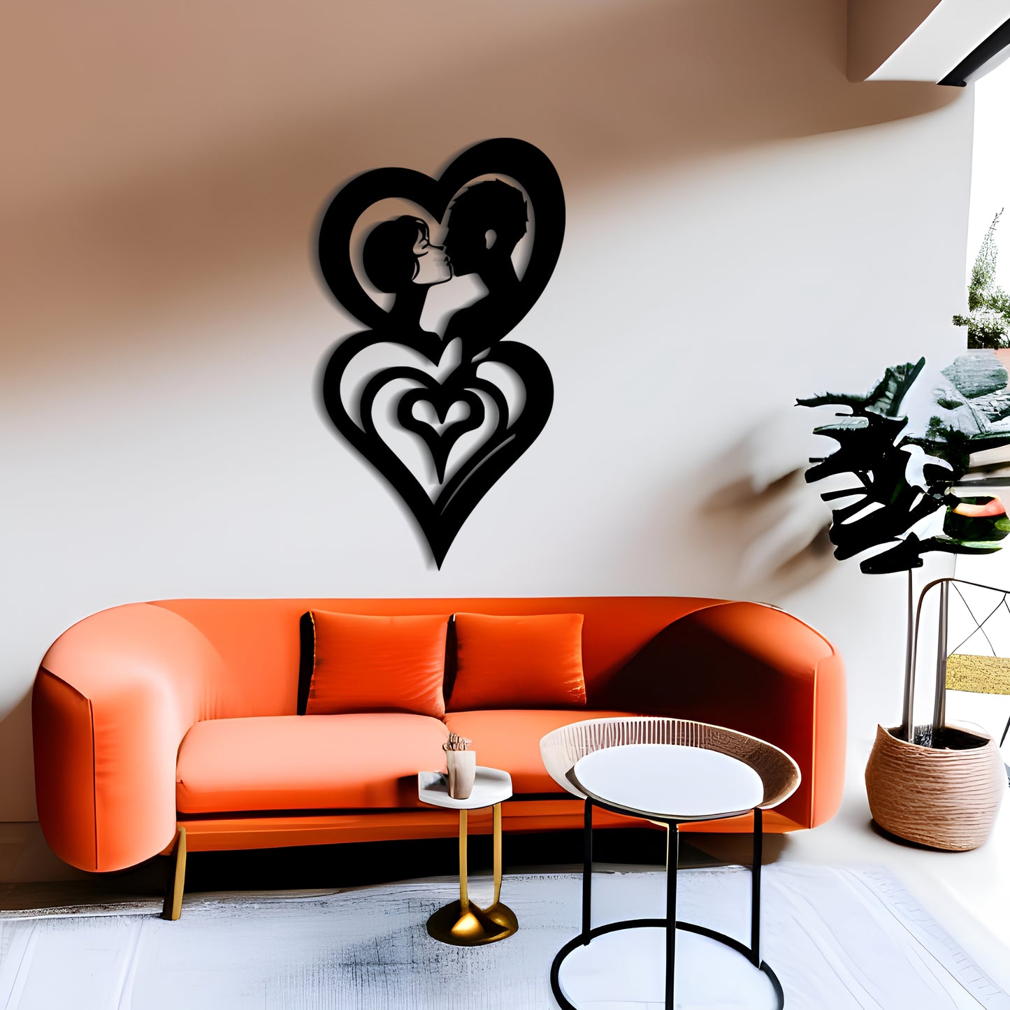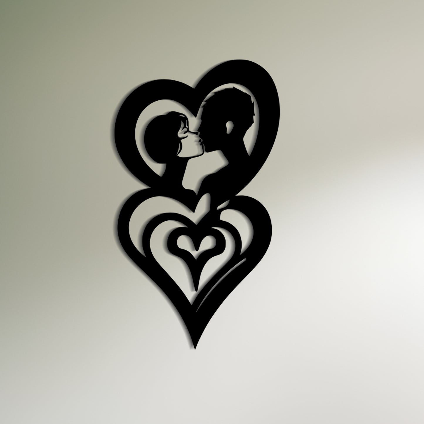 This stunning wall art features a man and a woman kissing in a Figuration Libre style, surrounded by a heart emblem with an art-deco influence. The design is luminous and endless, creating a beautiful and outstanding addition to any room. Perfect as a gift for a boyfriend or girlfriend, or as a beautiful wedding or weeding decor. Available in custom color options.