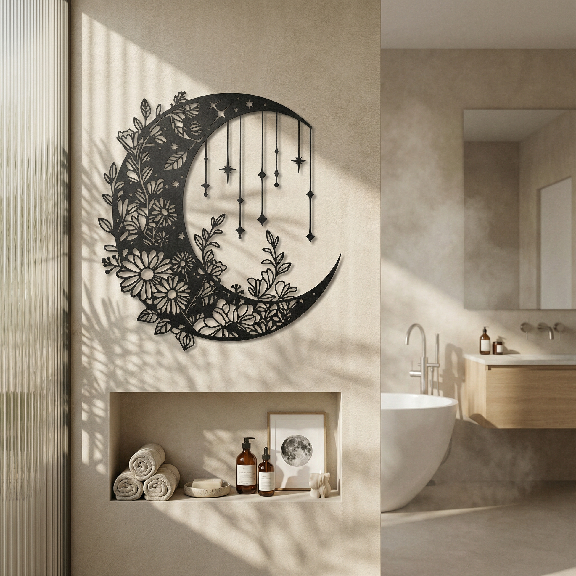 In metal, the crescent is shaped as a bold silhouette while the floral interior is cut into crisp negative space for lace-like detail. The hanging star lines are designed as clean vertical accents that sharpen the floating shadow effect, allowing light to trace both the botanical cutwork and the celestial drops with striking clarity.