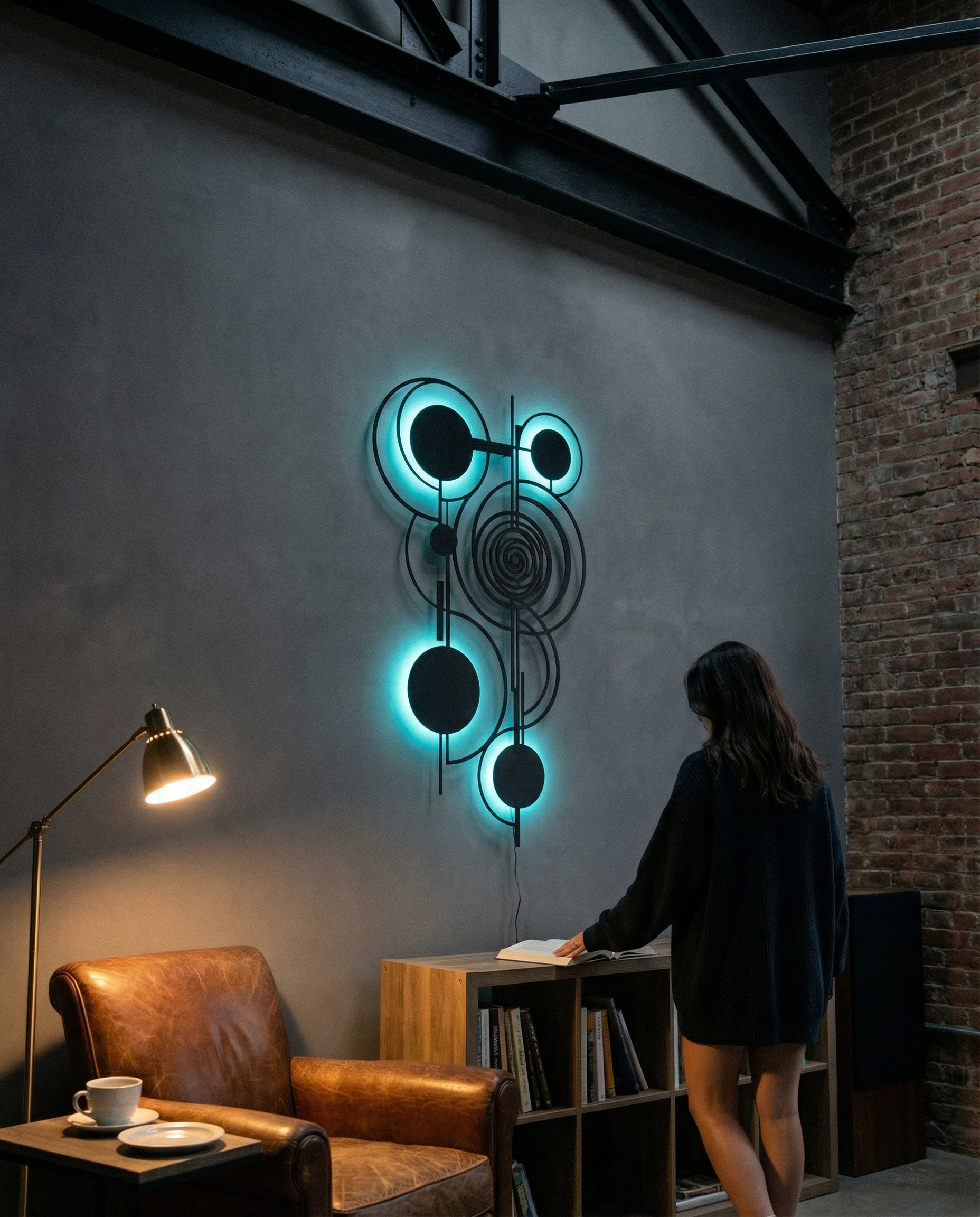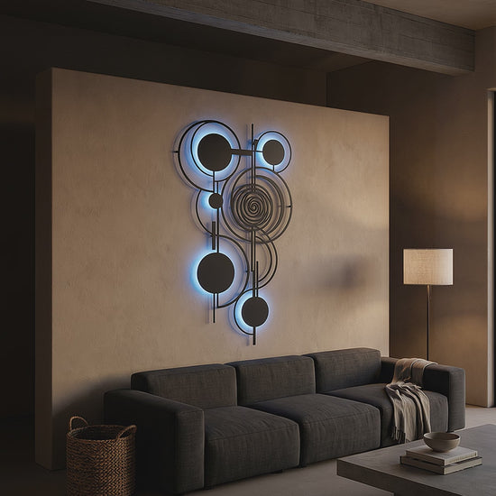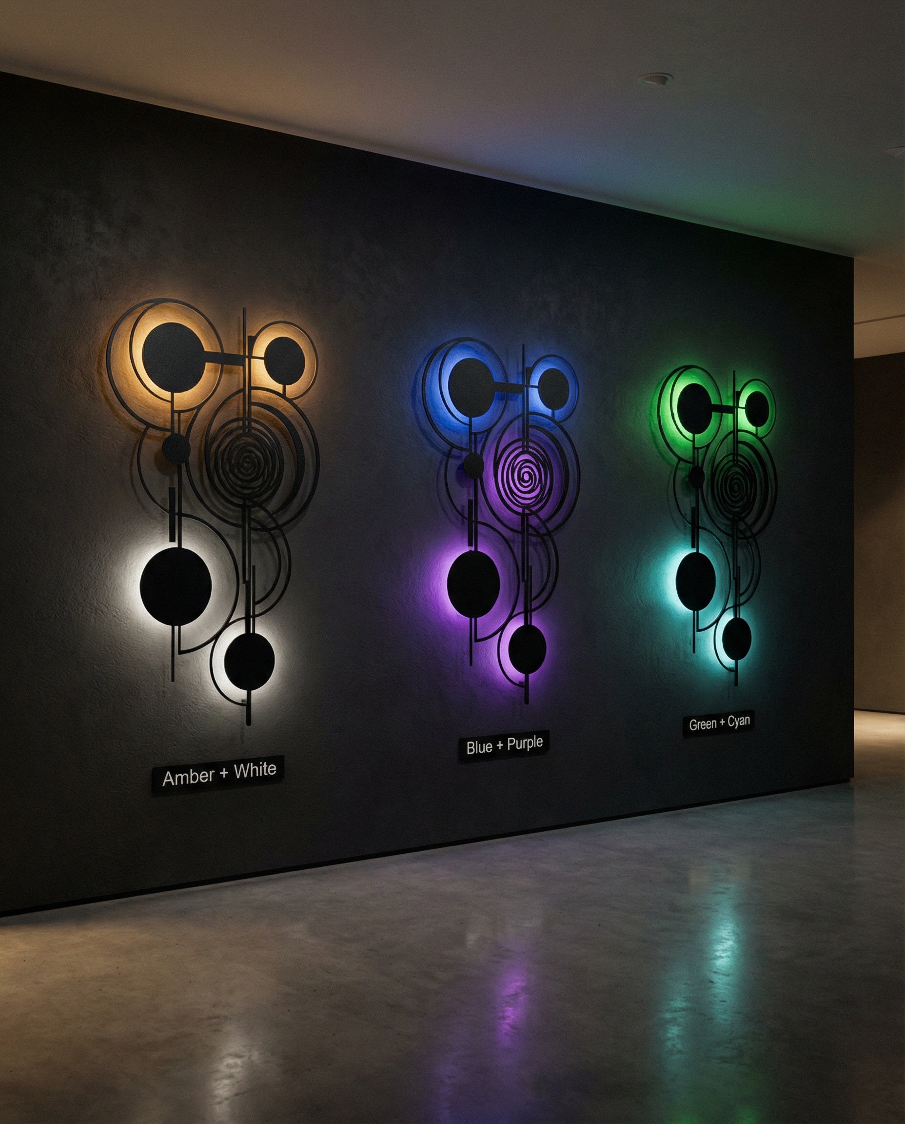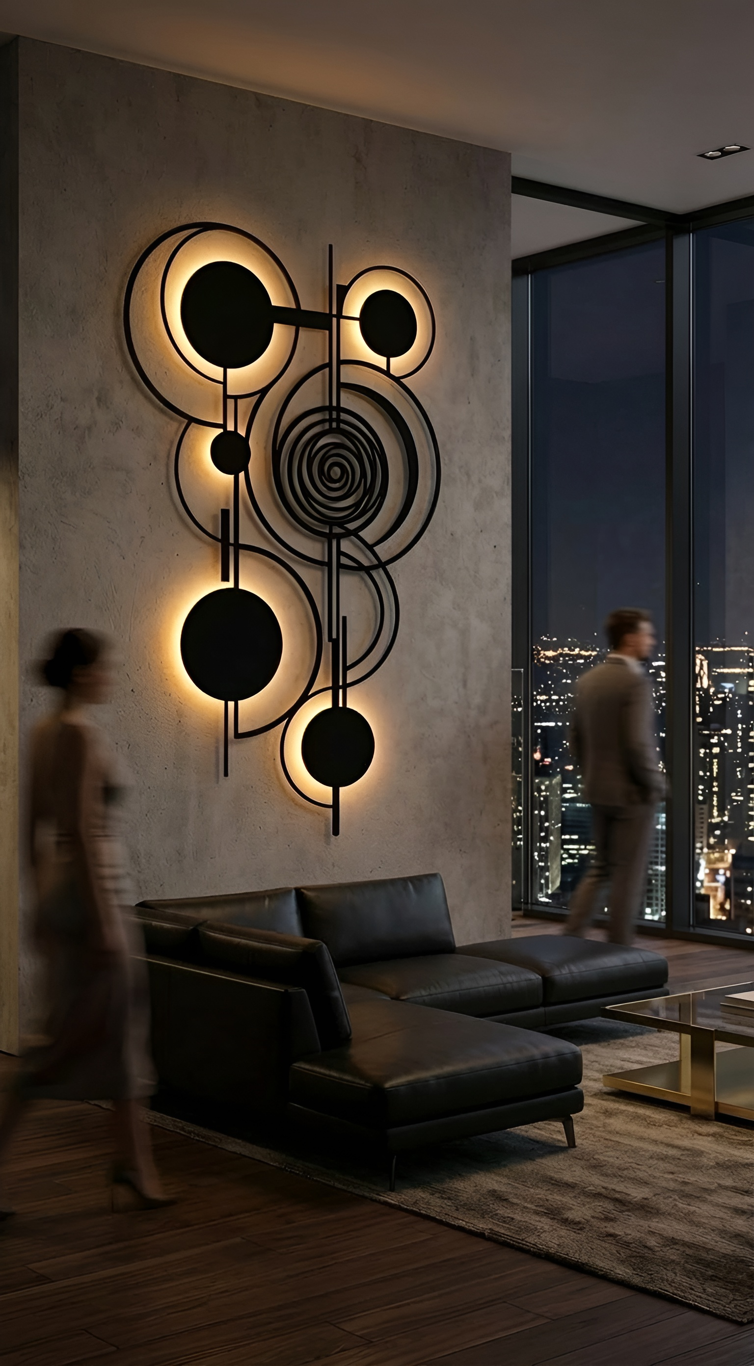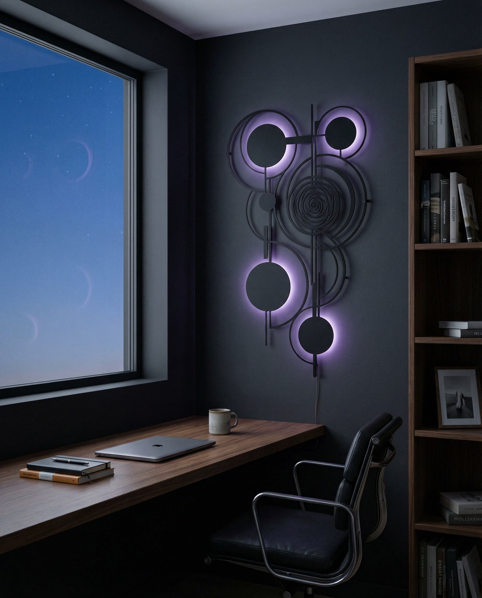 Curator's note: The spiral-and-disc arrangement draws on a long tradition of circle-based abstraction in which solid and void carry equal compositional weight. The LED integration elevates this from static sculpture to ambient light object. The piece functions simultaneously as wall art and architectural lighting — a dual role that positions it within the growing category of functional sculptural decor.