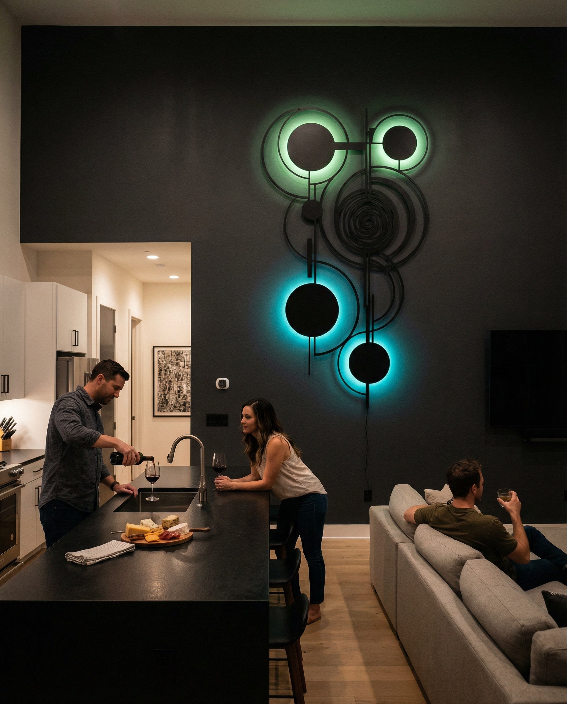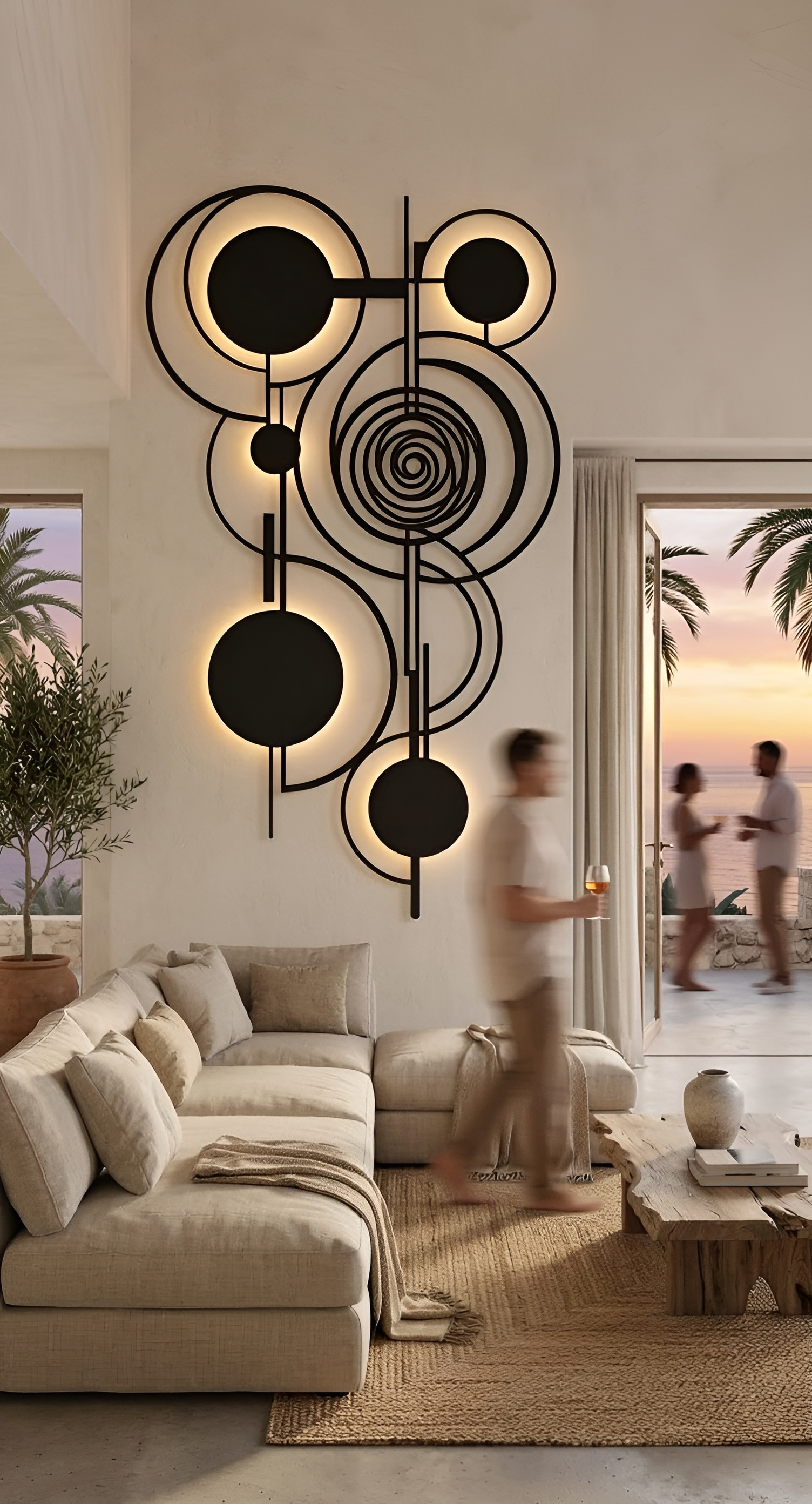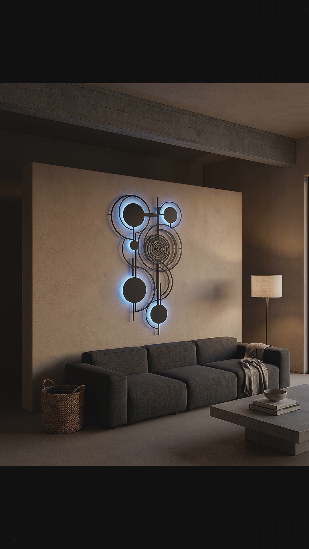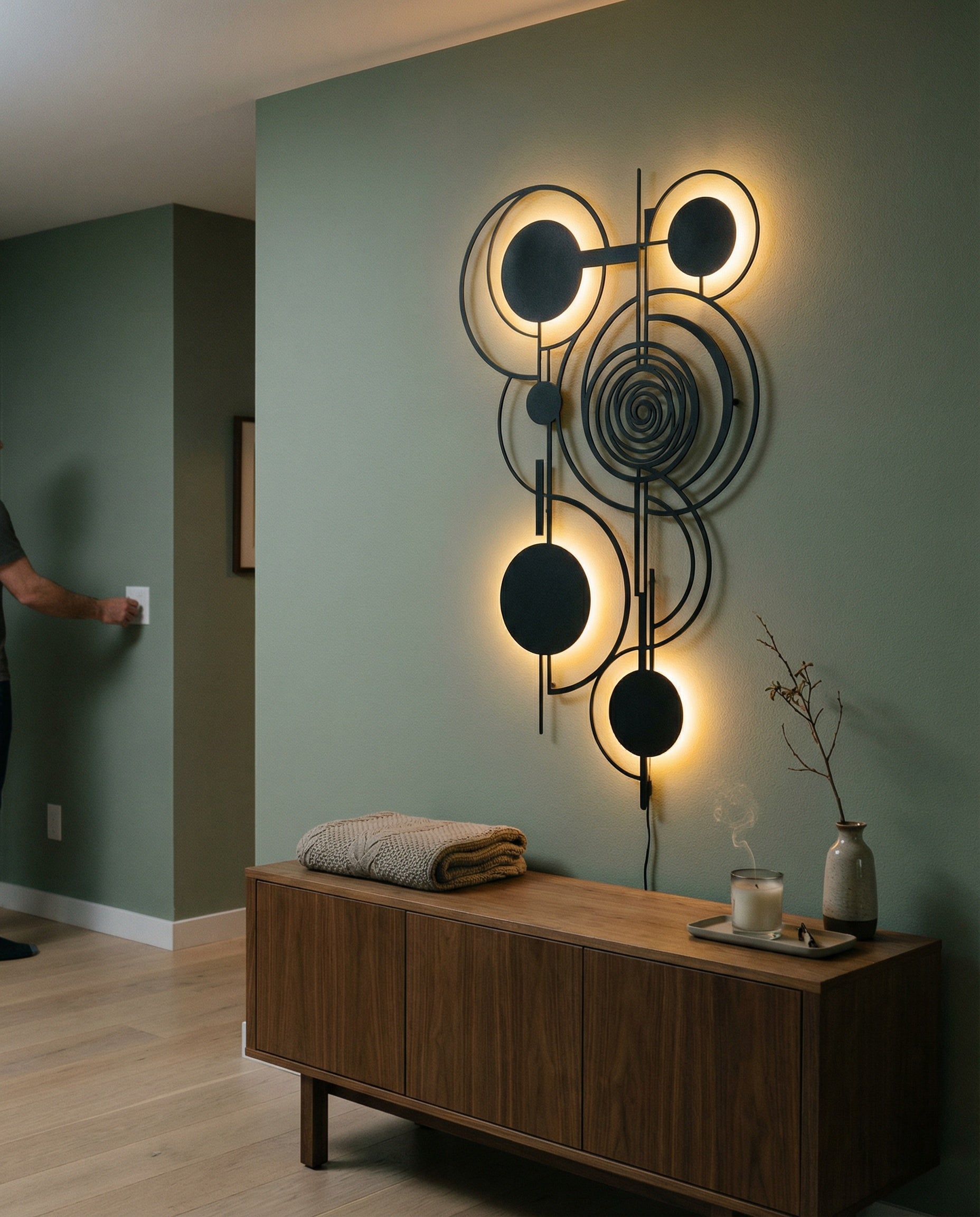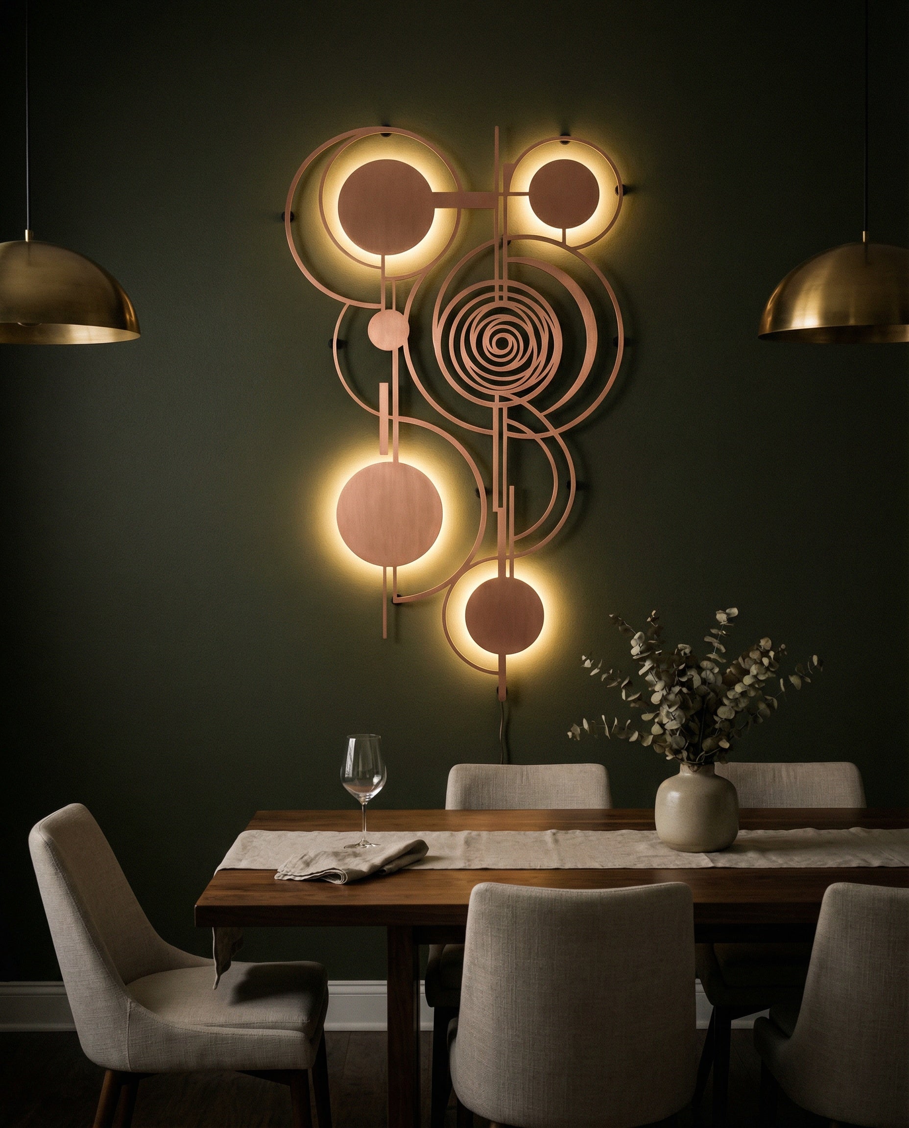 Curator's note: The spiral-and-disc arrangement draws on a long tradition of circle-based abstraction in which solid and void carry equal compositional weight. The LED integration elevates this from static sculpture to ambient light object. The piece functions simultaneously as wall art and architectural lighting — a dual role that positions it within the growing category of functional sculptural decor.
