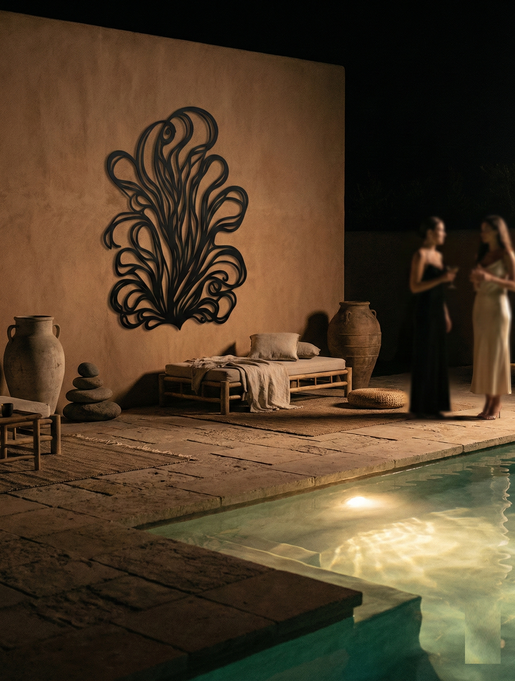 In metal, the fronds are formed through layered, elongated cutlines that keep the composition airy while preserving a bold outline. The curled tips and inner channels are shaped as intentional negative space, allowing light to pass through and intensify the floating shadow effect as the linework ripples across the wall.