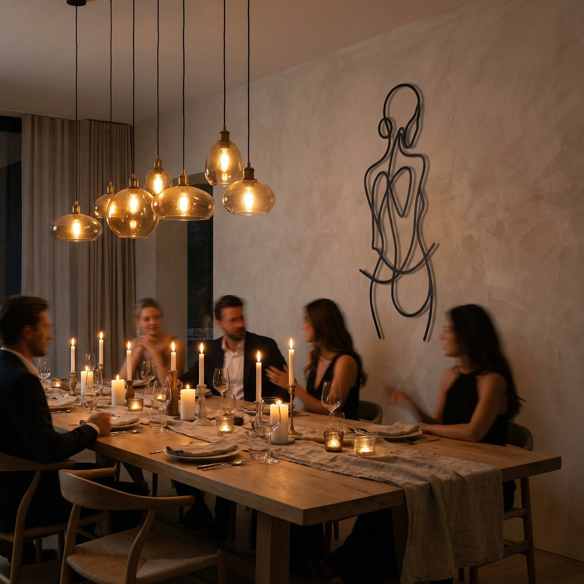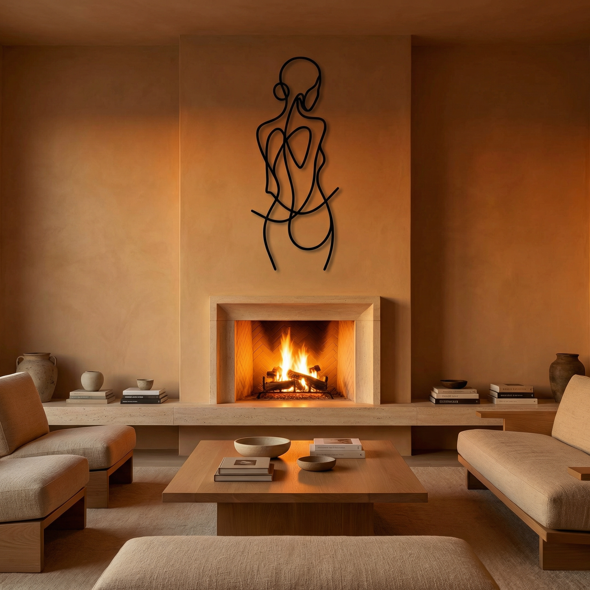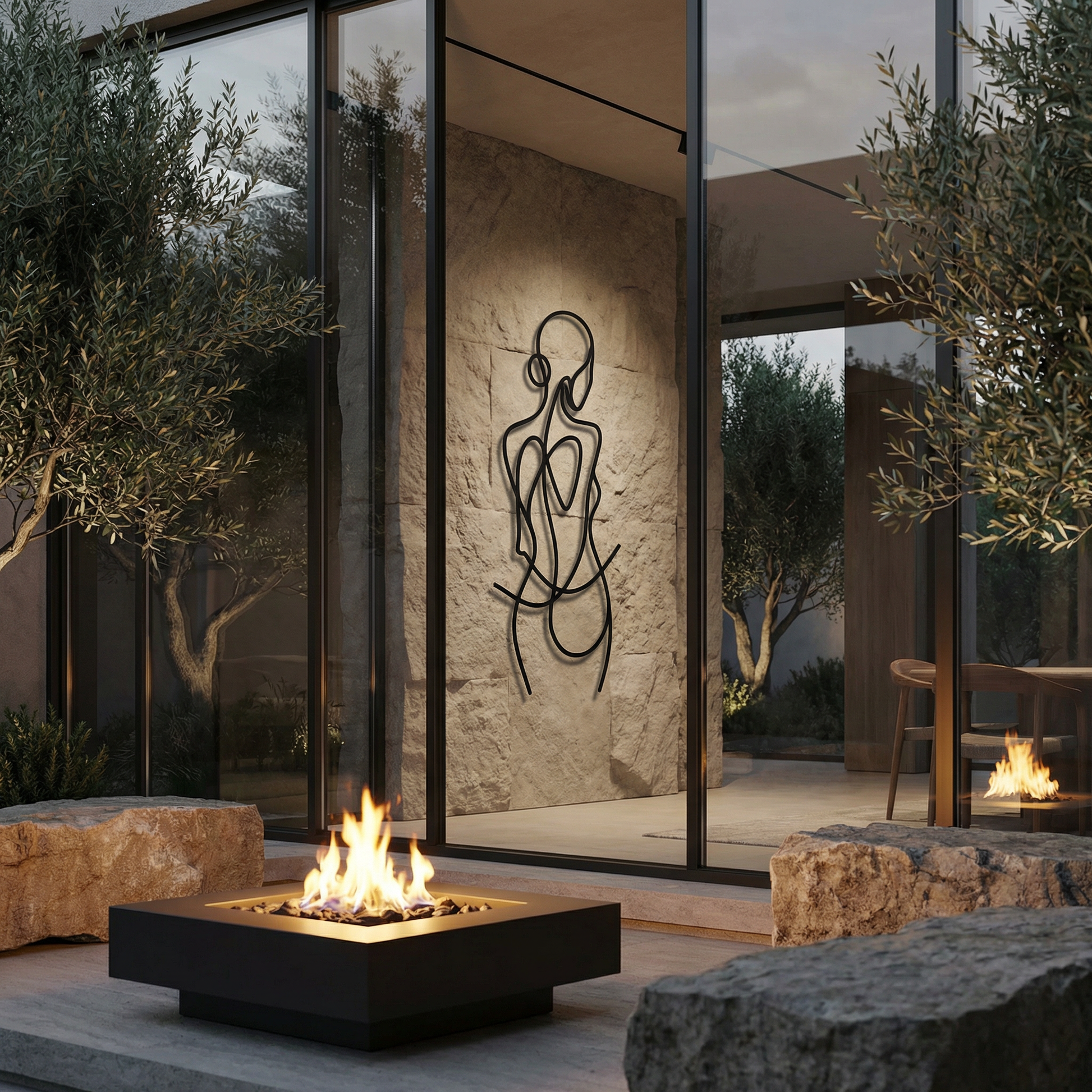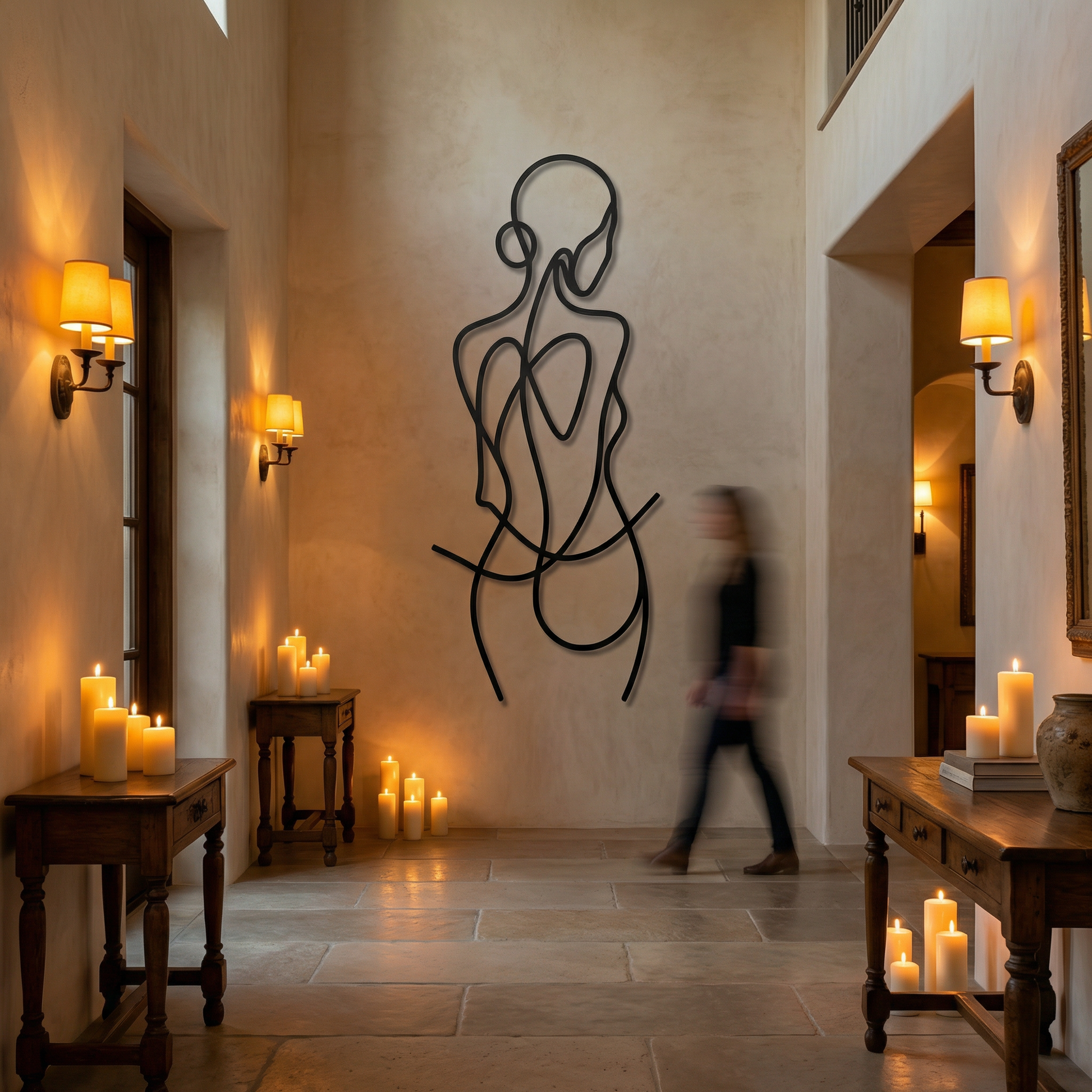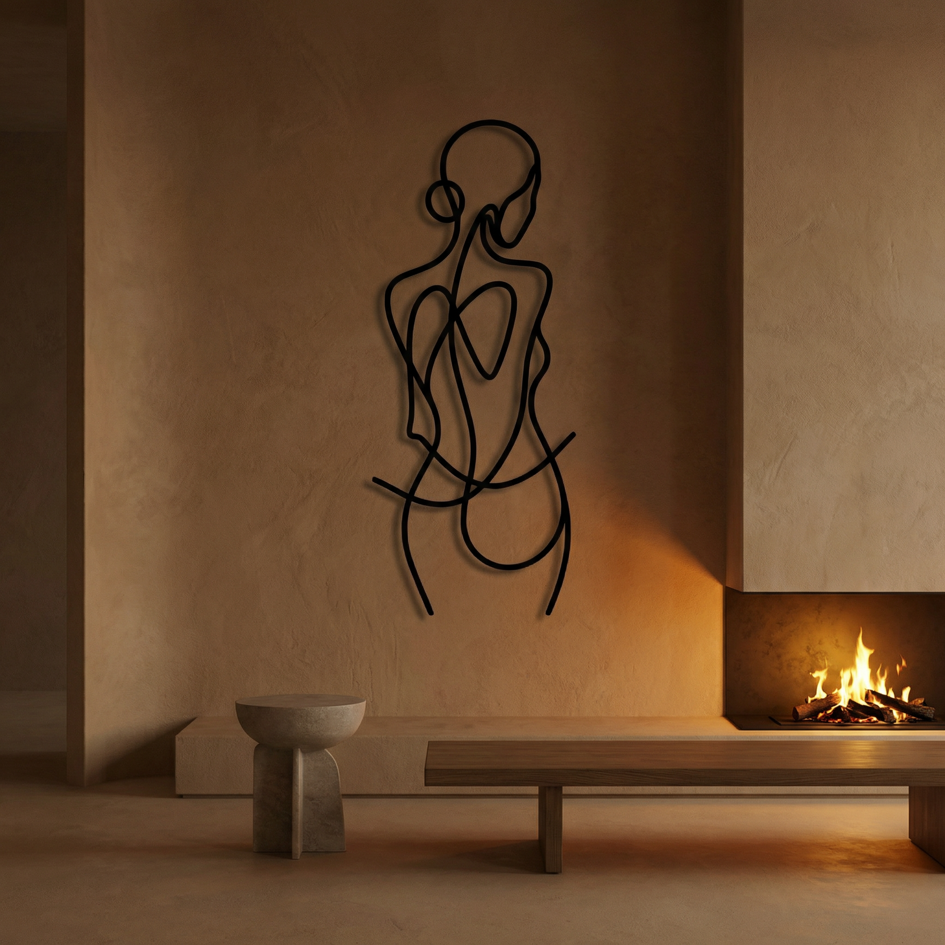 In metal, the artwork is defined by clean cut pathways and generous open fields that let the silhouette breathe. The line weight is engineered for visual stability, while the floating offset creates a secondary drawing in shadow—softening the curves and reinforcing the figure’s rhythm without adding extra detail.