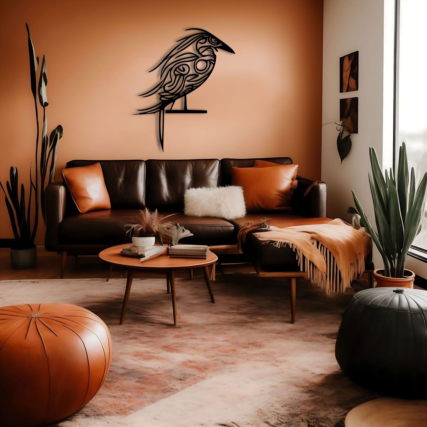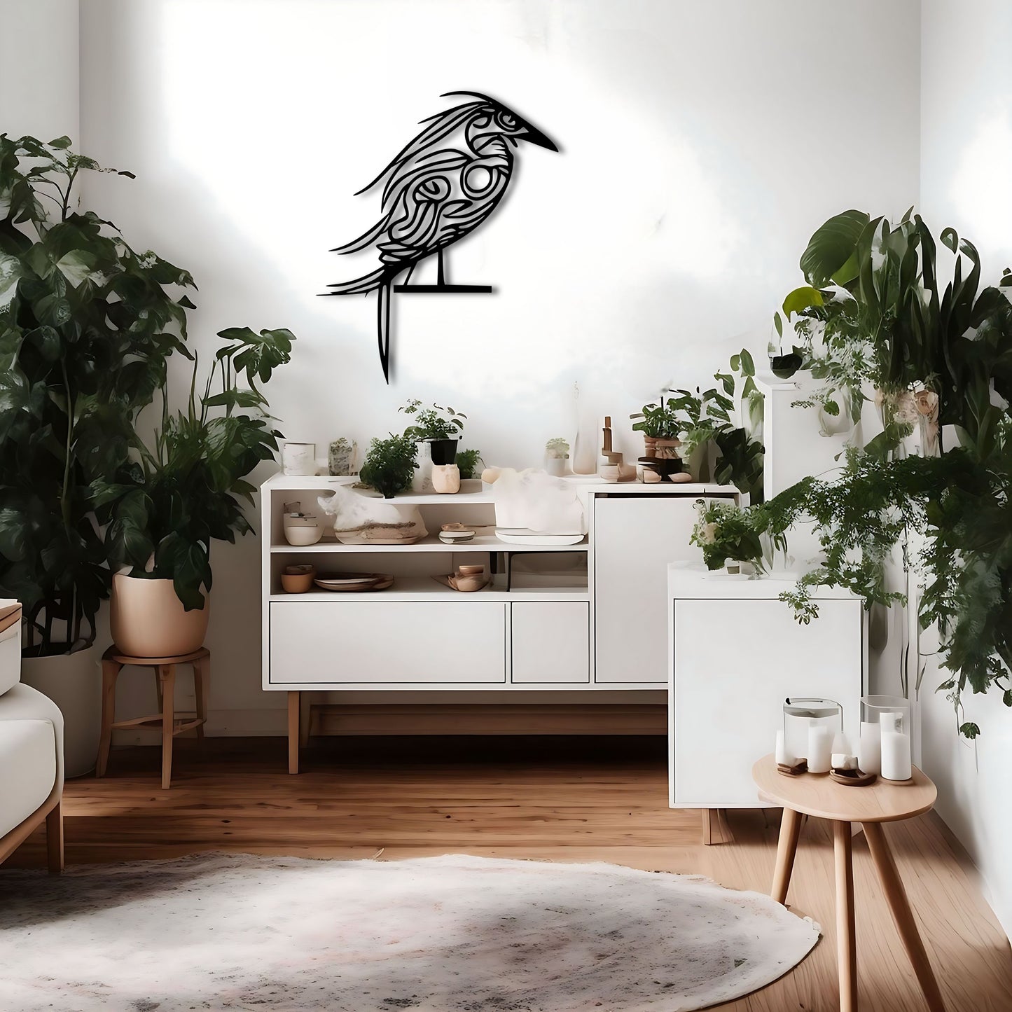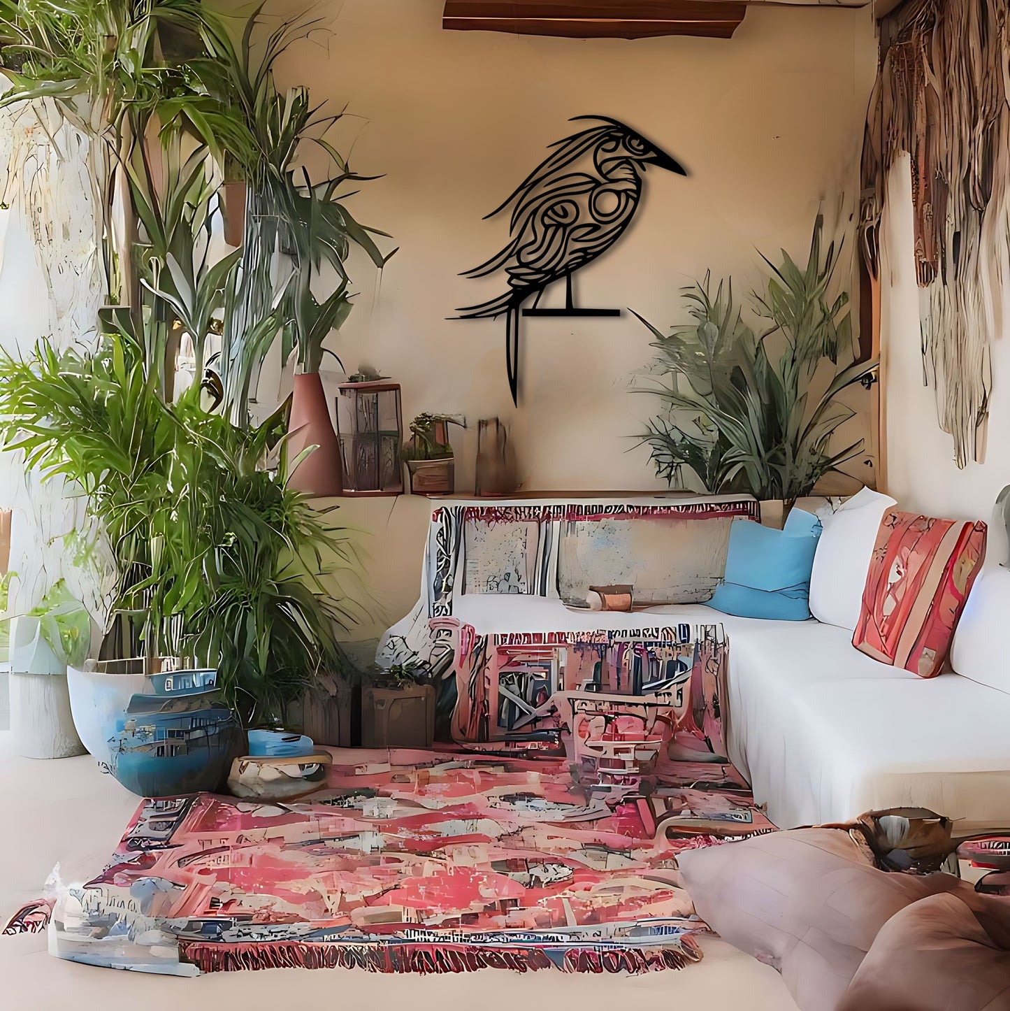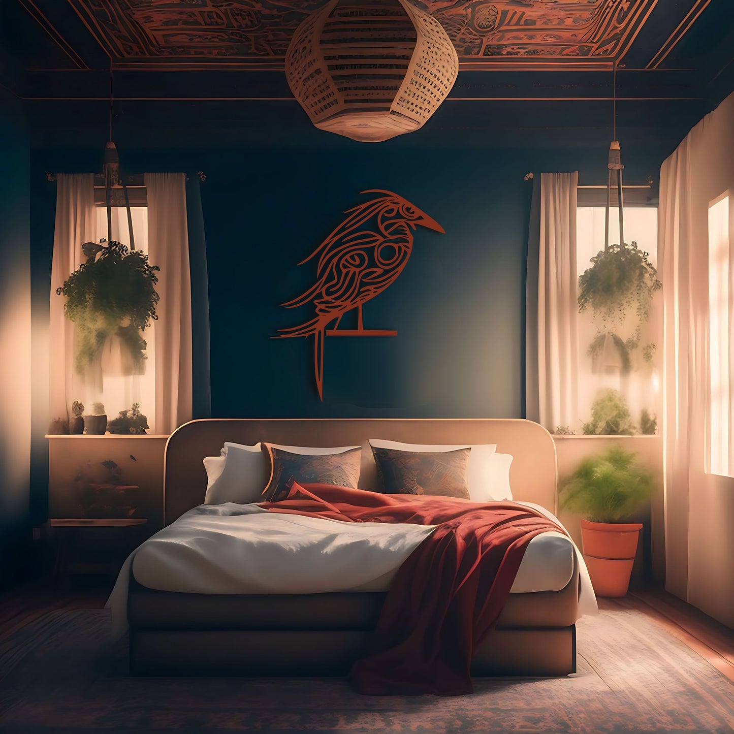 This stunning metal wall art features a stylized silhouette of a confident-looking bird in the intricate and bold style of celtic art. The vivid lines of the artwork showcase the attention to detail in every aspect of this ceremonial and tribal-inspired piece. The side view centered bird is waiting to be the centerpiece of any room with its bold design that includes fiibonacci elements. The metal art is perfect for those seeking bohemian wall art or global-inspired aesthetics decor. The versatile custom color options available allow for seamless integration into any existing decor. Bring this unique piece of art into your home and elevate your interior design to new heights.