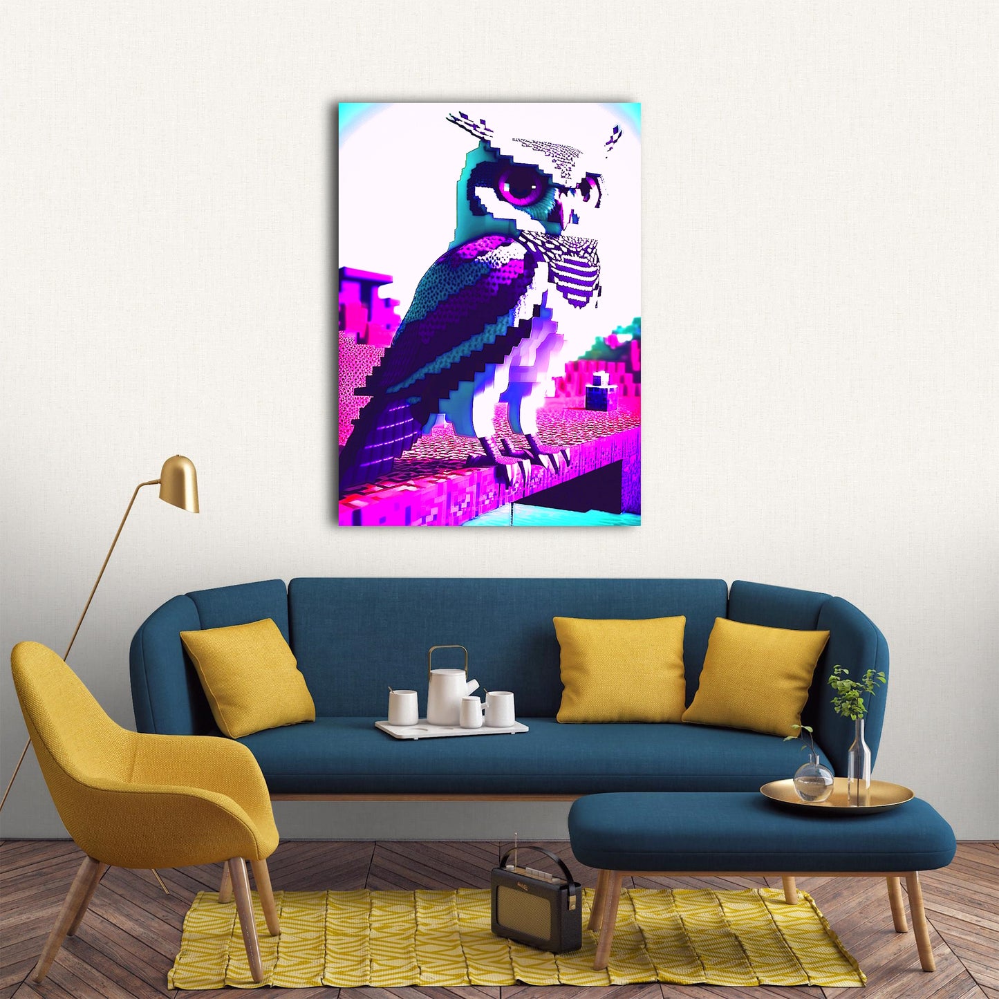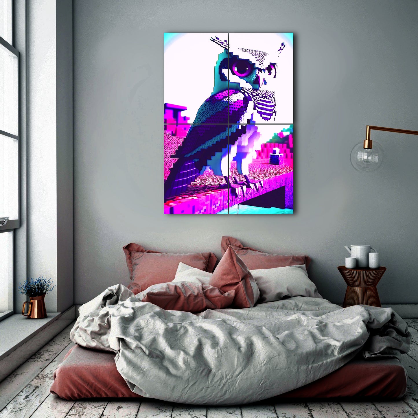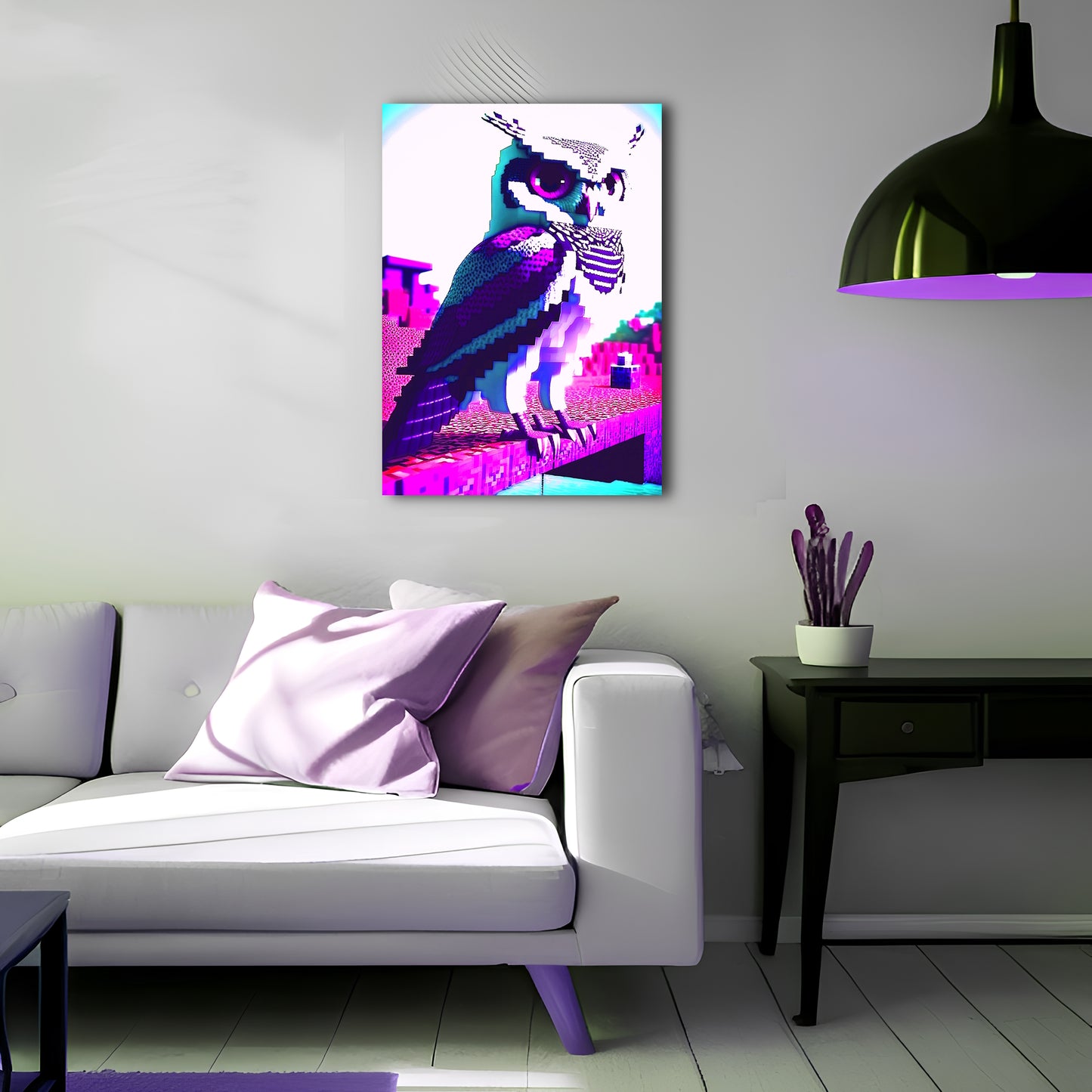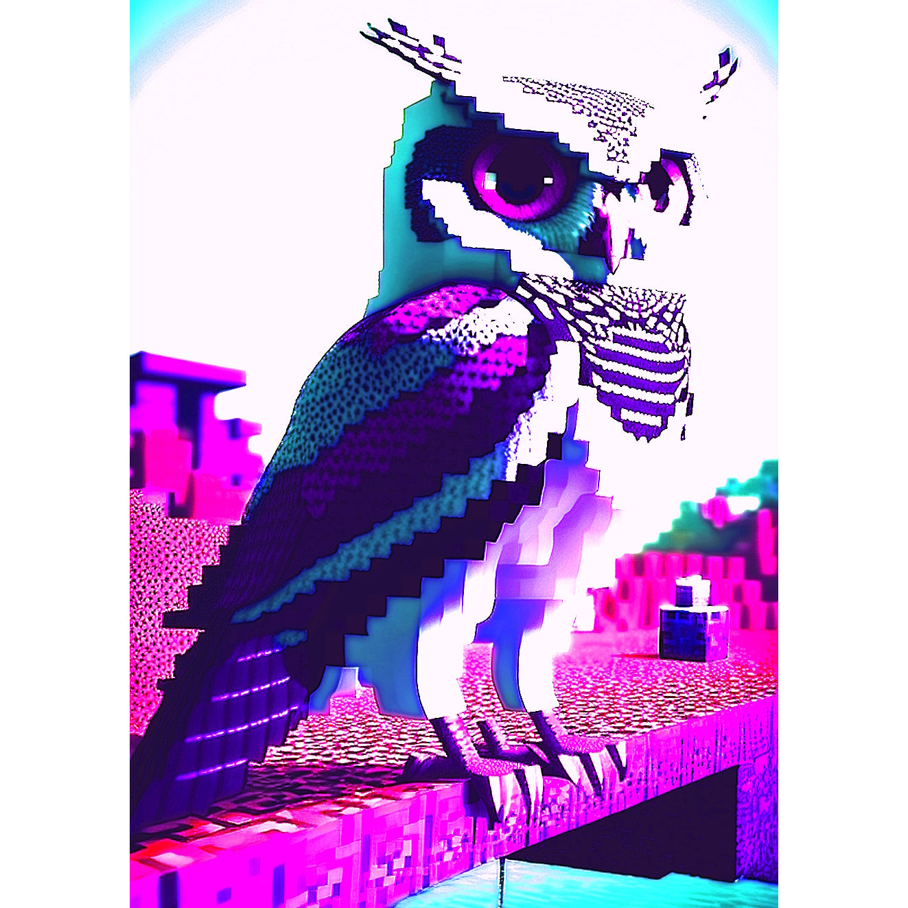 This digital artwork depicts an owl sitting on top of a brick structure, created using raytracing techniques and inspired by the style of Mike "Beeple" Winkelmann. The pixelated image features a pink and purple color scheme and immaculate shading, creating a high contrast and trippy effect. The owl is scowling with a falcon-like intensity, adding to the surreal and mysterious mood of the artwork. This metal poster is perfect for those who appreciate pixel art, minecraft and psychedelic imagery.