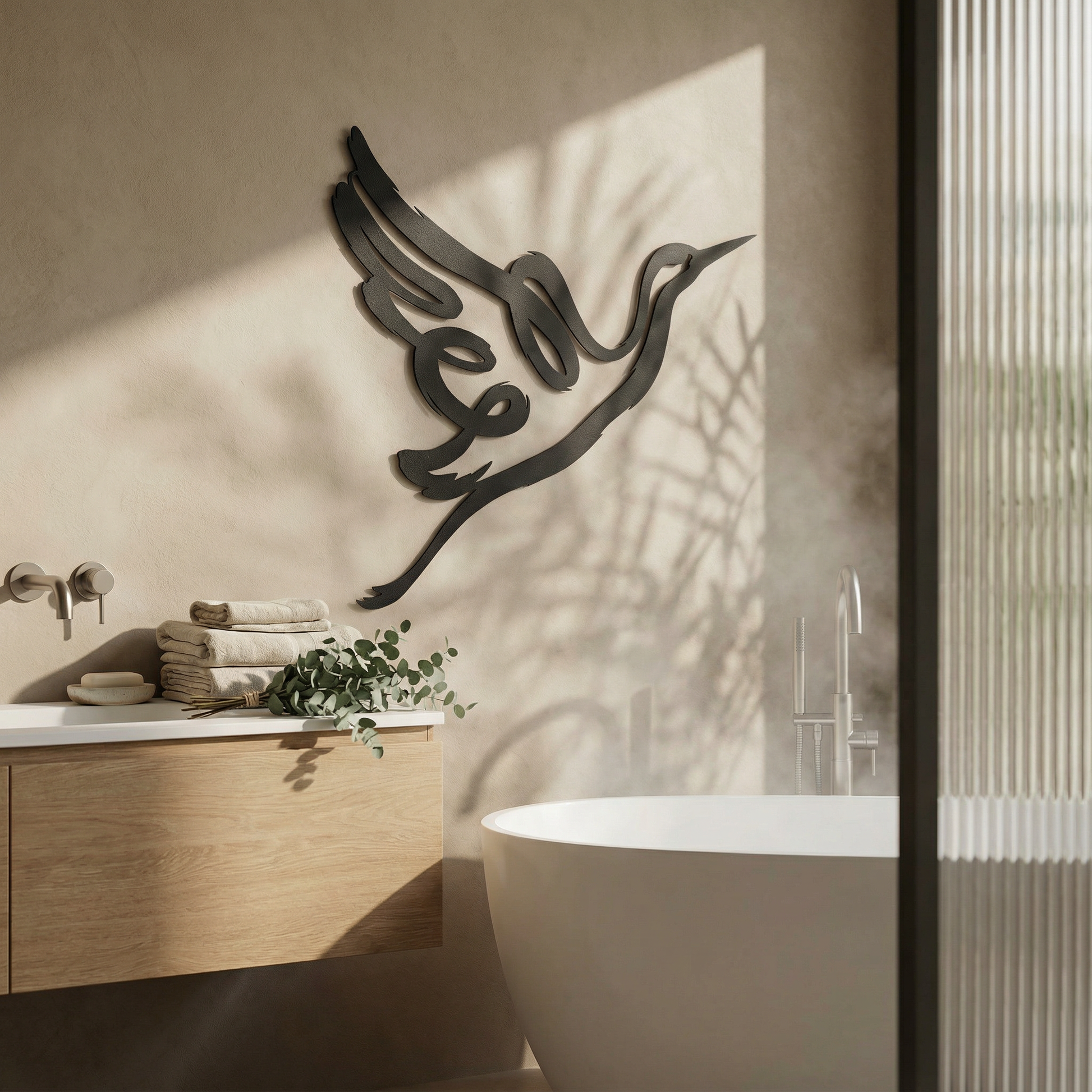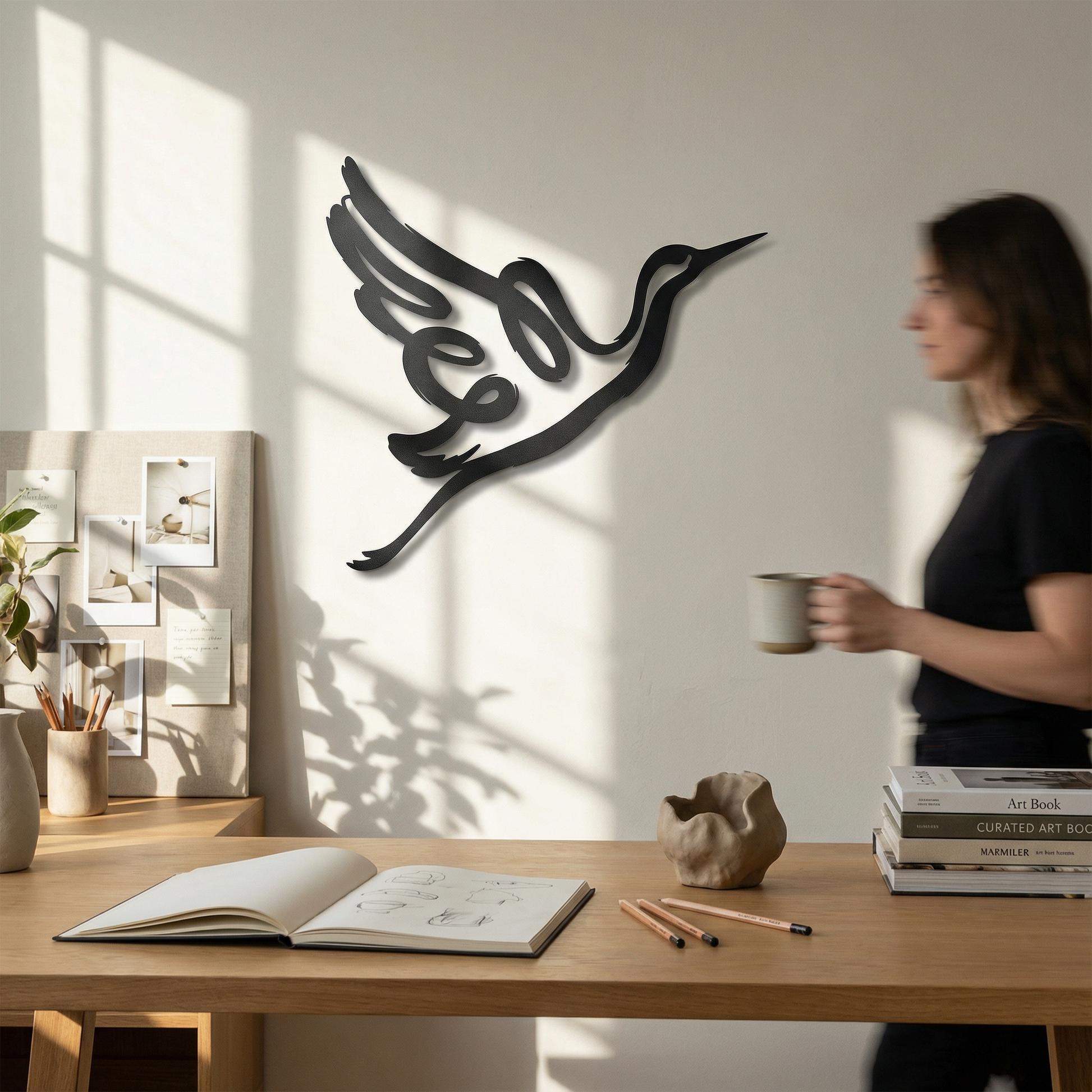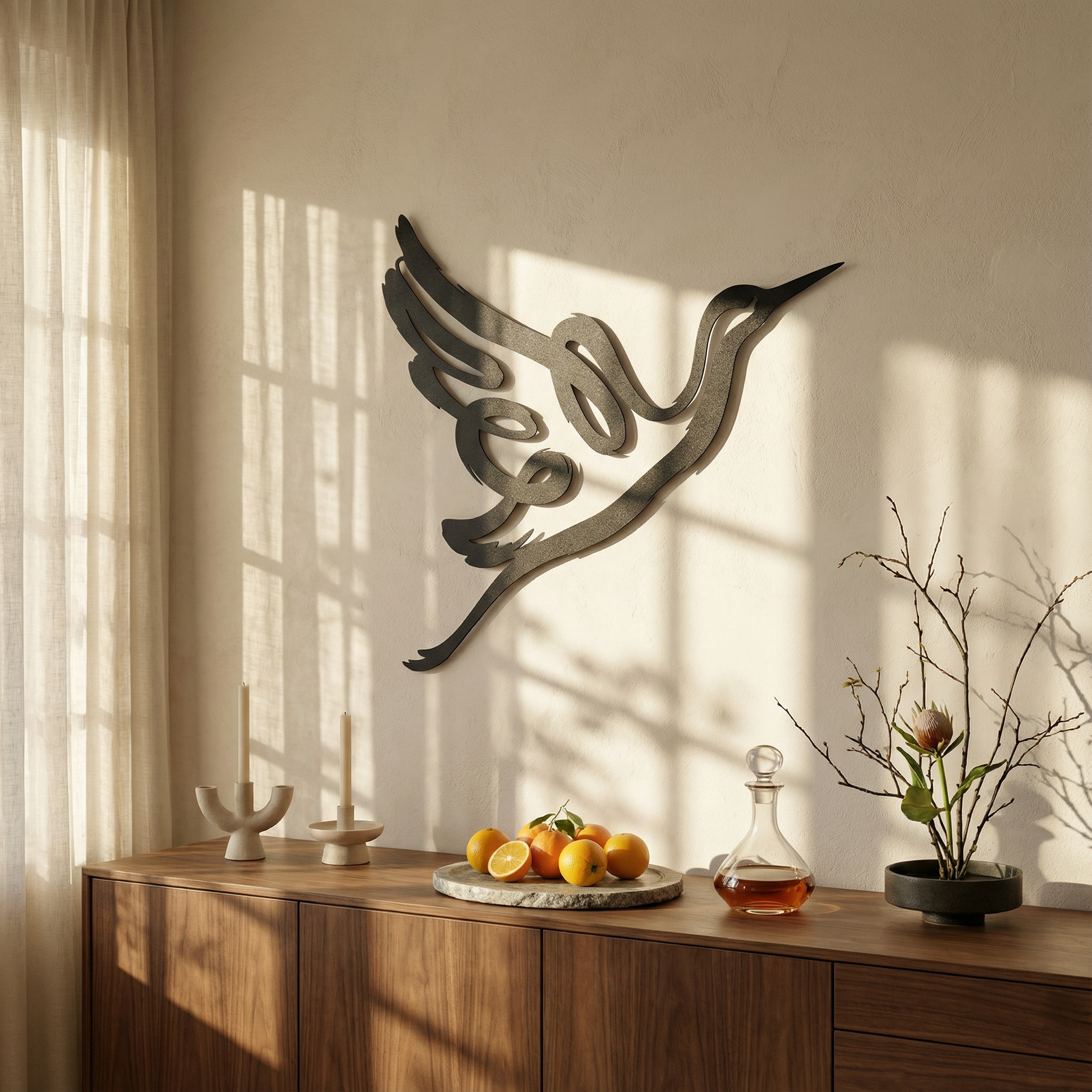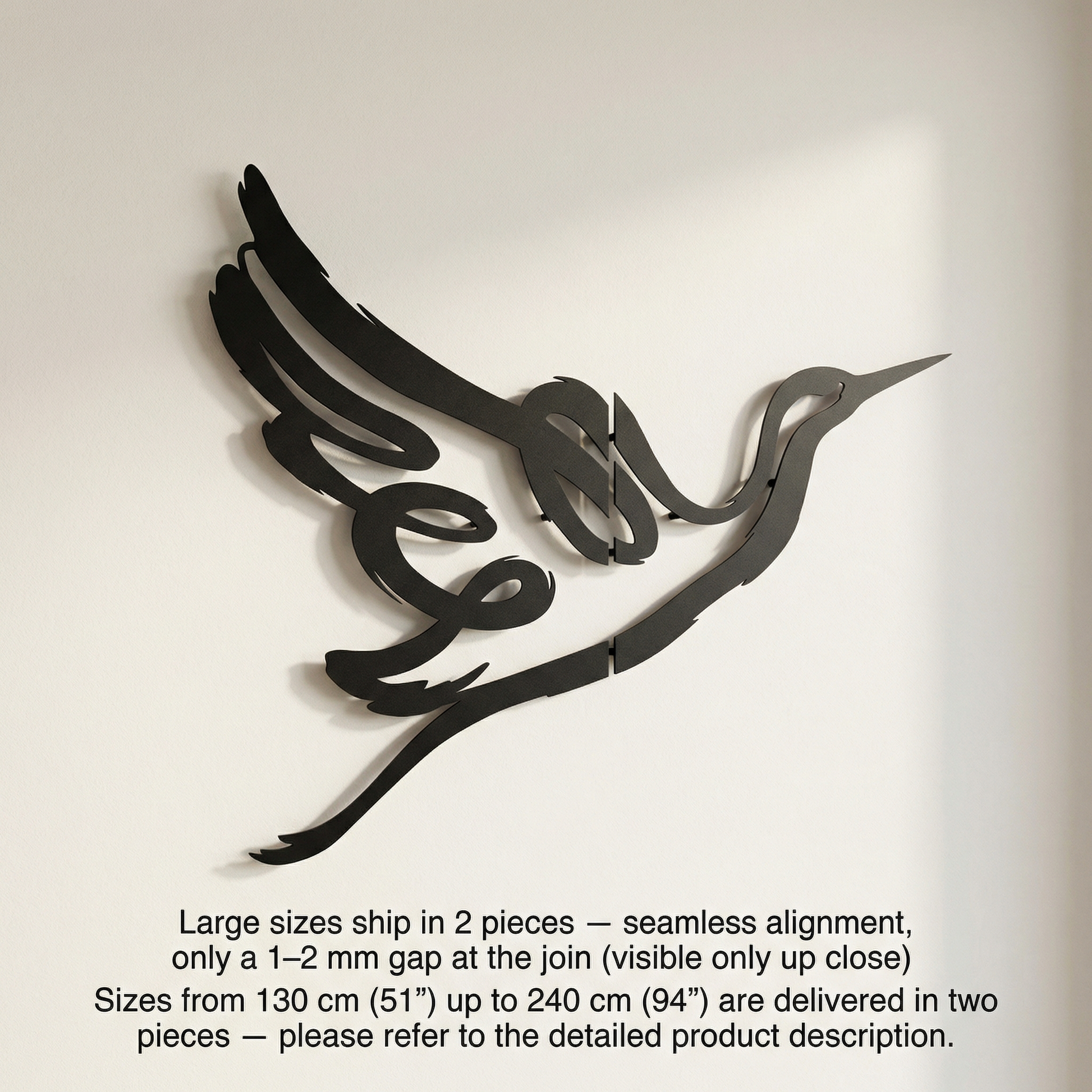 In metal, the silhouette is translated through confident, thick contours that stay crisp at distance while preserving clean negative space within the wing and note forms. The extended curves are shaped to enhance the floating shadow effect, allowing the musical loop and beak line to cast a clear secondary outline as light shifts.