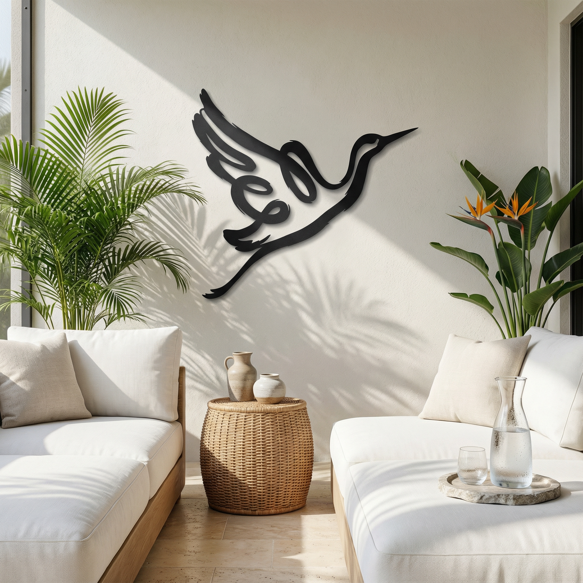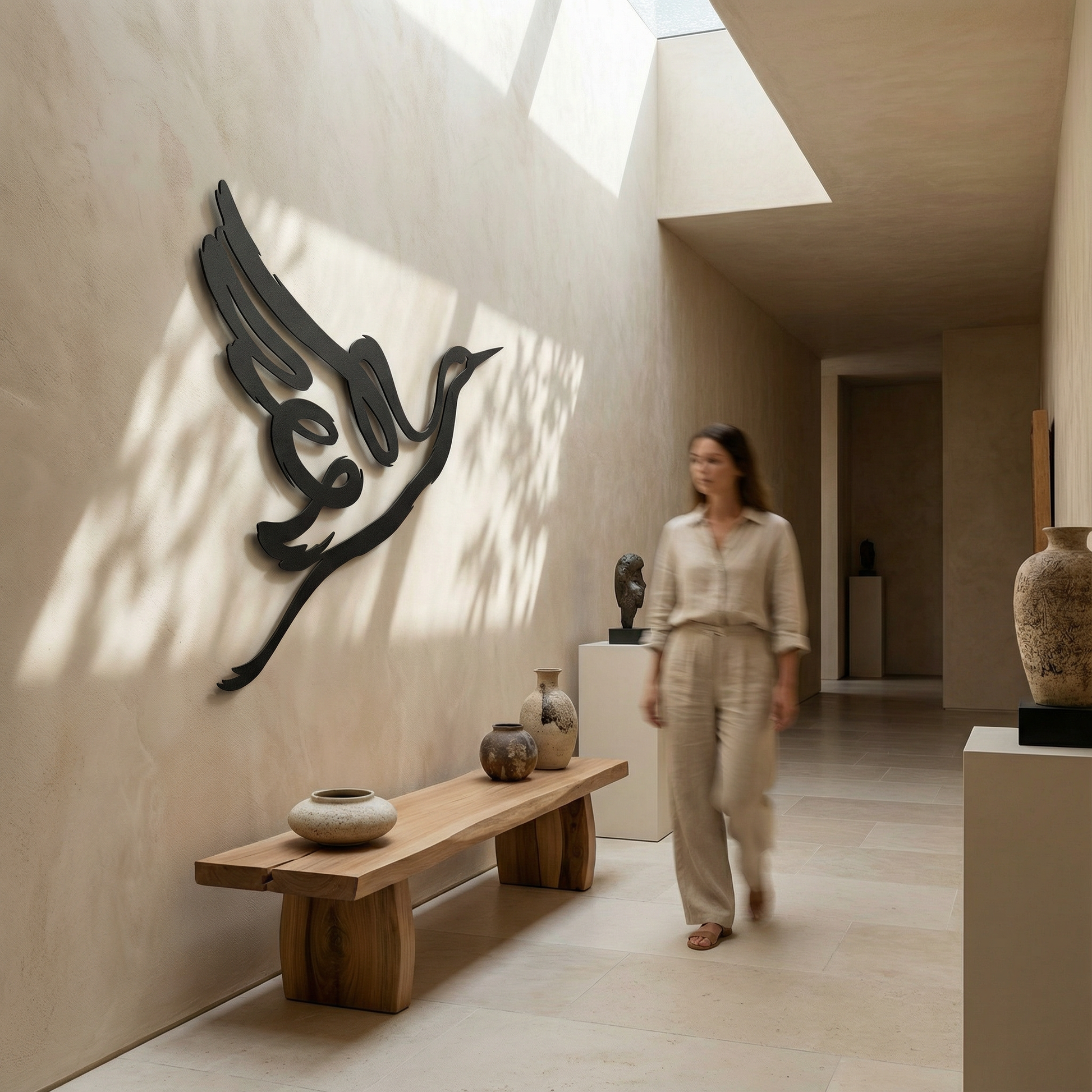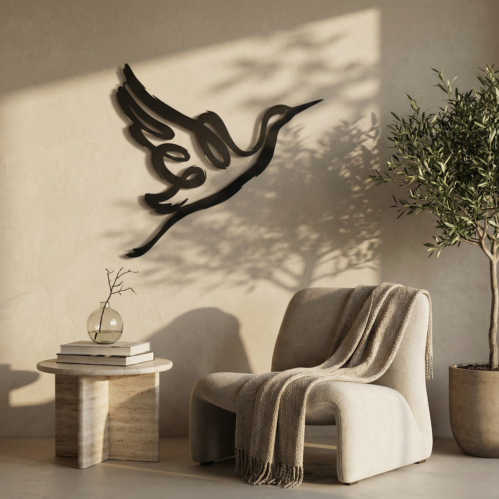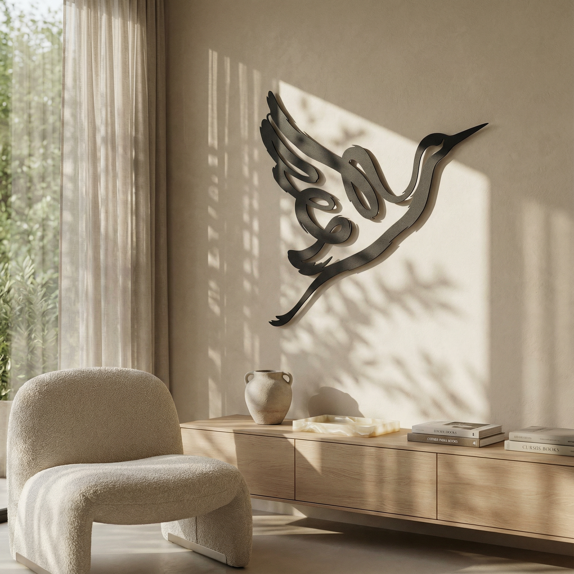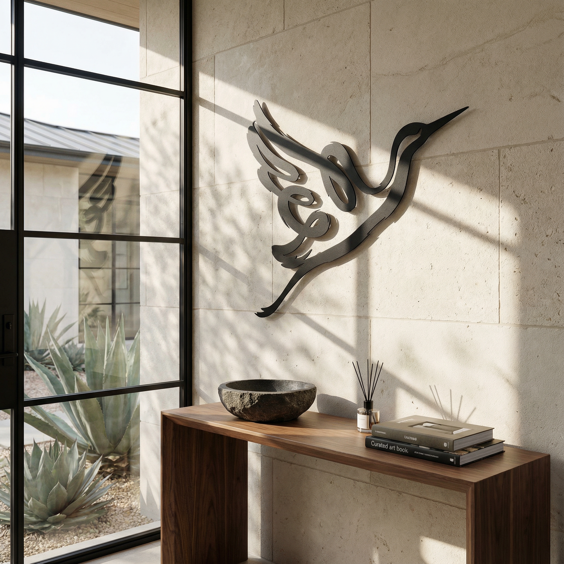 In metal, the silhouette is translated through confident, thick contours that stay crisp at distance while preserving clean negative space within the wing and note forms. The extended curves are shaped to enhance the floating shadow effect, allowing the musical loop and beak line to cast a clear secondary outline as light shifts.