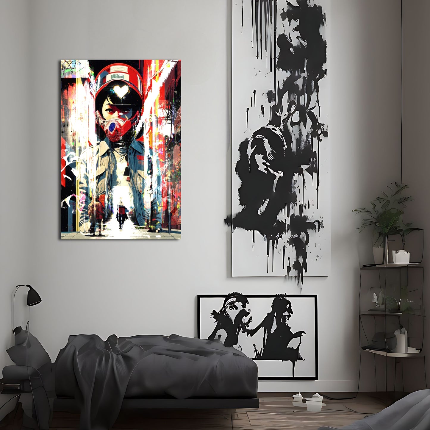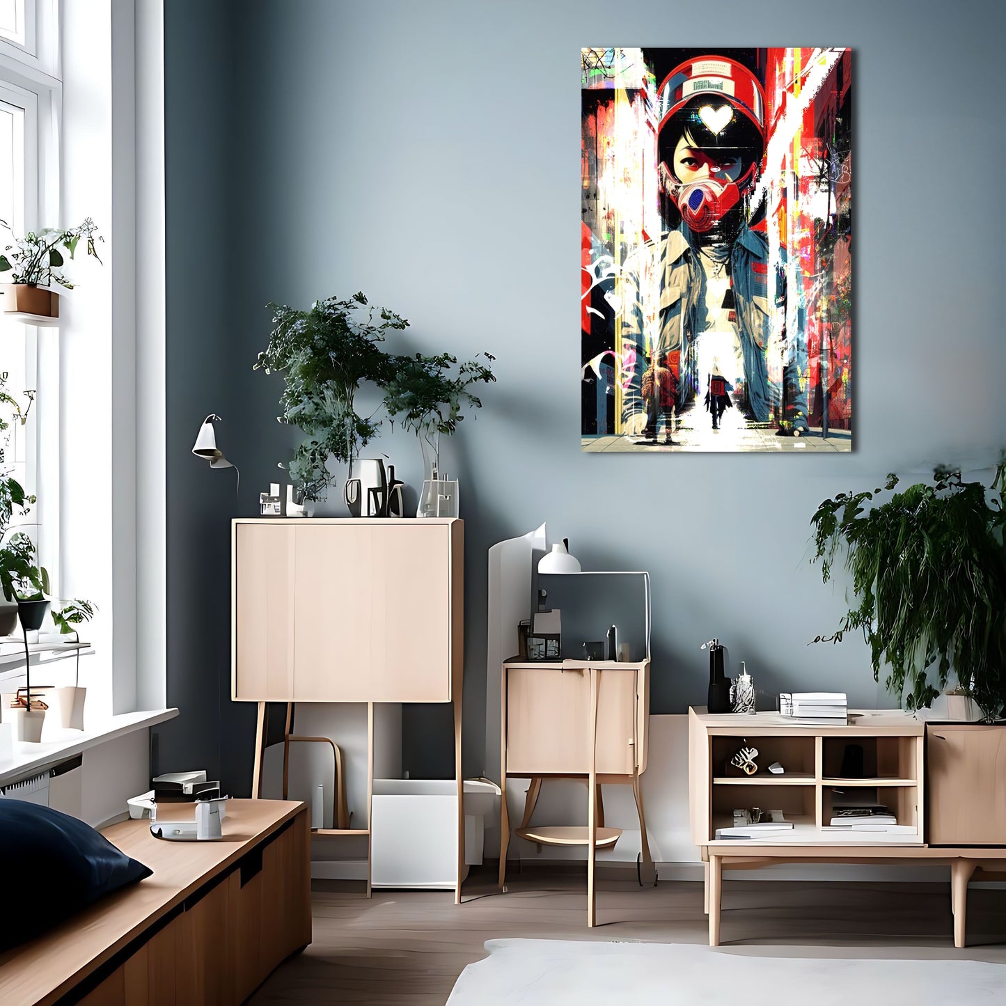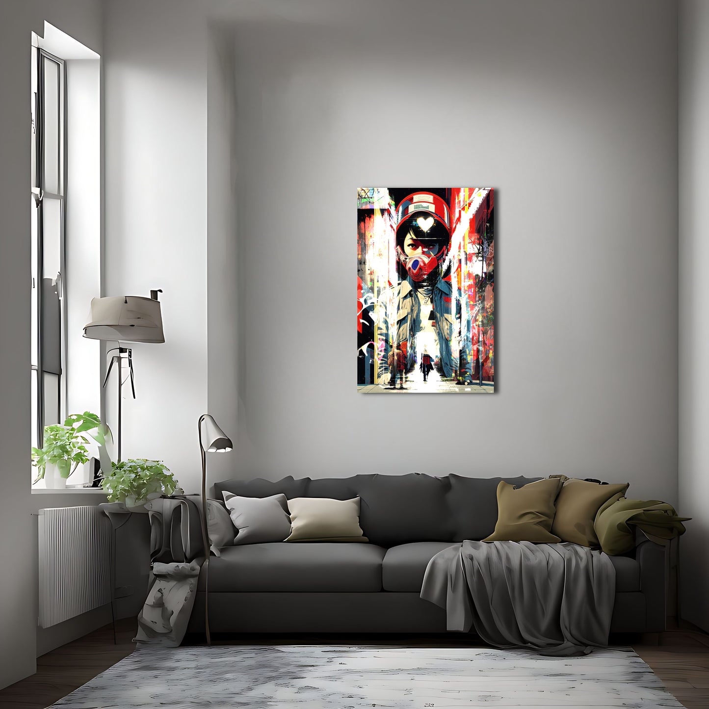 This striking piece of wall art depicts a lone figure on a motorcycle, decked out in cyberpunk-inspired gear and sporting a helmet. The digital artwork is inspired by Liam Wong's stunning street photography and incorporates elements of trash polka and graffiti style art. The bold red and blue color scheme gives the piece a dynamic feel and adds to the overall sense of energy and movement. This metal poster is sure to make a statement in any room and is perfect for fans of cyberpunk and street art