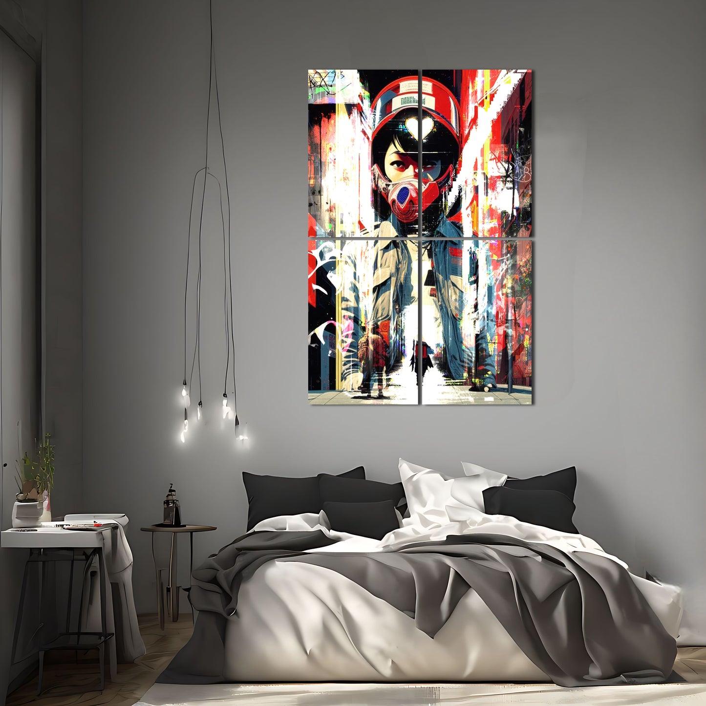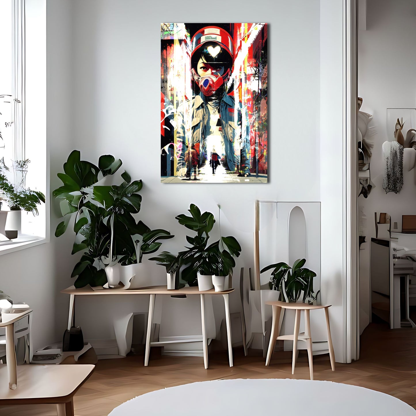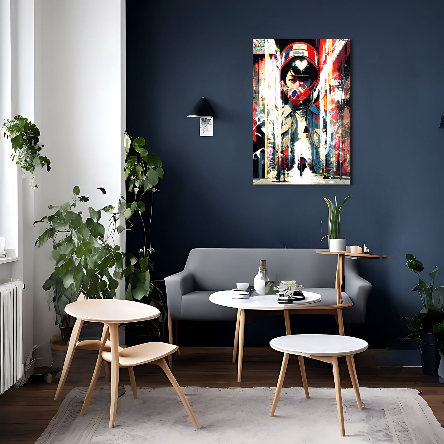 This striking piece of wall art depicts a lone figure on a motorcycle, decked out in cyberpunk-inspired gear and sporting a helmet. The digital artwork is inspired by Liam Wong's stunning street photography and incorporates elements of trash polka and graffiti style art. The bold red and blue color scheme gives the piece a dynamic feel and adds to the overall sense of energy and movement. This metal poster is sure to make a statement in any room and is perfect for fans of cyberpunk and street art