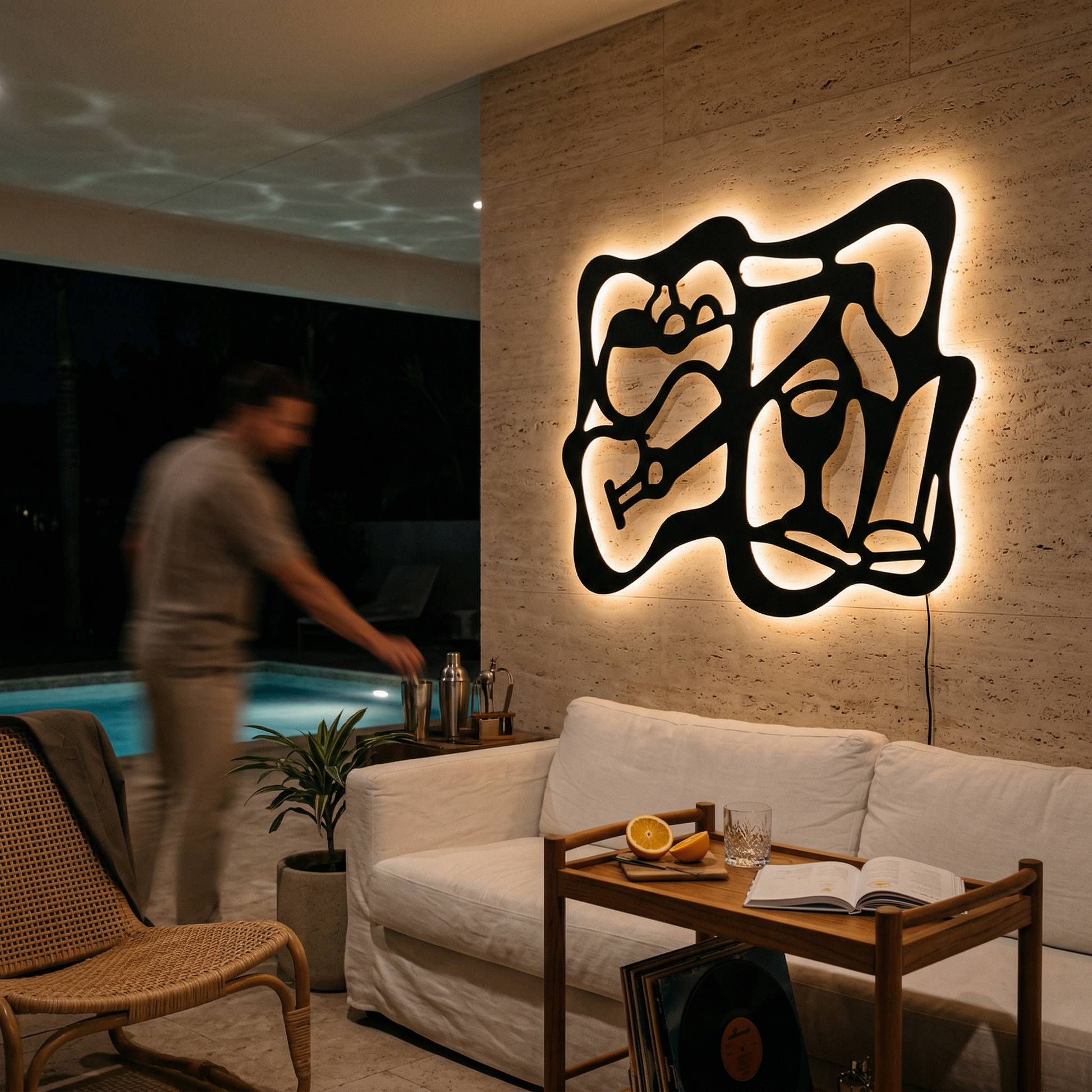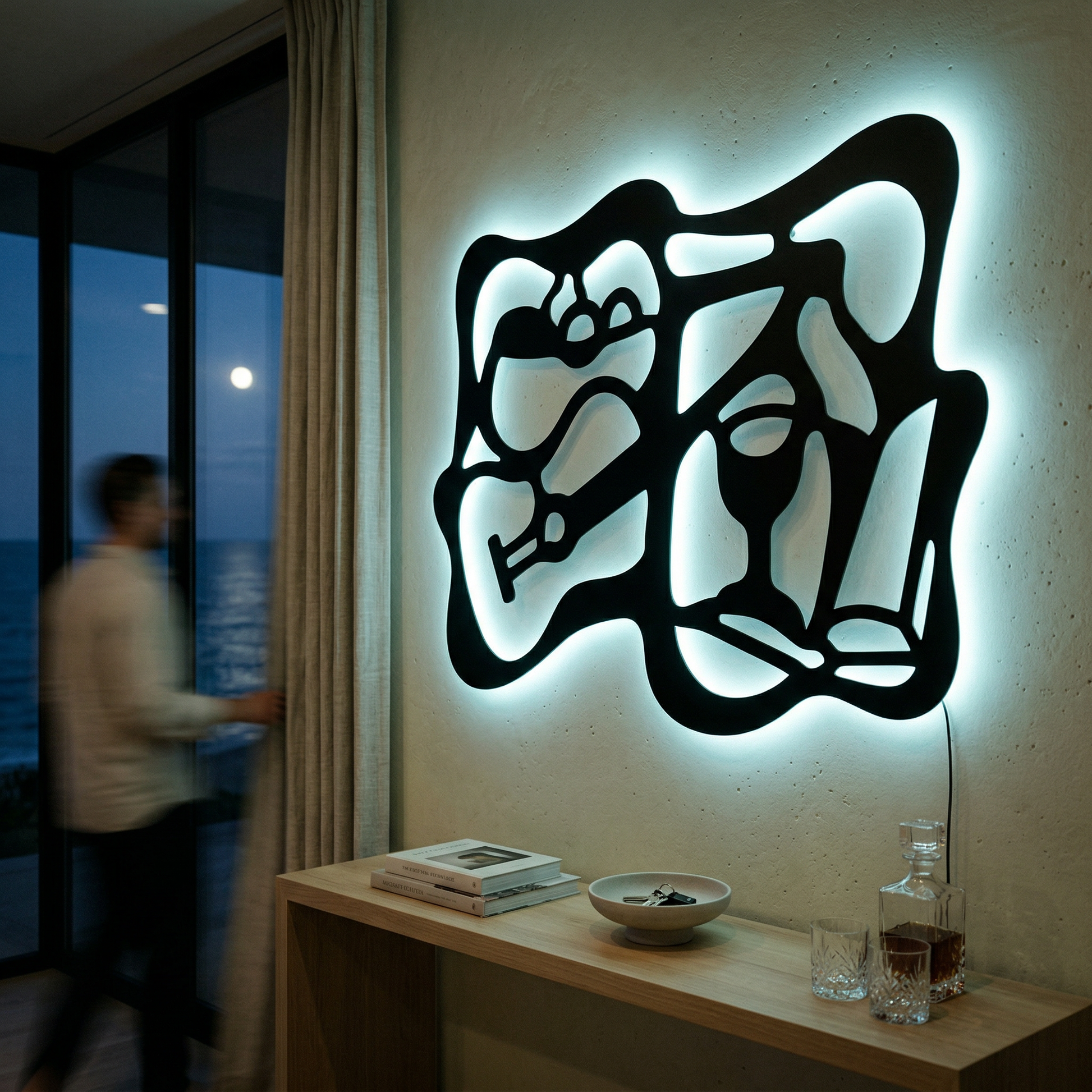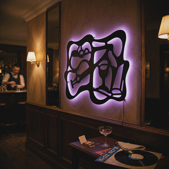 Bold metal ribbons define the figures while generous cutouts do the storytelling, turning negative space into cheeks, lids, and lips. As the piece sits off the wall, the outline casts a soft halo of shadow that shifts with ambient light and creates a floating, gallery-like presence.
