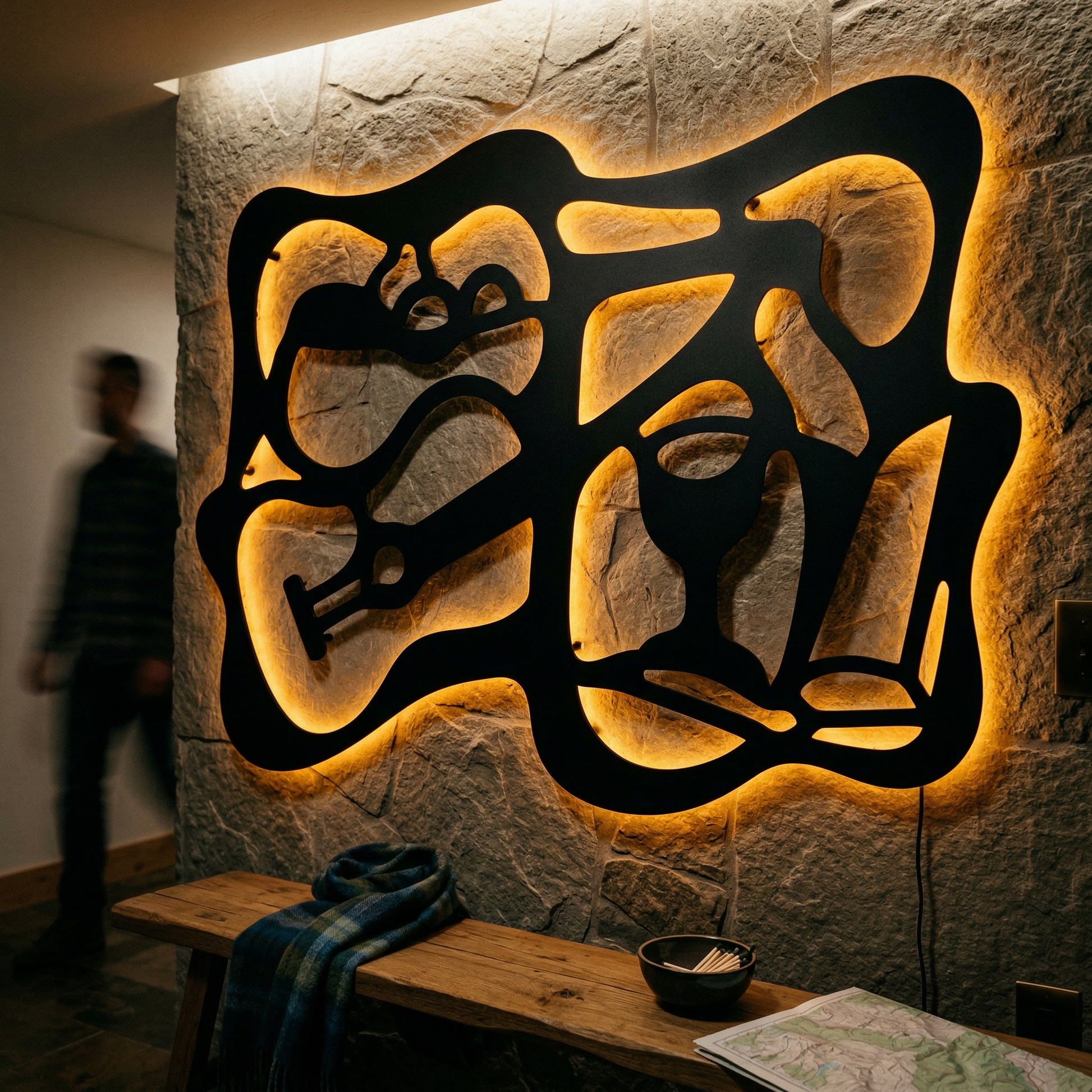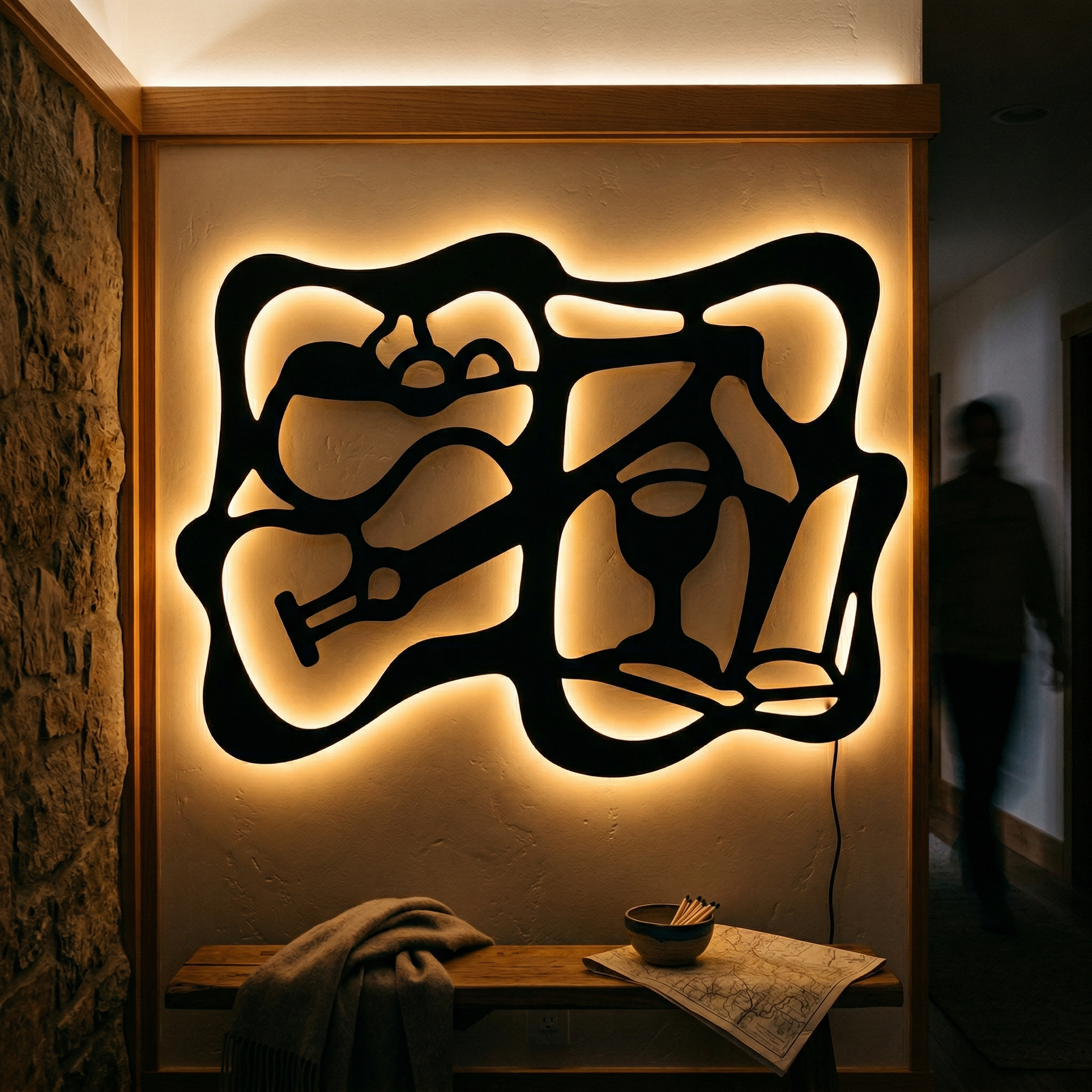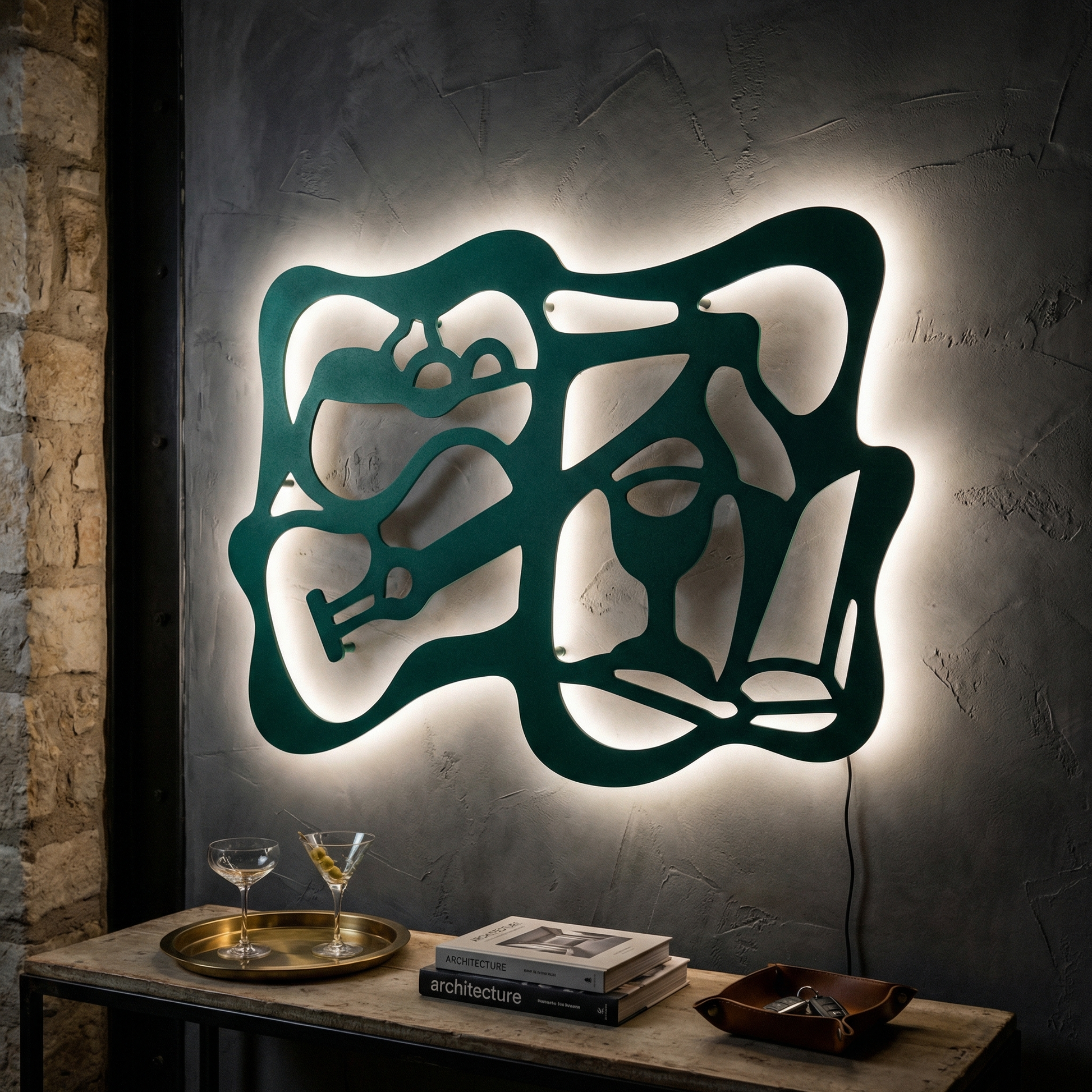 Bold metal ribbons define the figures while generous cutouts do the storytelling, turning negative space into cheeks, lids, and lips. As the piece sits off the wall, the outline casts a soft halo of shadow that shifts with ambient light and creates a floating, gallery-like presence.