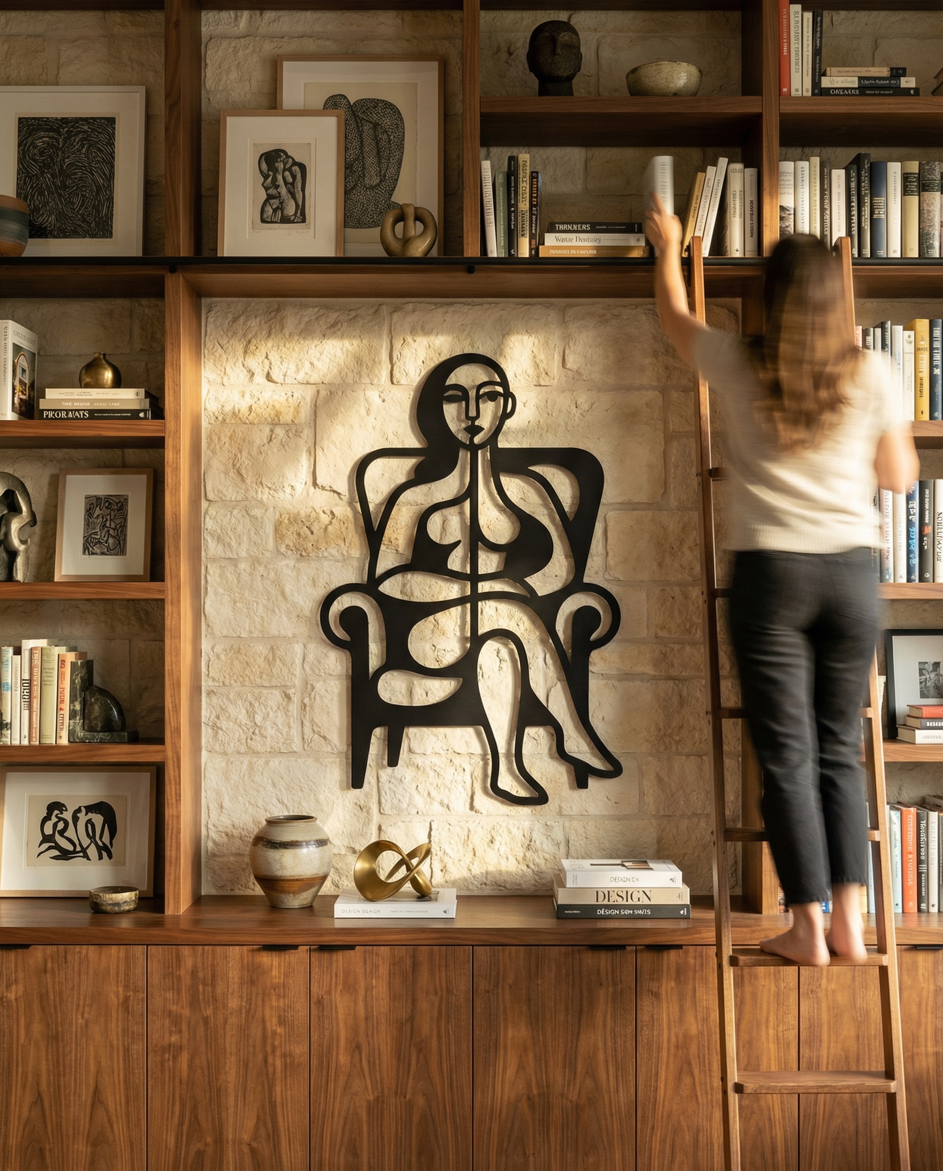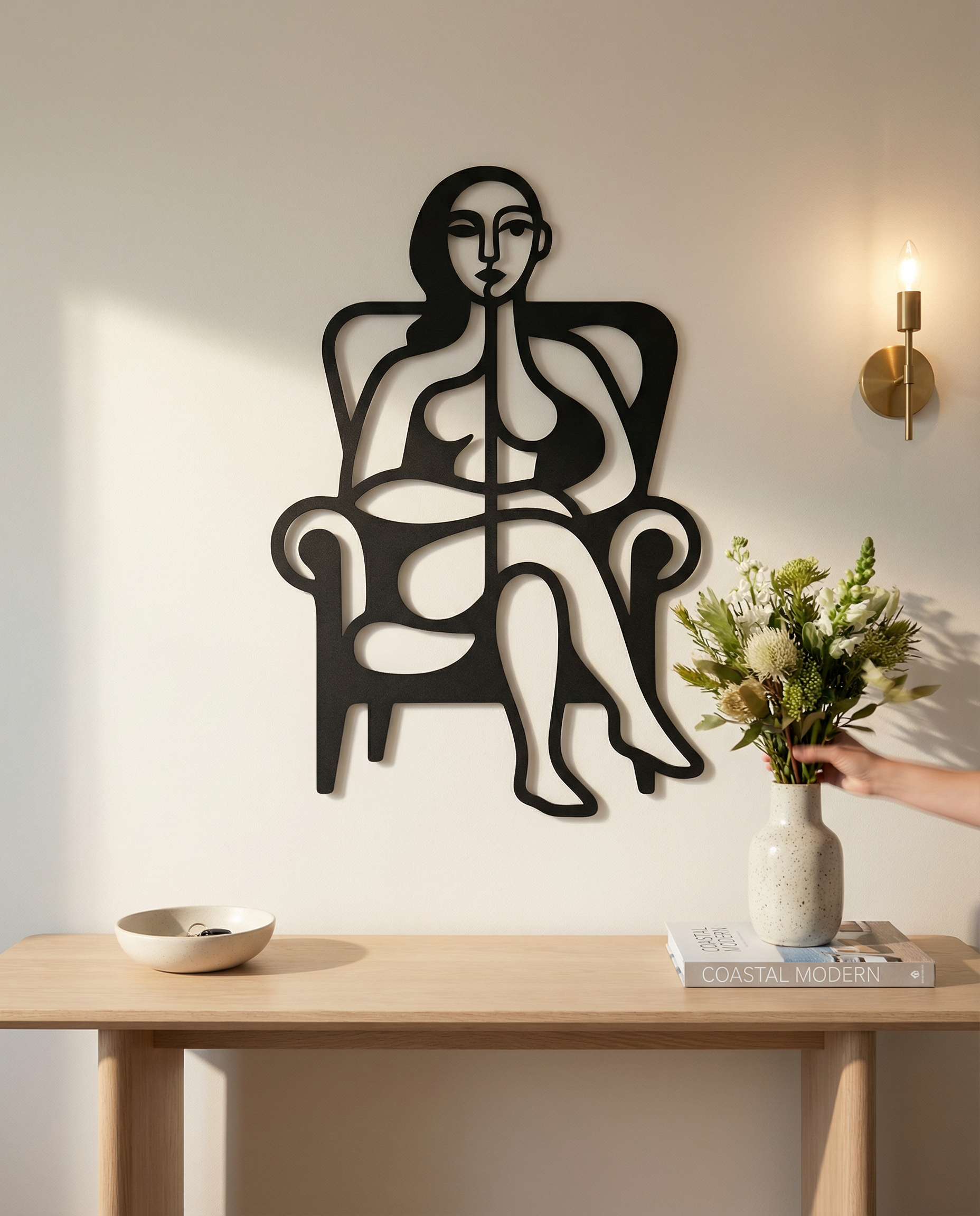 Bold metal contours carve the chair and body into clean, connected shapes, letting open wall space complete the forms. Negative space becomes the light within the composition, and the offset mounting creates a floating shadow effect that adds depth behind the silhouette.